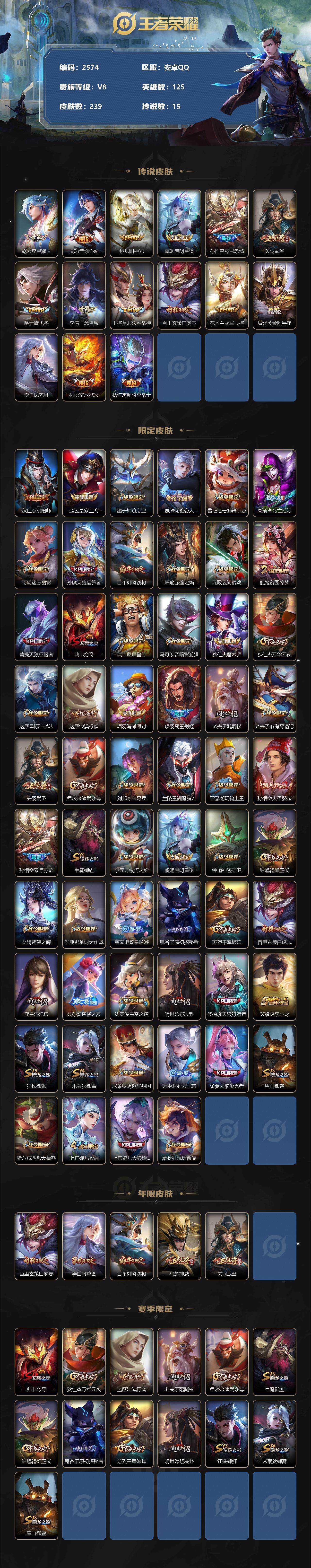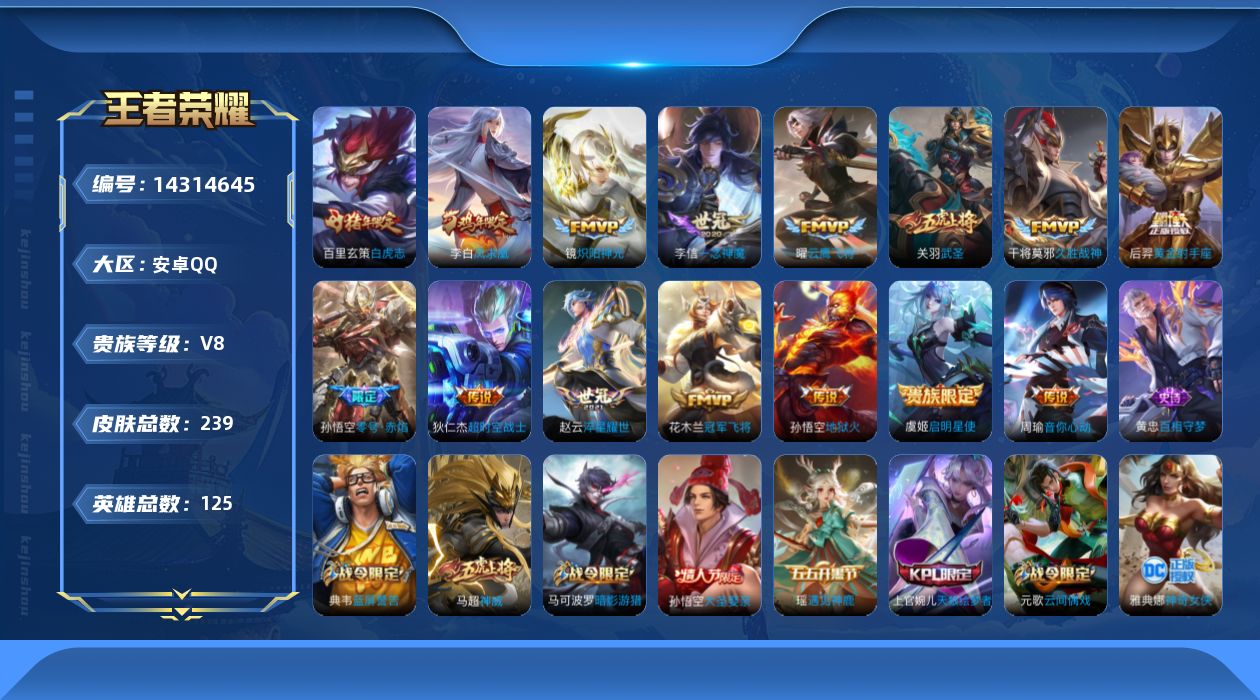 [14314645]安卓q-v4-永恒钻石iv段位-125英雄-239皮肤-0典藏-0珍品无双-0无双-0珍品传说-15传说-55史诗 【英雄全皮】:影全皮 【传说皮肤】:赵云淬星耀世,周瑜音你心动,镜炽阳神光,虞姬启明星使,孙悟空零号赤焰,关羽武圣,曜云鹰飞将,李信一念神魔,干将莫邪久胜战神,百里玄策白虎志,花木兰冠军飞将,后羿黄金射手座,李白凤求凰,孙悟空地狱火,狄仁杰超时空战士 【限定皮肤】:狄仁杰阴阳师,赵云皇家上将,墨子神迹守卫,嬴政优雅恋人,鲁班七号狮舞东方,高渐离死亡摇滚,阿轲迷踪丽影,孙膑天狼运算者,吕布御风骁将,周瑜赤莲之焰,元歌云间偶戏,甄姬游园惊梦,曹操天狼征服者,典韦穷奇,典韦蓝屏警告,马可波罗暗影游猎,狄仁杰魔术师,狄仁杰万华元夜,达摩星际陆战队,达摩沙漠行僧,项羽海滩派对,项羽霸王别姬,老夫子醍醐杖,老夫子航海奇遇记,关羽武圣,程咬金演武夺筹,刘邦夺宝奇兵,兰陵王驯魔猎人,亚瑟潮玩骑士王,孙悟空大圣娶亲,孙悟空零号赤焰,牛魔御旌,李元芳银河之约,虞姬启明星使,钟馗神迹守卫,钟馗驱傩正仪,女娲朔望之晖,雅典娜单词大作战,蔡文姬繁星吟游,鬼谷子原初探秘者,苏烈千军破阵,百里玄策白虎志,弈星混沌棋,公孙离蜜橘之夏,沈梦溪星空之诺,明世隐疑决卦,裴擒虎天狼狩猎者,裴擒虎李小龙,狂铁御狮,米莱狄御霄,米莱狄胡桃异想国,云中君纤云弄巧,伽罗天狼溯光者,盾山御銮,猪八戒西部大镖客,上官婉儿梁祝,上官婉儿天狼绘梦者,蒙犽狂想玩偶喵 【年限皮肤】:百里玄策白虎志,李白凤求凰,吕布御风骁将,马超神威,关羽武圣 【赛季限定】:典韦穷奇,狄仁杰万华元夜,达摩沙漠行僧,老夫子醍醐杖,程咬金演武夺筹,牛魔御旌,钟馗驱傩正仪,鬼谷子原初探秘者,苏烈千军破阵,弈星混沌棋,明世隐疑决卦,狂铁御狮,米莱狄御霄,盾山御銮 【战令限定】:墨子神迹守卫,鲁班七号狮舞东方,阿轲迷踪丽影,周瑜赤莲之焰,元歌云间偶戏,典韦蓝屏警告,马可波罗暗影游猎,达摩星际陆战队,老夫子航海奇遇记,刘邦夺宝奇兵,兰陵王驯魔猎人,亚瑟潮玩骑士王,李元芳银河之约,钟馗神迹守卫,女娲朔望之晖,雅典娜单词大作战,沈梦溪星空之诺,米莱狄胡桃异想国,猪八戒西部大镖客,蒙犽狂想玩偶喵 【史诗皮肤】:鲁班七号电玩小子,露娜紫霞仙子,赵云皇家上将,王昭君偶像歌手,狄仁杰魔术师,宫本武藏鬼剑武藏,嬴政优雅恋人,嬴政暗夜贵公子,妲己魅力维加