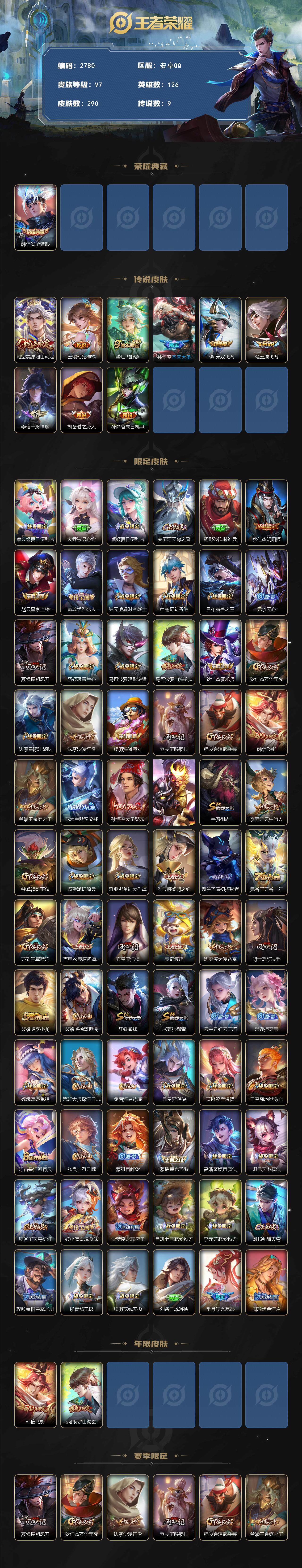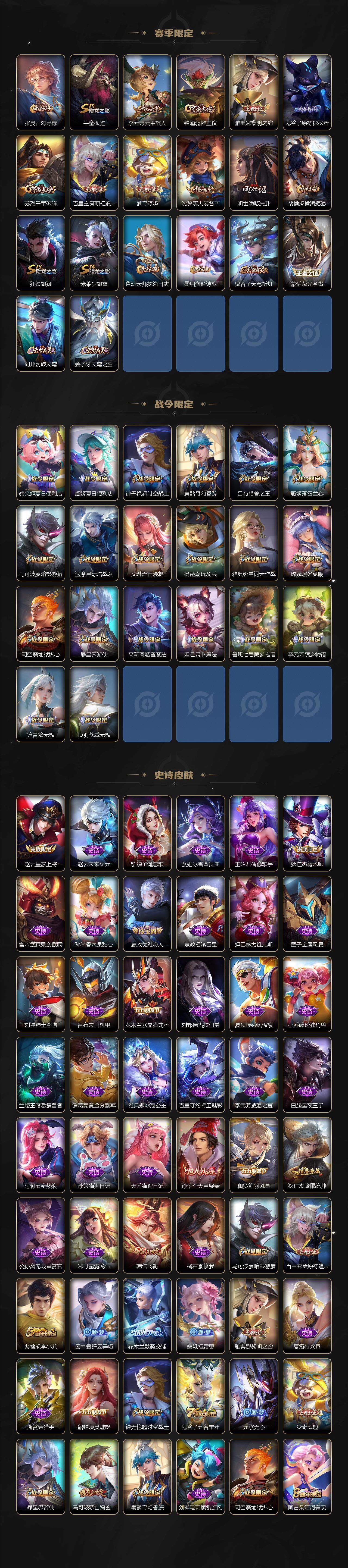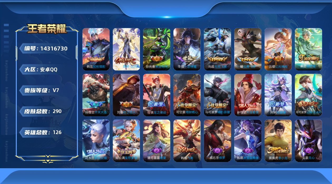 [14316730]安卓q-v1-尊贵铂金i段位-126英雄-290皮肤-1典藏-0珍品无双-0无双-0珍品传说-9传说-67史诗 【英雄全皮】:蒙恬全皮,司空震全皮 【荣耀典藏】:韩信弑呛猎影 【传说皮肤】:司空震愿照山河定,云缨幻光神呛,桑启鸣野蒿,孙悟空齐天大圣,马超无双飞将,曜云鹰飞将,李信一念神魔,刘备时之恋人,孙尚香末日机甲 【限定皮肤】:蔡文姬夏日便利店,大乔绒语心约,虞姬夏日便利店,姜子牙天穹之誓,杨戬破阵退雄兵,狄仁杰阴阳师,赵云皇家上将,嬴政优雅恋人,钟无艳超时空战士,扁鹊奇幻香踪,吕布猎兽之王,元歌无心,夏侯惇朔风刀,甄姬落雪兰心,马可波罗暗影游猎,马可波罗山海玄木吟,狄仁杰魔术师,狄仁杰万华元夜,达摩星际陆战队,达摩沙漠行僧,项羽海滩派对,老夫子醍醐杖,程咬金演武夺筹,韩信飞衡,兰陵王金庭之子,花木兰默契交锋,孙悟空大圣娶亲,孙悟空齐天大圣,牛魔御旌,李元芳云中旅人,钟馗驱傩正仪,杨戬潮玩骑兵,雅典娜单词大作战,雅典娜黎明之约,鬼谷子原初探秘者,鬼谷子五谷丰年,苏烈千军破阵,百里玄策原初追逐者,弈星混沌棋,梦奇顽趣,沈梦溪大漠名商,明世隐疑决卦,裴擒虎李小龙,裴擒虎擒涛扼浪,狂铁御狮,米莱狄御霄,云中君纤云弄巧,嫦娥拒霜思,嫦娥暖冬兔眠,鲁班大师探海日志,桑启海盐诗旅,暃星界游侠,艾琳流音漫舞,司空震地狱燃心,阿古朵江河有灵,张良古海寻踪,蒙犽百解令,蒙恬荣光圣徽,高渐离燃音魔法,妲己灵卜魔法,鬼谷子天穹祈灯,姬小满妄想食味,沈梦溪龙舞盛年,鲁班七号蔬乡物语,李元芳蔬乡物语,刘邦剑破天穹,程咬金群星魔术团,镜青焰无极,项羽苍威无极,刘备异域游侠,芈月浮光幕影,周瑜熔金海岸 【年限皮肤】:韩信飞衡,马可波罗山海玄木吟 【赛季限定】:夏侯惇朔风刀,狄仁杰万华元夜,达摩沙漠行僧,老夫子醍醐杖,程咬金演武夺筹,兰陵王金庭之子,张良古海寻踪,牛魔御旌,李元芳云中旅人,钟馗驱傩正仪,雅典娜黎明之约,鬼谷子原初探秘者,苏烈千军破阵,百里玄策原初追逐者,弈星混沌棋,梦奇顽趣,沈梦溪大漠名商,明世隐疑决卦,裴擒虎擒涛扼浪,狂铁御狮,米莱狄御霄,鲁班大师探海日志,桑启海盐诗旅,鬼谷子天穹祈灯,蒙恬荣光圣徽,刘邦剑破天穹,姜子牙天穹之誓 【战令限定】:蔡文姬夏日便利店,虞姬夏日便利店,钟无艳超时空战士,扁鹊奇幻香踪,吕布猎兽之王,甄姬落雪兰心,马可波罗暗影游猎,达摩星际陆战队,艾琳