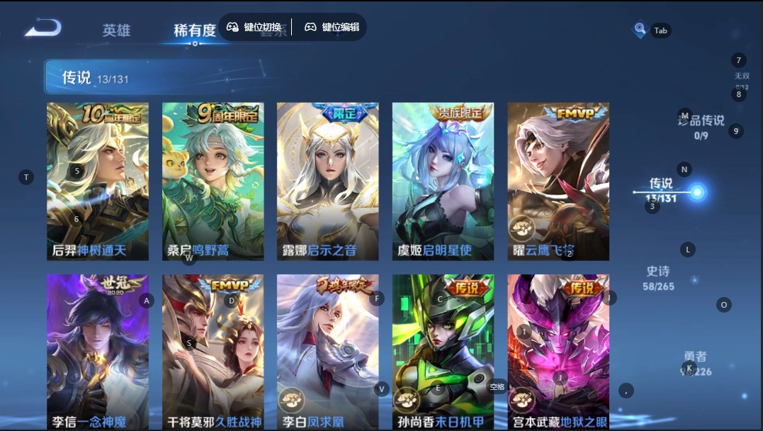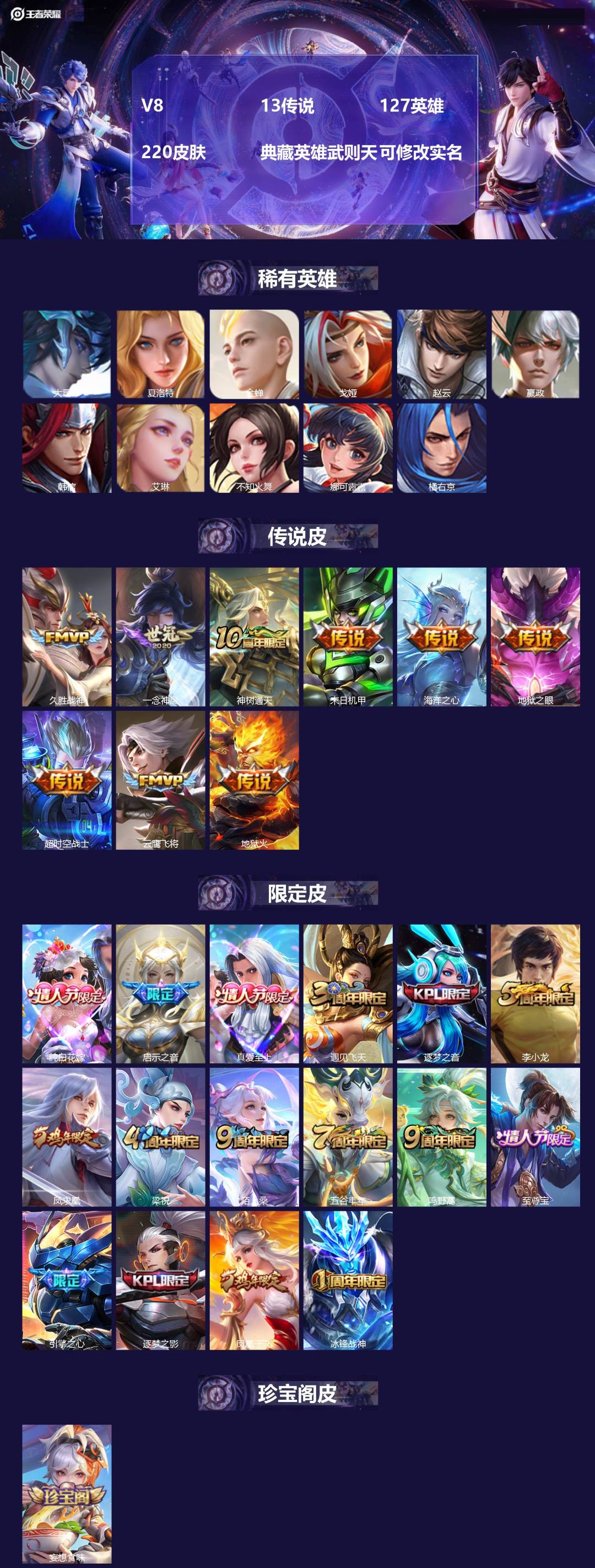 v8 13传说 127英雄 220皮肤 典藏英雄武则天 可修改实名 【稀有英雄】:大司命嬴政始皇帝韩信韩跳跳夏洛特夏师傅艾琳橘右京橘子娜可露露鸟人不知火舞赵云金蝉唐僧戈娅 【传说皮】:神树通天地狱火海洋之心地狱之眼末日机甲-孙尚香绿蚂蚱一念