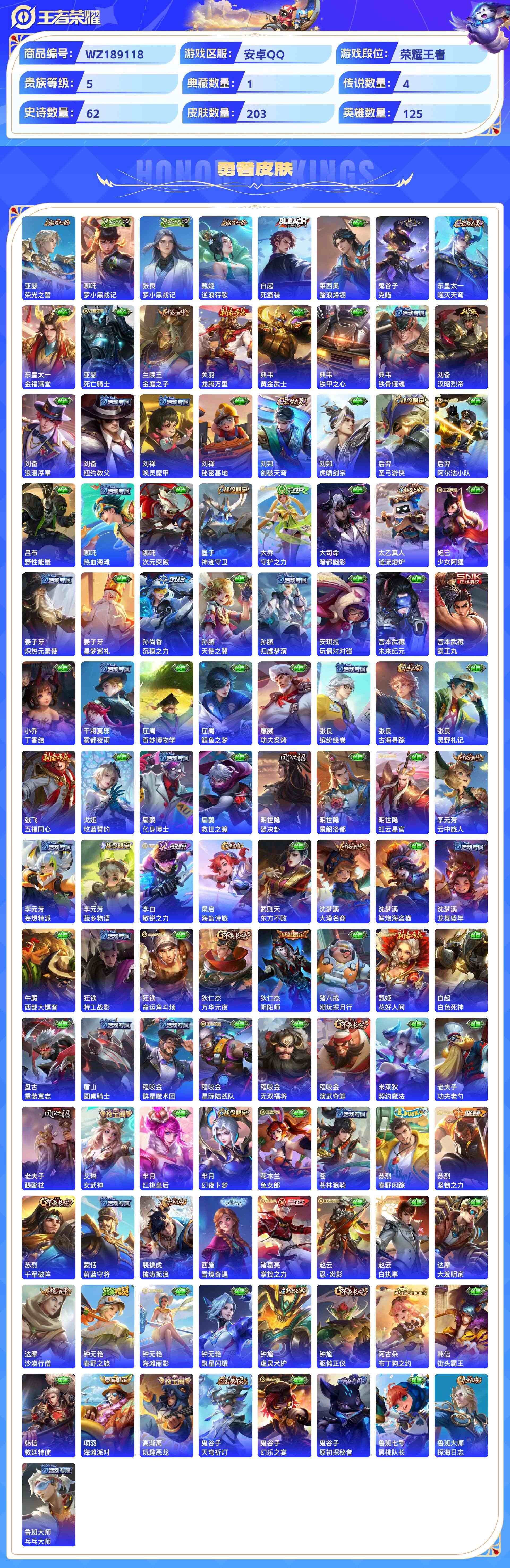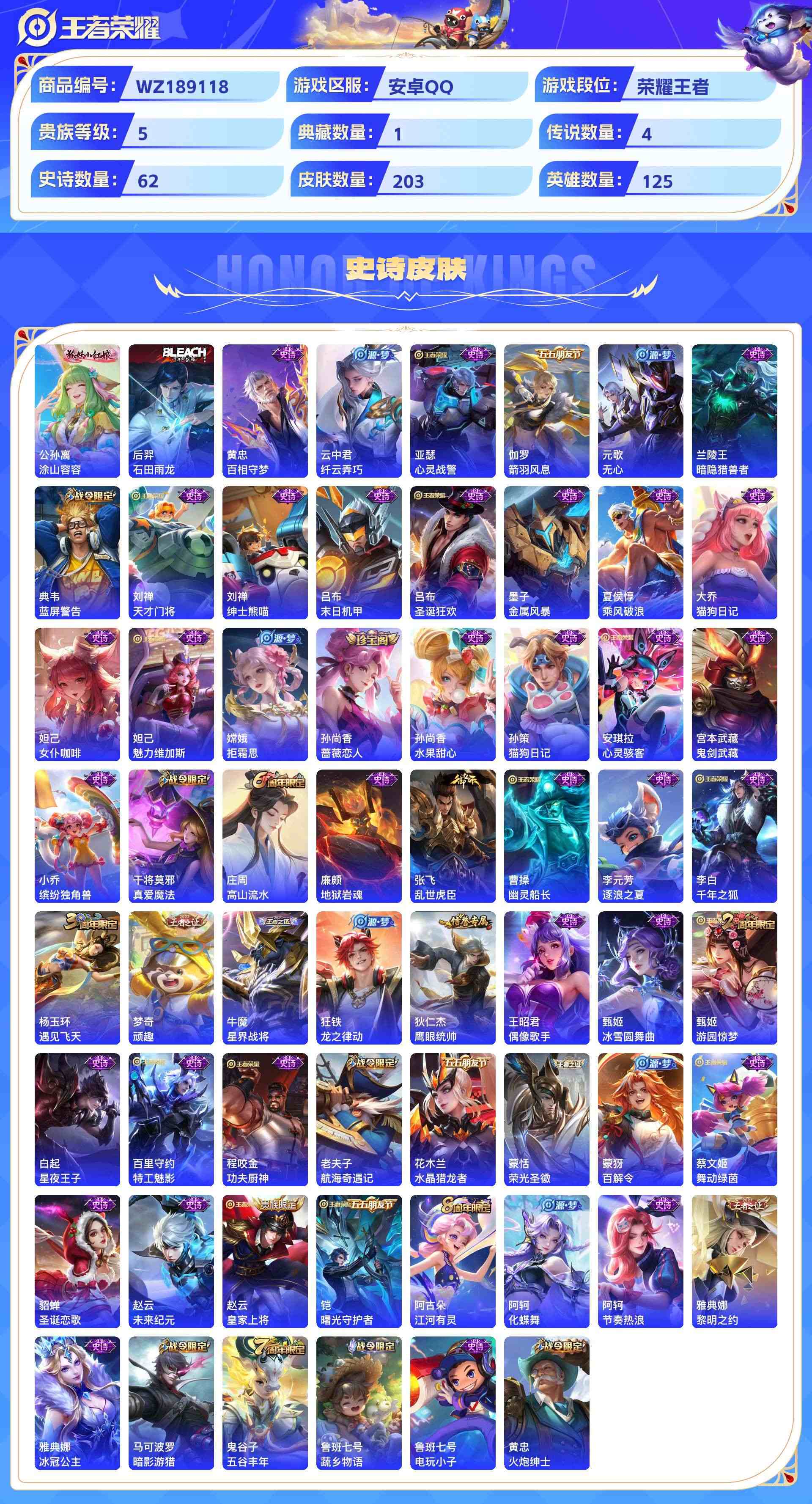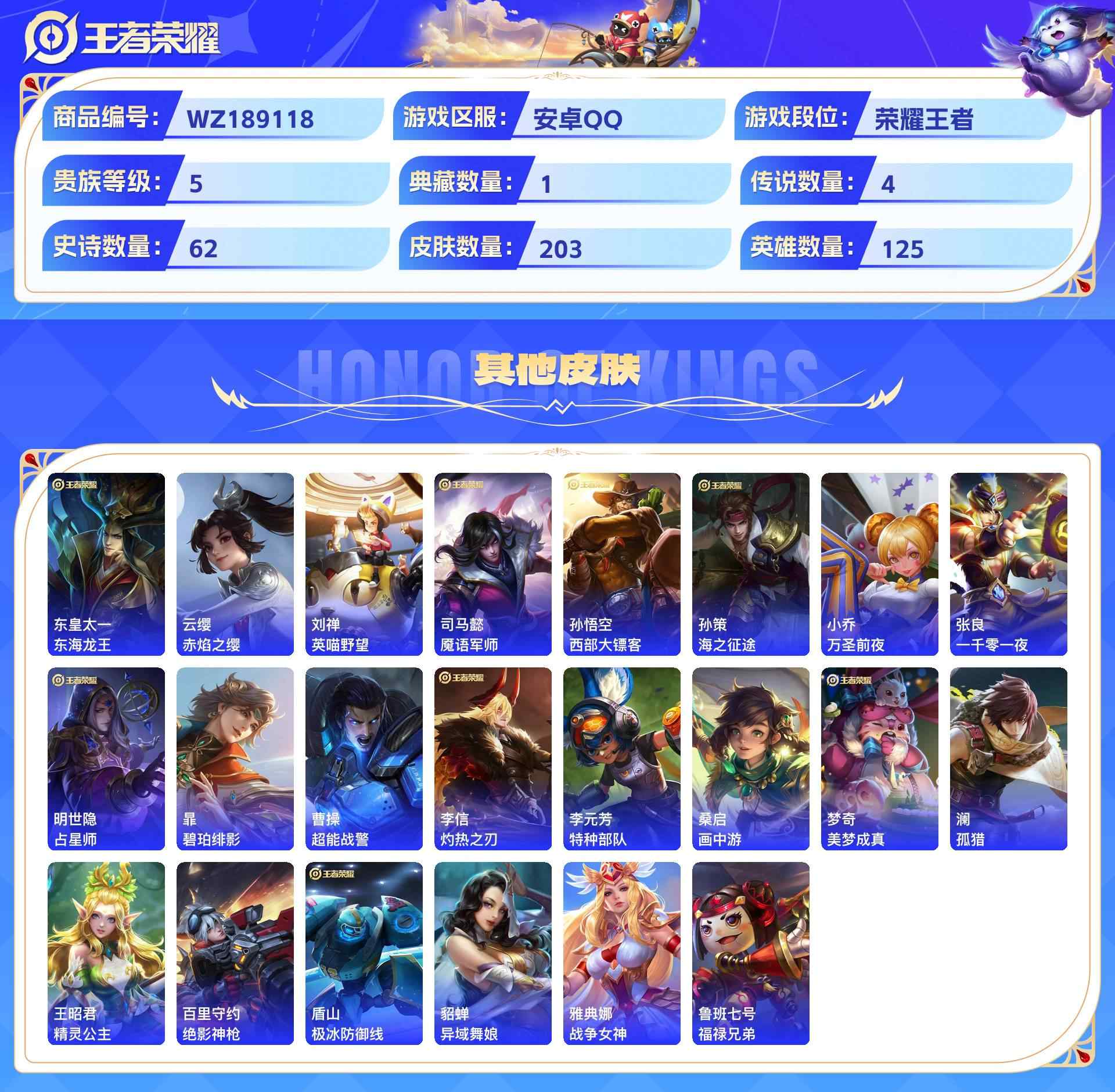 wz189118|精品号【荣耀典藏】无限飓风号【传说皮肤】黄金射手座零号·赤焰地狱之眼鸣野蒿安卓qq 贵族5级 203皮 1典藏 4传说 62史诗1星传说3个性按键1天幕