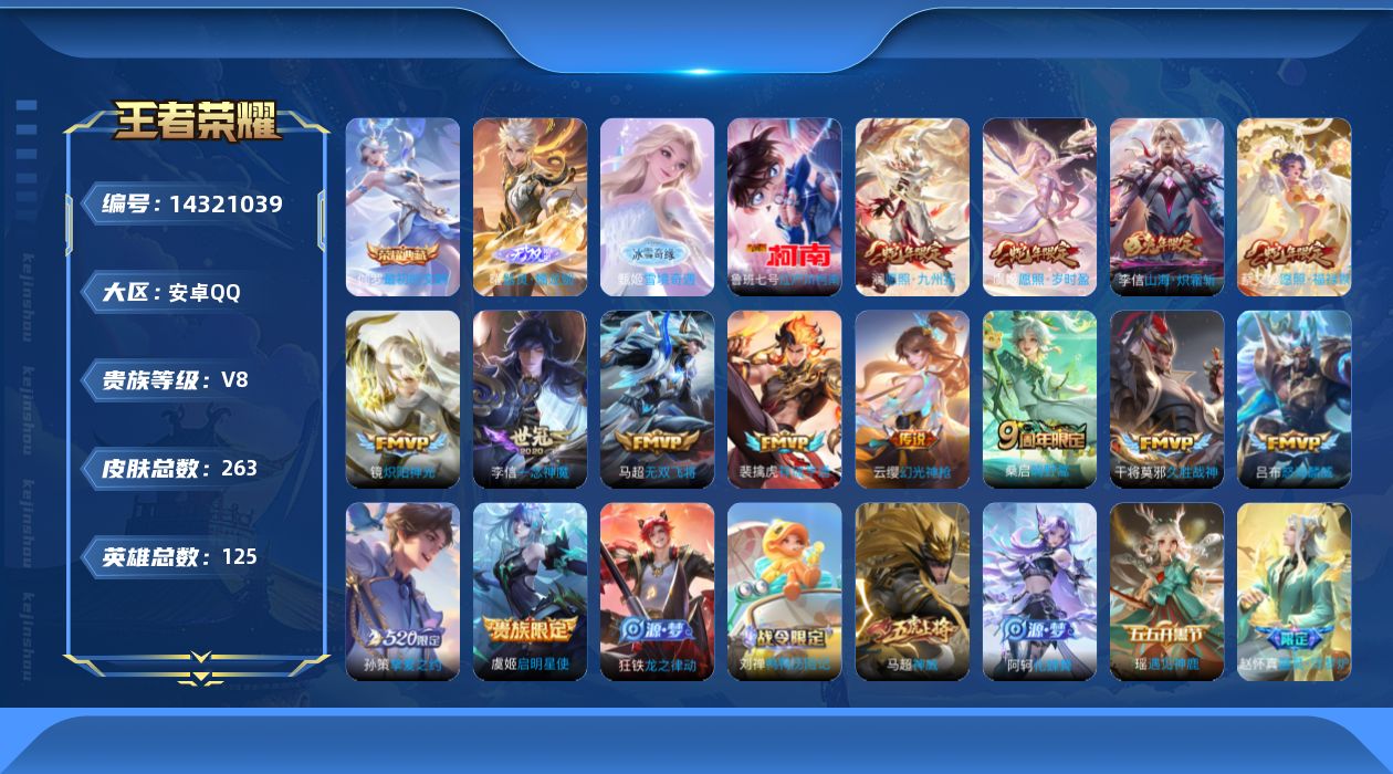 [14321039]贵族8-263皮-1典藏-14传说-2无双-1珍品传说-2全皮-改名卡6 安卓手q81区263皮1典藏14传说2无双1珍品传说v8 营地id353208253非凡王者【珍品传说皮肤】:江户川柯南【无双皮肤】:器灵·螭龙剑雪境奇遇【荣耀典藏】:最初的交响【优质限定皮肤】:无双飞将山海·炽霜斩神威【传说皮肤】:启明星使愿照·福禄聚愿照·岁时盈愿照·九州拓幻光神呛祥