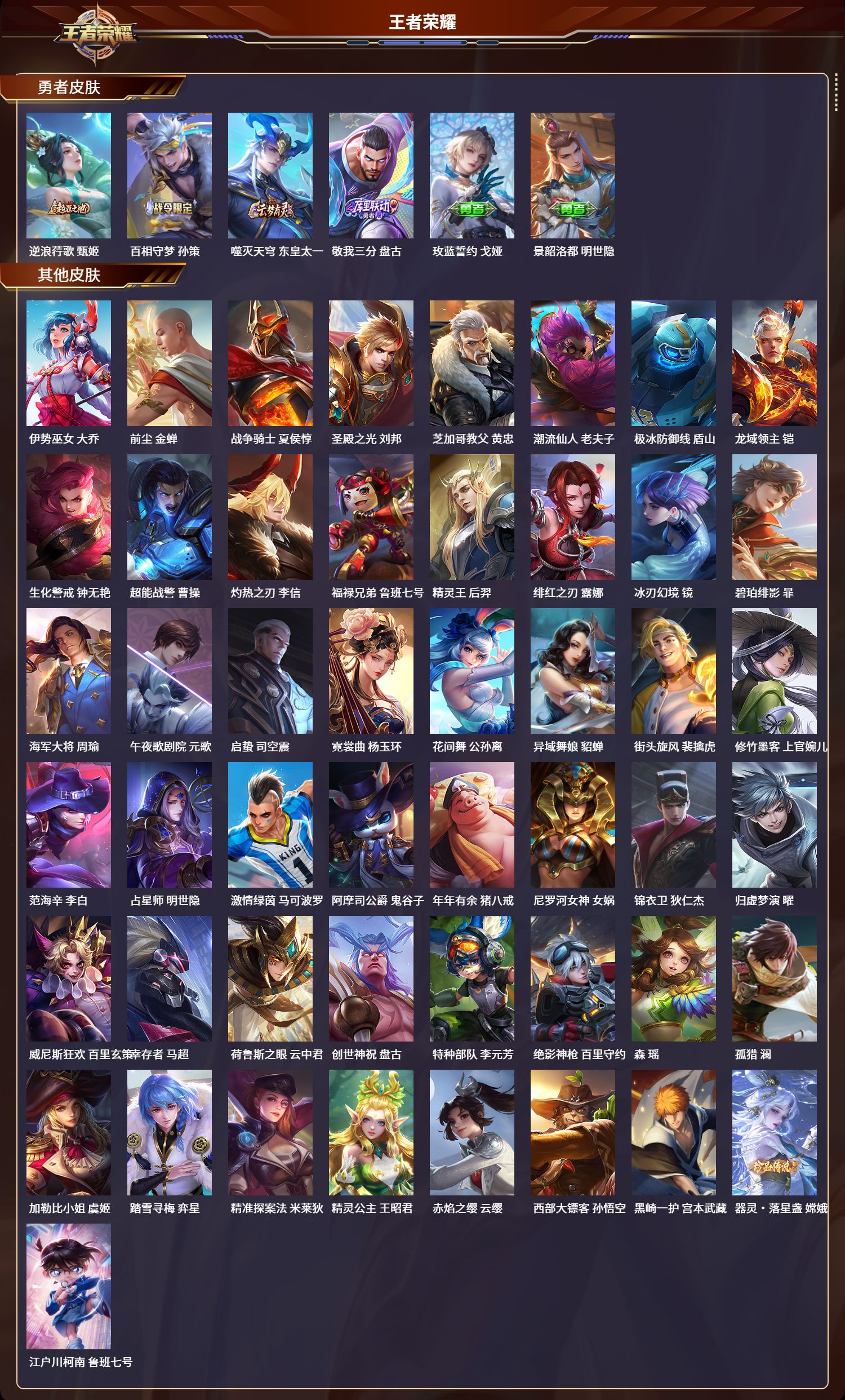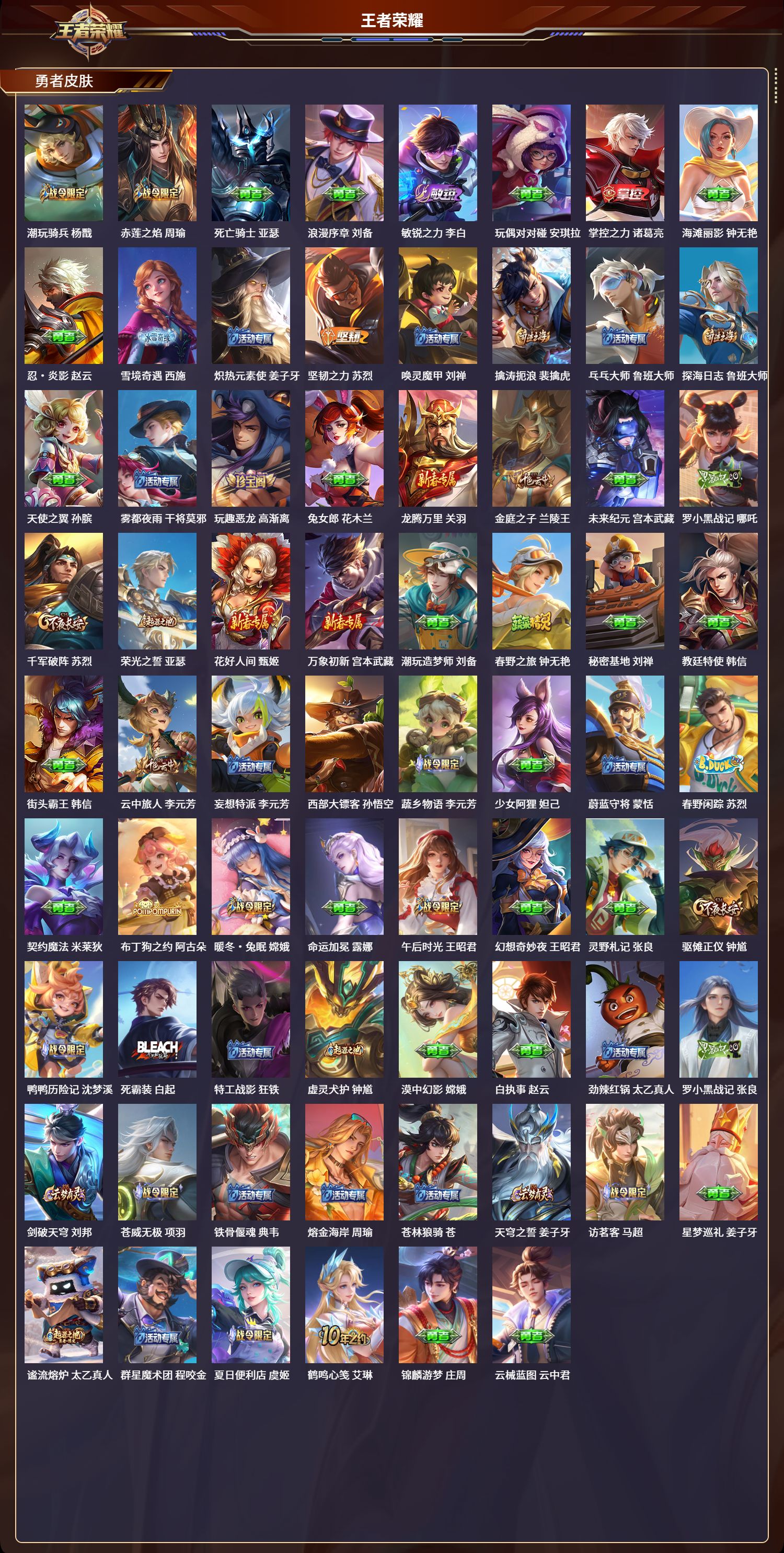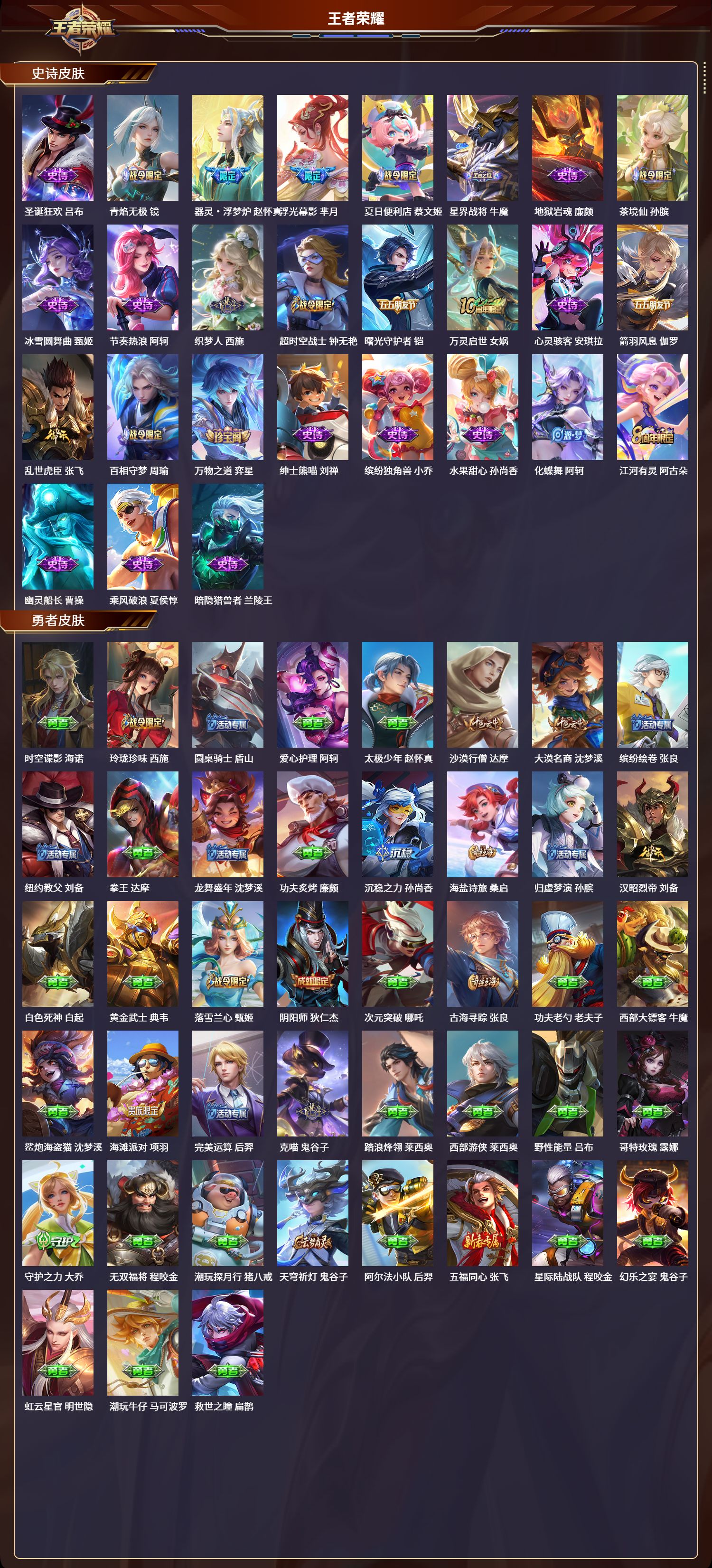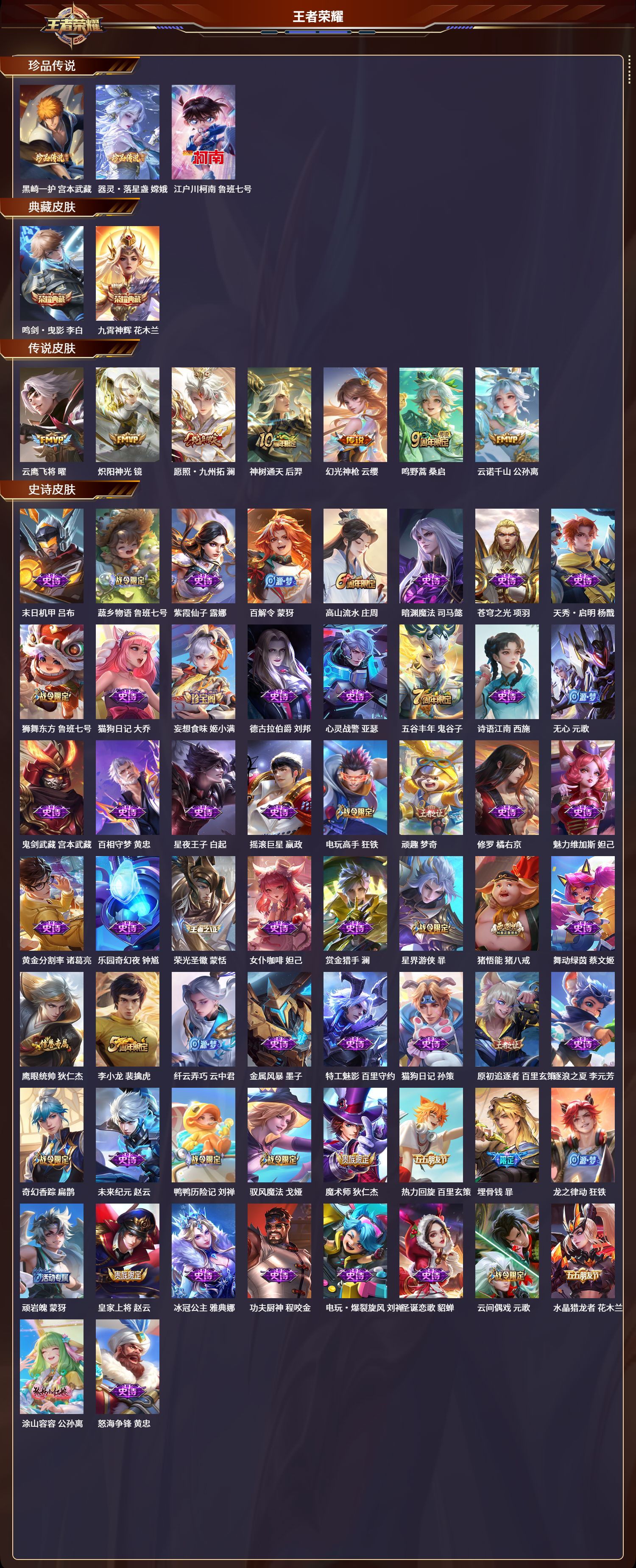 安卓qq/非凡王者/261皮肤/124英雄/2典藏/0珍品无双/0无双/3珍品传说/7传说/85史诗/8稀有英雄【3 珍品传说】黑崎一护 宫本武藏器灵·落星盏 嫦娥江户川柯南 鲁班七号【2 典藏皮肤】鸣剑·曳影 李白九霄神辉 花木兰【7 传说皮肤】云鹰飞将 曜炽阳神光 镜愿照·九州拓 澜神树通天 后羿幻光神呛 云缨鸣野蒿 桑启云诺千山 公孙离【85 史诗