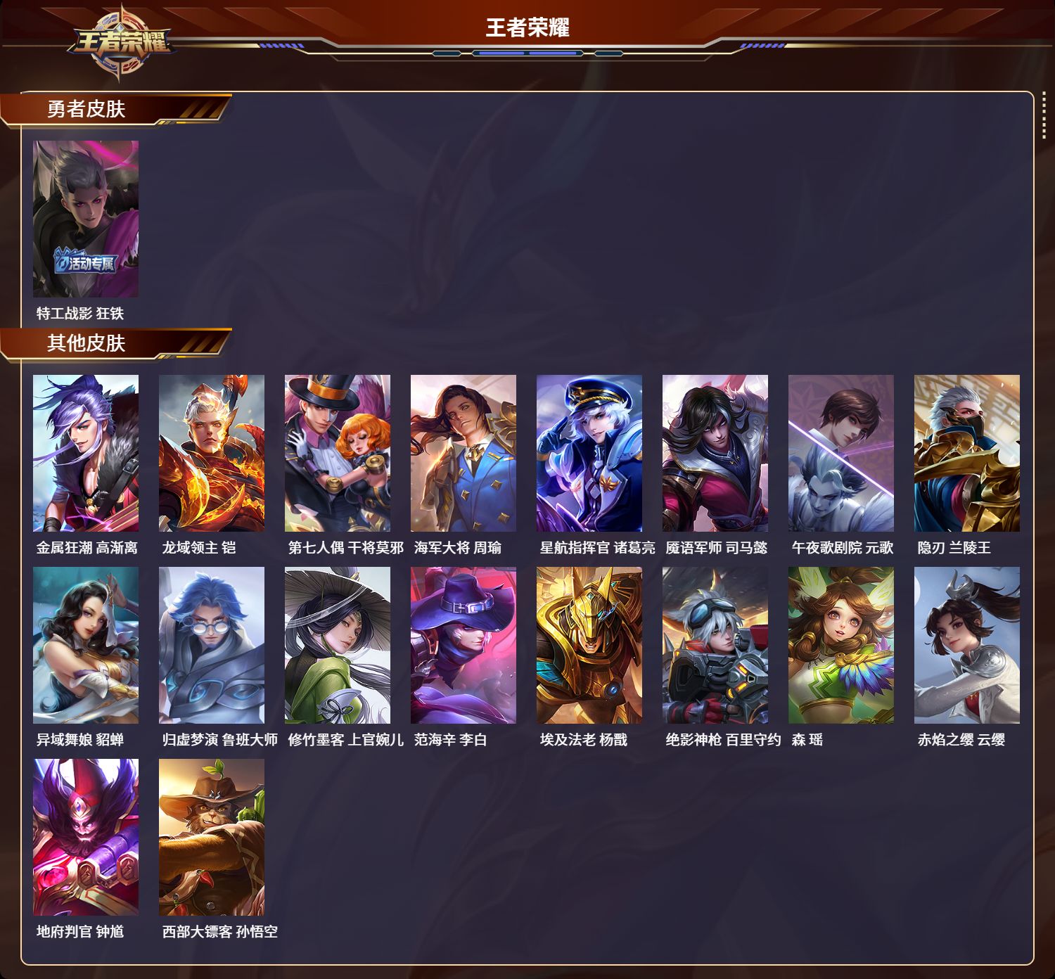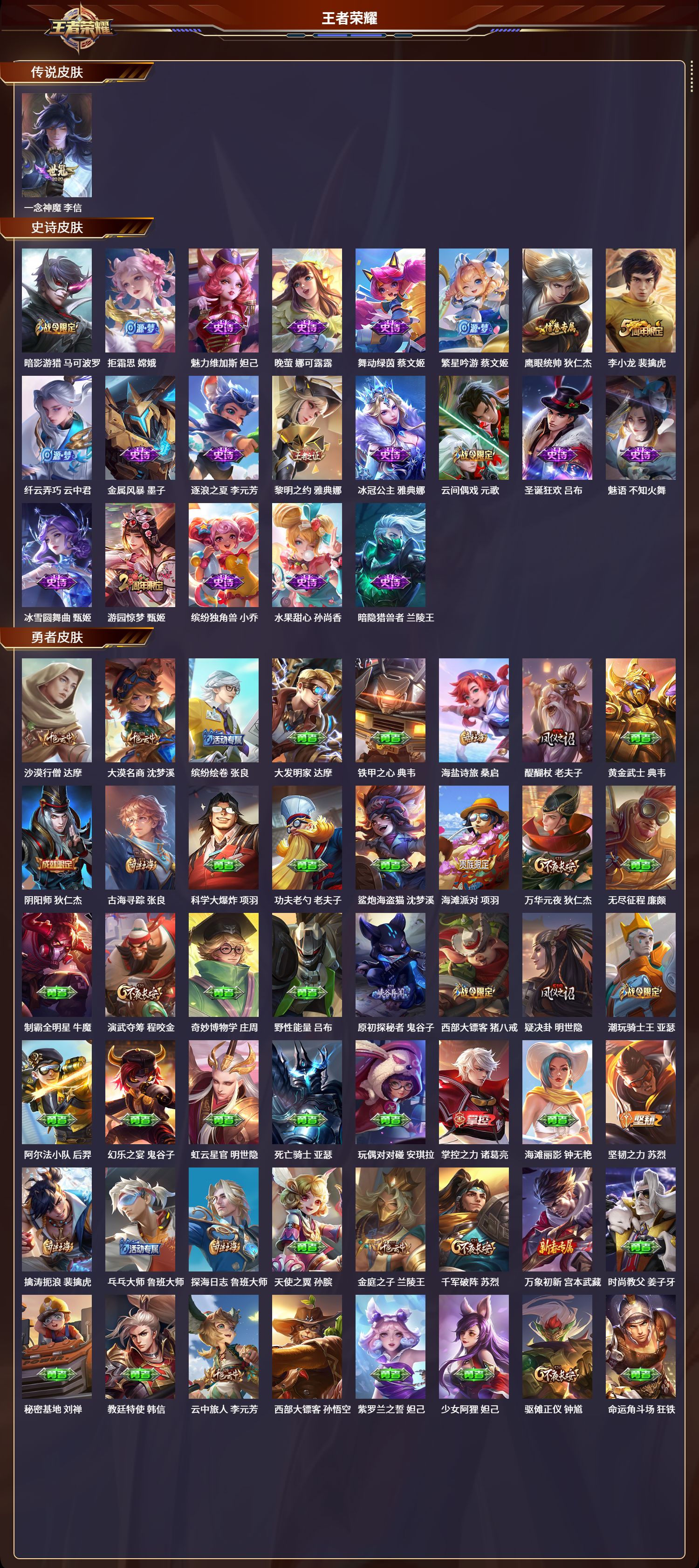 安卓qq/最强王者/89皮肤/105英雄/0典藏/0珍品无双/0无双/0珍品传说/1传说/21史诗/7稀有英雄【1 传说皮肤】一念神魔 李信【21 史诗皮肤】暗影游猎 马可波罗拒霜思 嫦娥魅力维加斯 妲己晚萤 娜可露露舞动绿茵 蔡文姬繁星吟游 蔡文姬鹰眼统帅 狄仁杰李小龙 裴擒虎纤云弄巧 云中君金属风暴 墨子逐浪之夏 李元芳黎明之约 雅典娜冰冠公主 雅