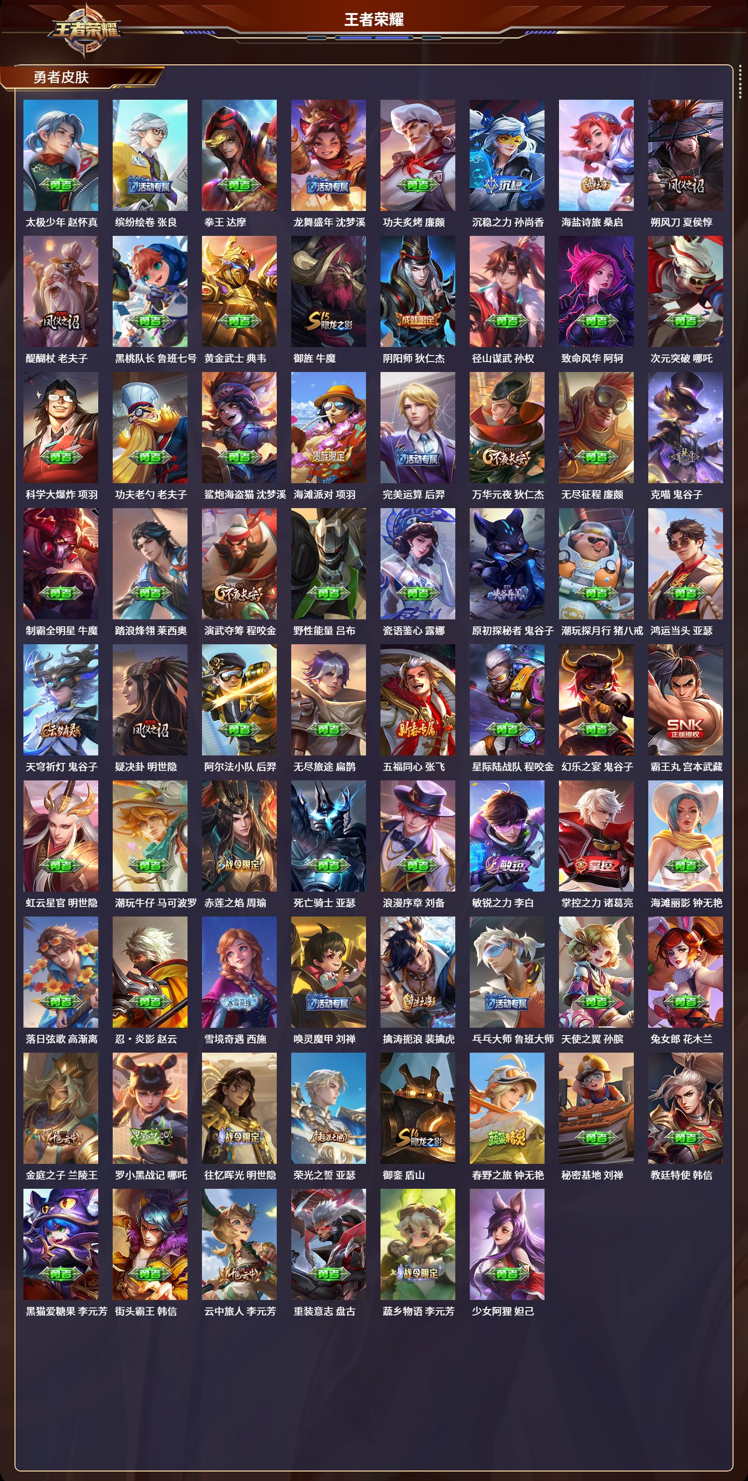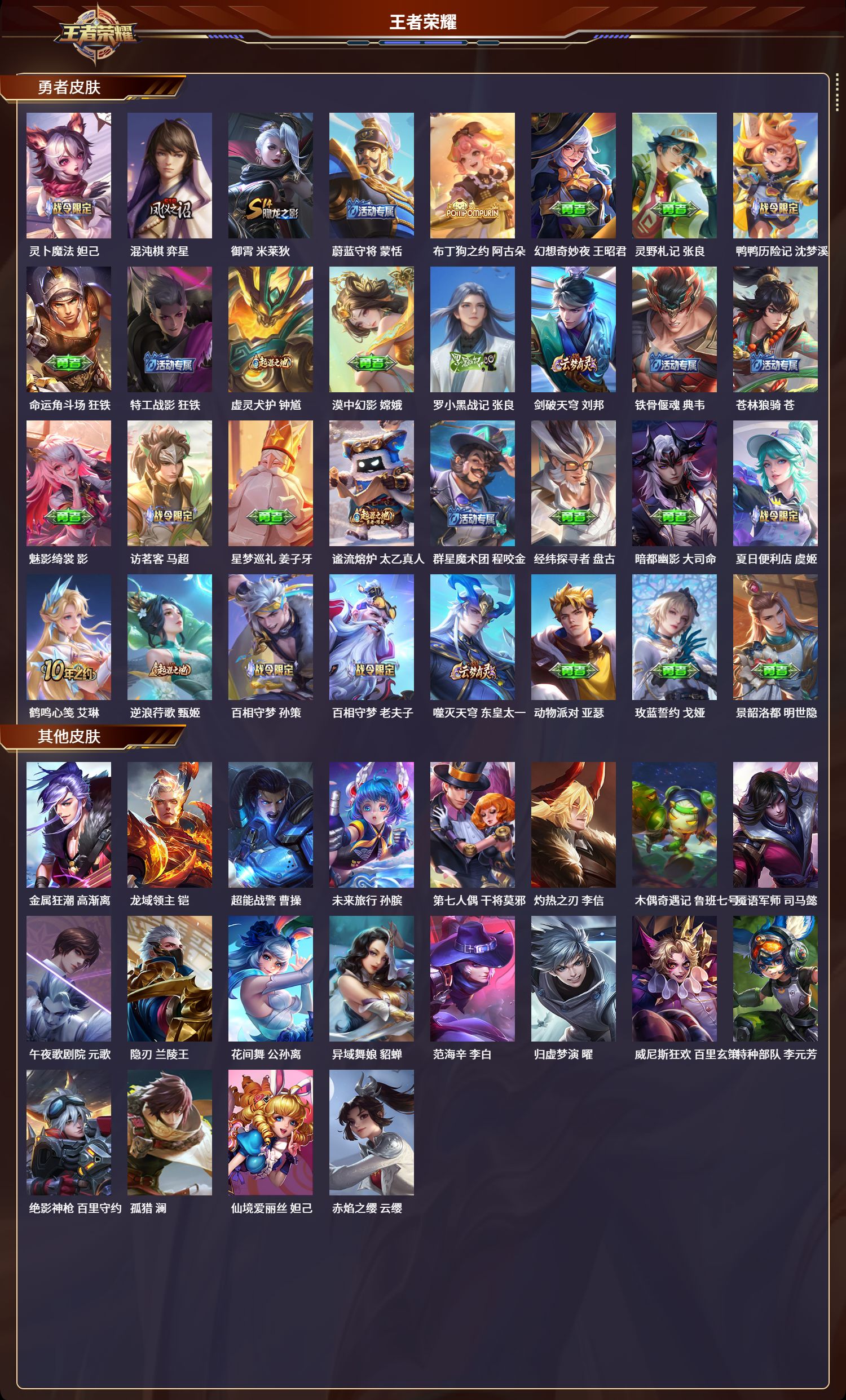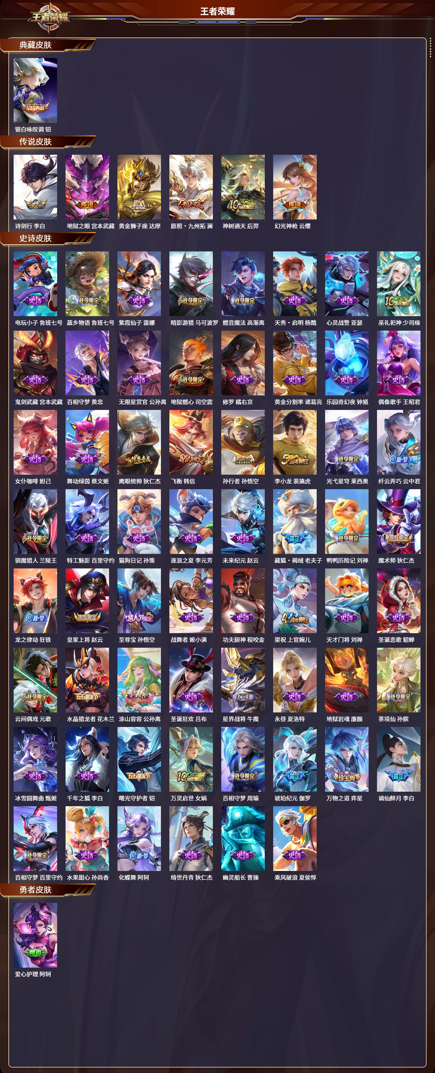 安卓qq/荣耀王者/193皮肤/124英雄/1典藏/0珍品无双/0无双/0珍品传说/6传说/62史诗/8稀有英雄【1 典藏皮肤】银白咏叹调 铠【6 传说皮肤】诗剑行 李白地狱之眼 宫本武藏黄金狮子座 达摩愿照·九州拓 澜神树通天 后羿幻光神呛 云缨【62 史诗皮肤】电玩小子 鲁班七号蔬乡物语 鲁班七号紫霞仙子 露娜暗影游猎 马可波罗燃音魔法 高渐离天秀·