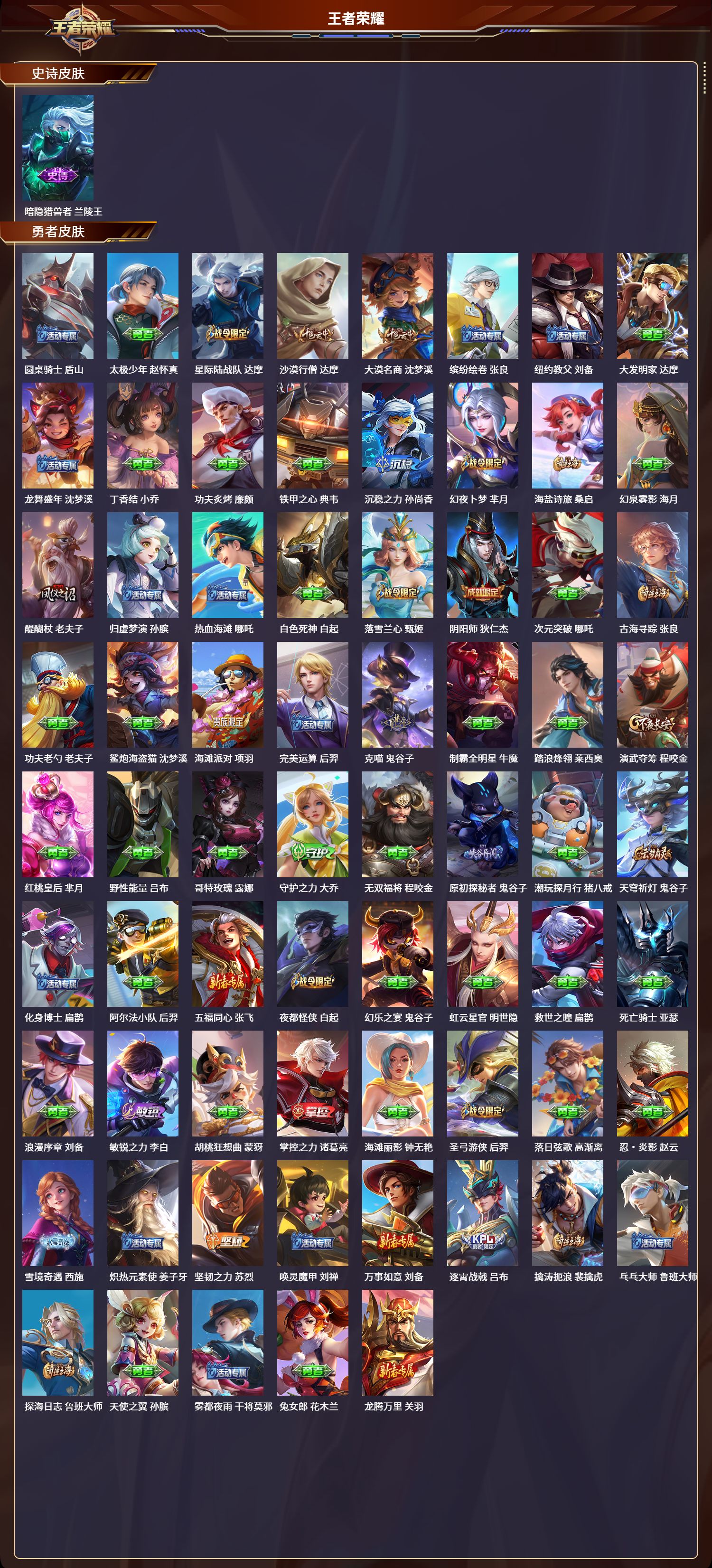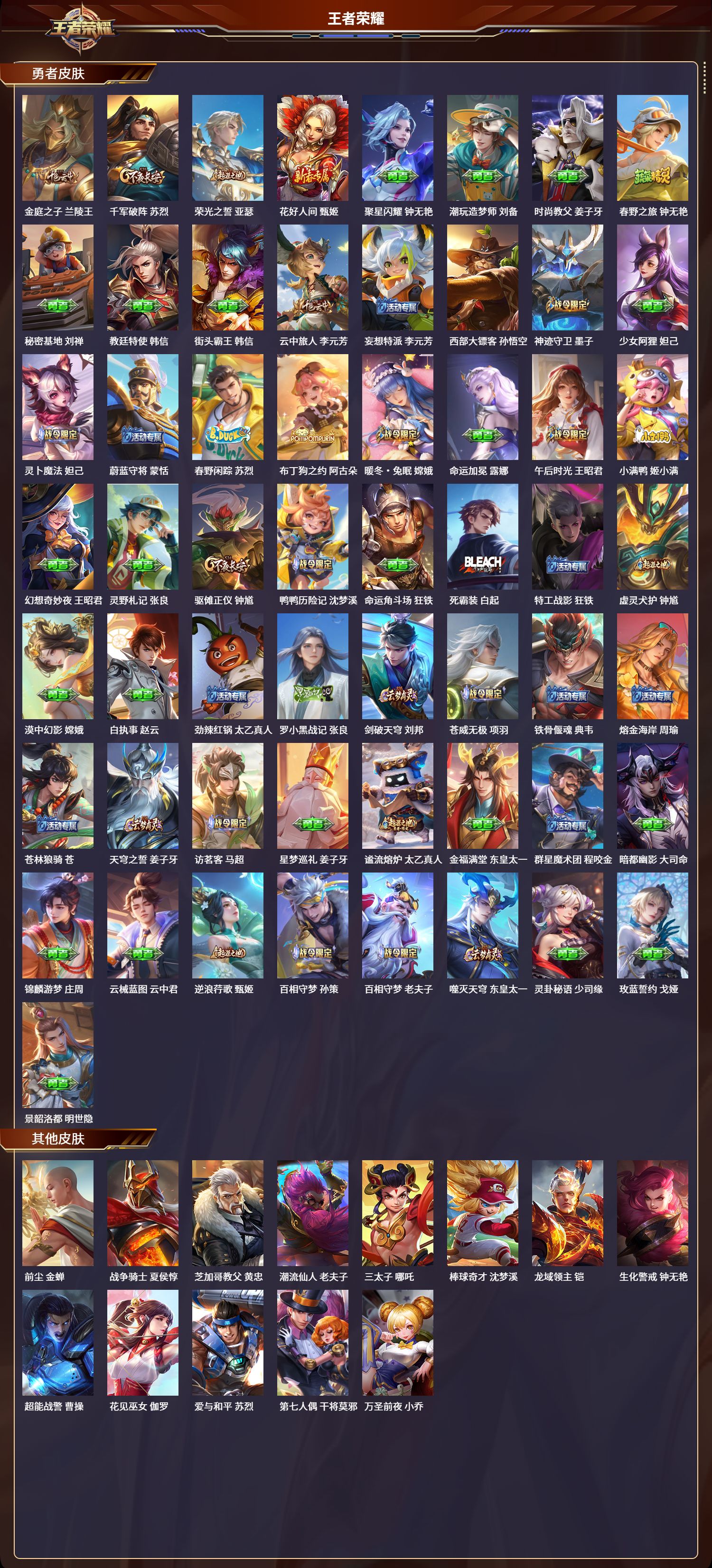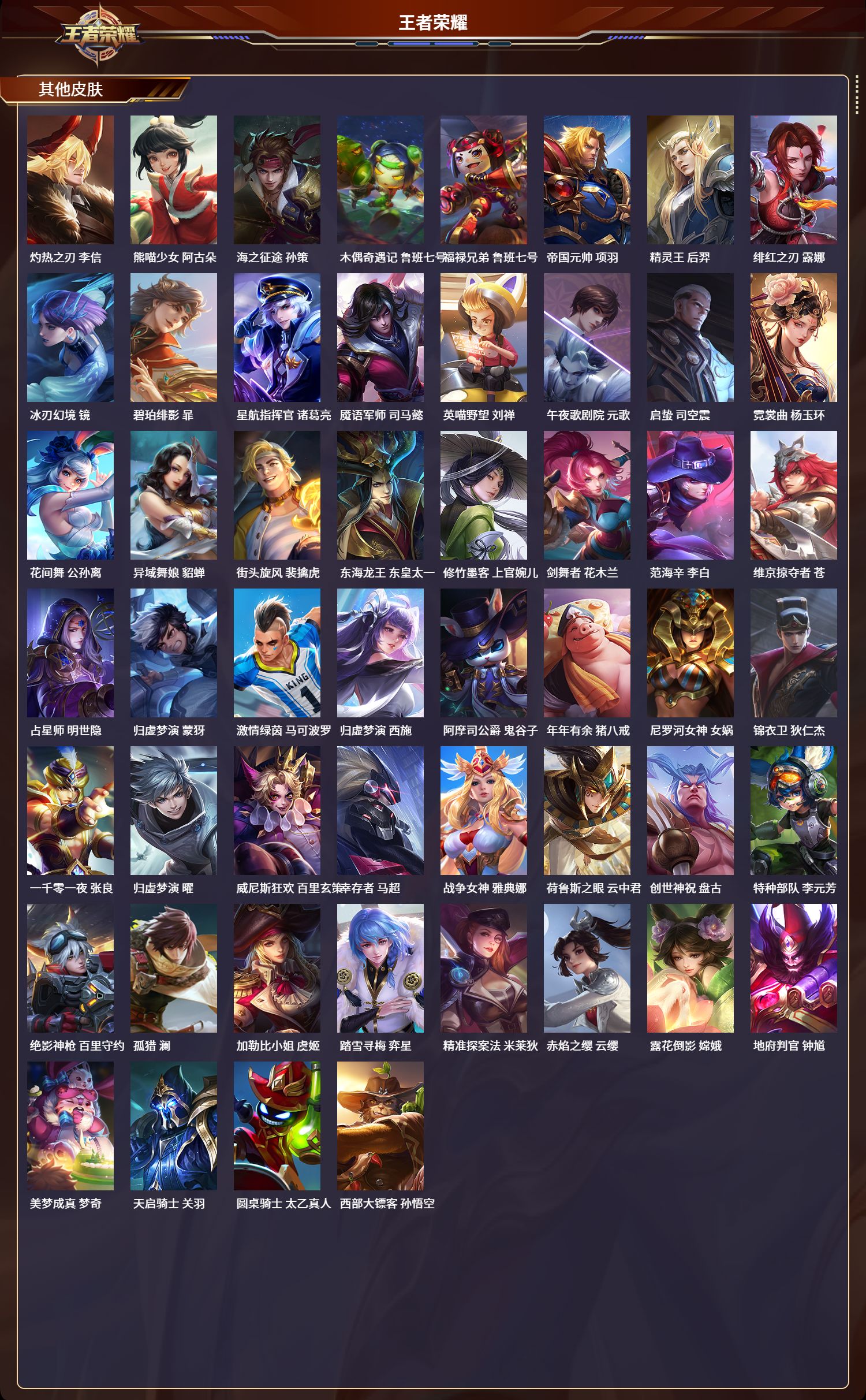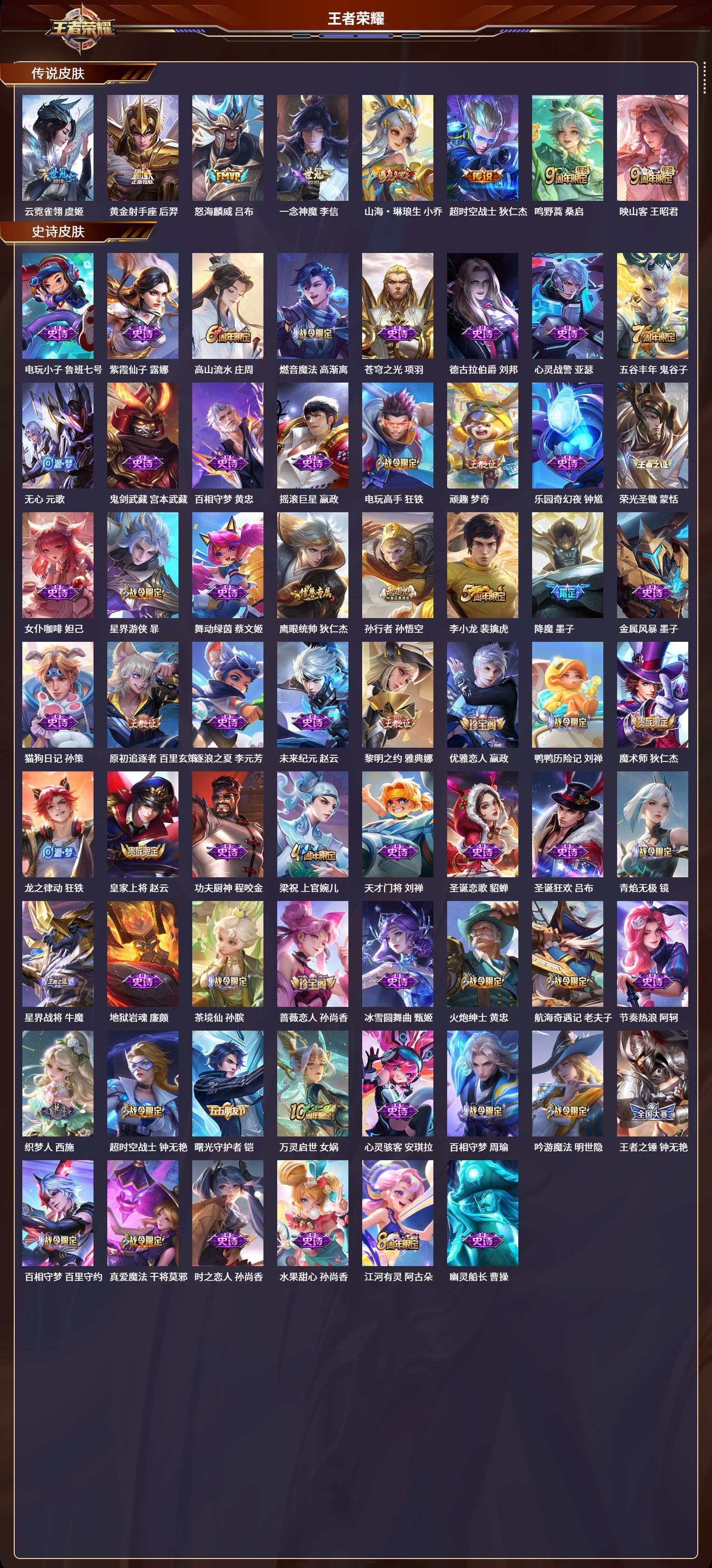 安卓微信/至尊星耀/261皮肤/125英雄/0典藏/0珍品无双/0无双/0珍品传说/8传说/63史诗/9稀有英雄【8 传说皮肤】云霓雀翎 虞姬黄金射手座 后羿怒海麟威 吕布一念神魔 李信山海·琳琅生 小乔超时空战士 狄仁杰鸣野蒿 桑启映山客 王昭君【63 史诗皮肤】电玩小子 鲁班七号紫霞仙子 露娜高山流水 庄周燃音魔法 高渐离苍穹之光 项羽德古拉伯爵