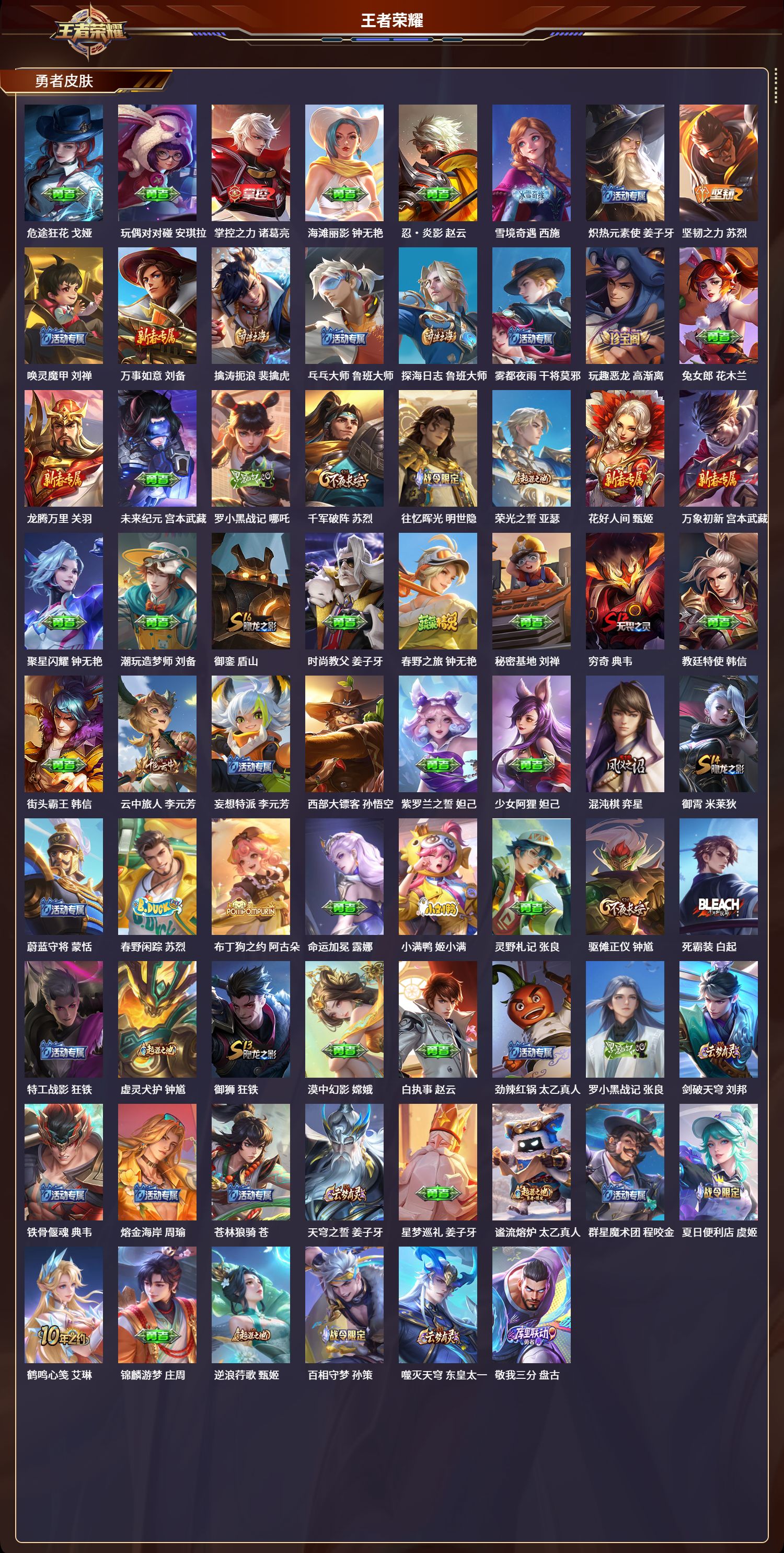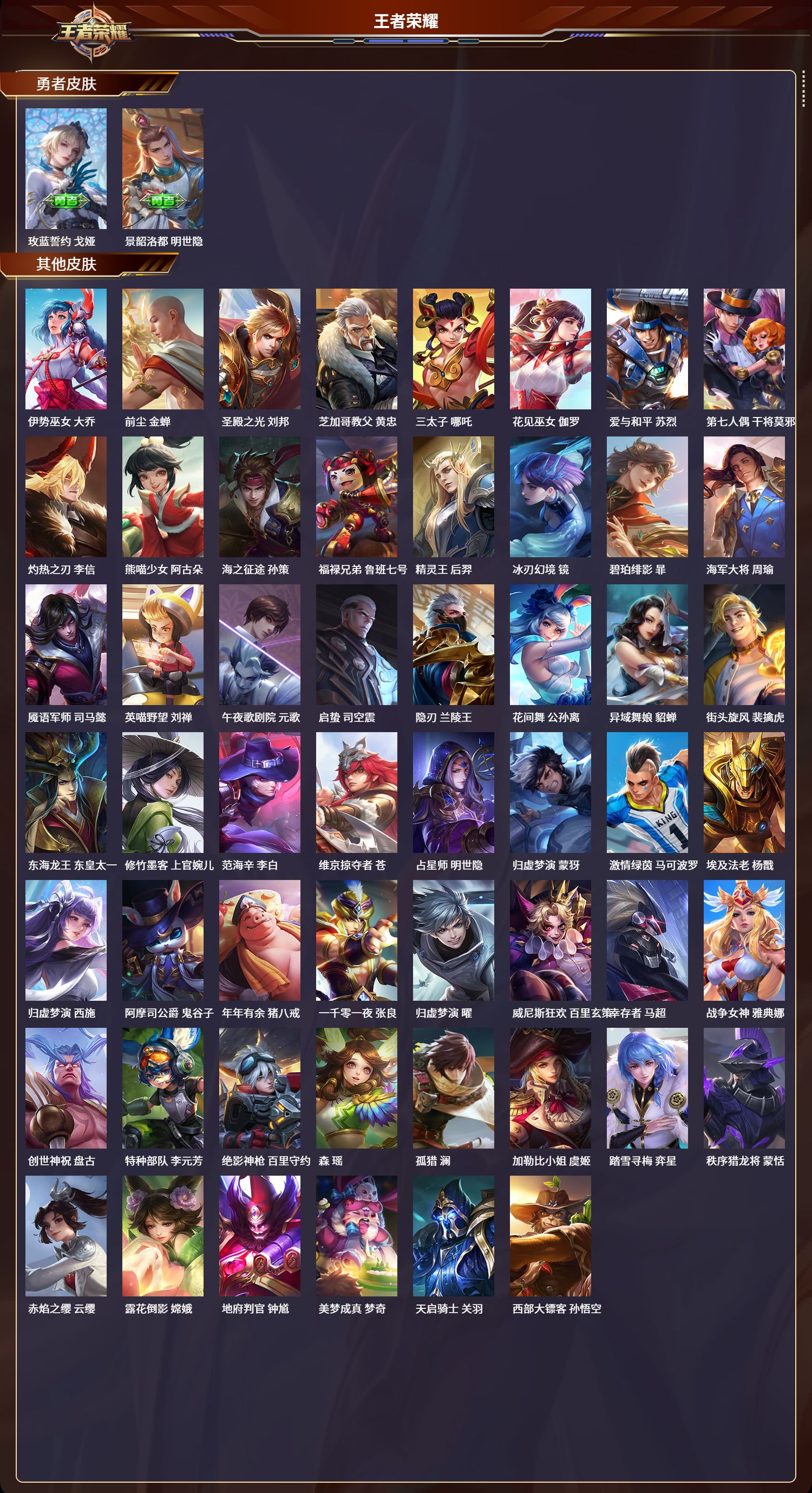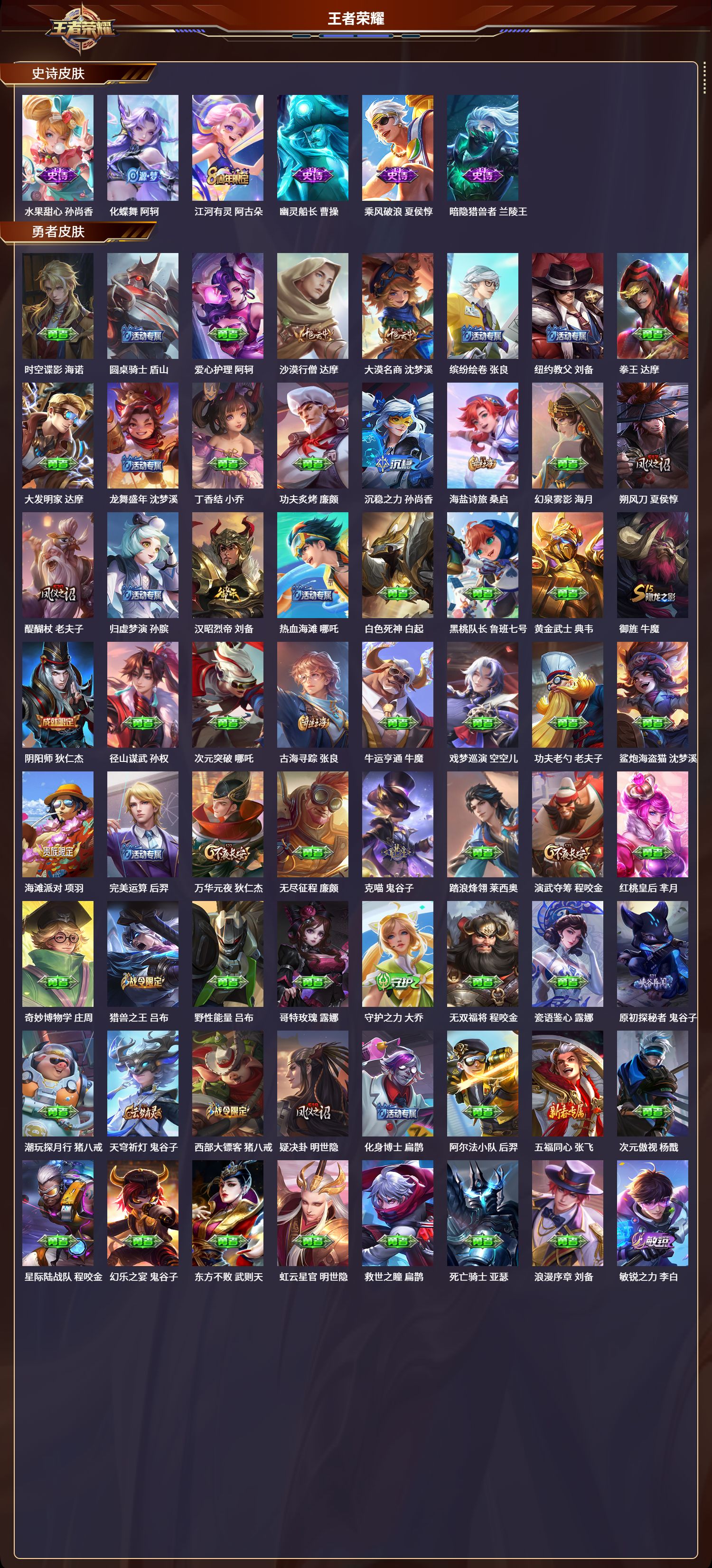 安卓qq/荣耀王者/267皮肤/124英雄/1典藏/0珍品无双/0无双/0珍品传说/9传说/66史诗/8稀有英雄【1 典藏皮肤】全息碎影 孙悟空【9 传说皮肤】胖达荣荣 梦奇白虎志 百里玄策地狱火 孙悟空凤求凰 李白炽阳神光 镜愿照·九州拓 澜神树通天 后羿幻光神呛 云缨鸣野蒿 桑启【66 史诗皮肤】末日机甲 吕布紫霞仙子 露娜高山流水 庄周暗影游猎 马可波罗妄想食味
