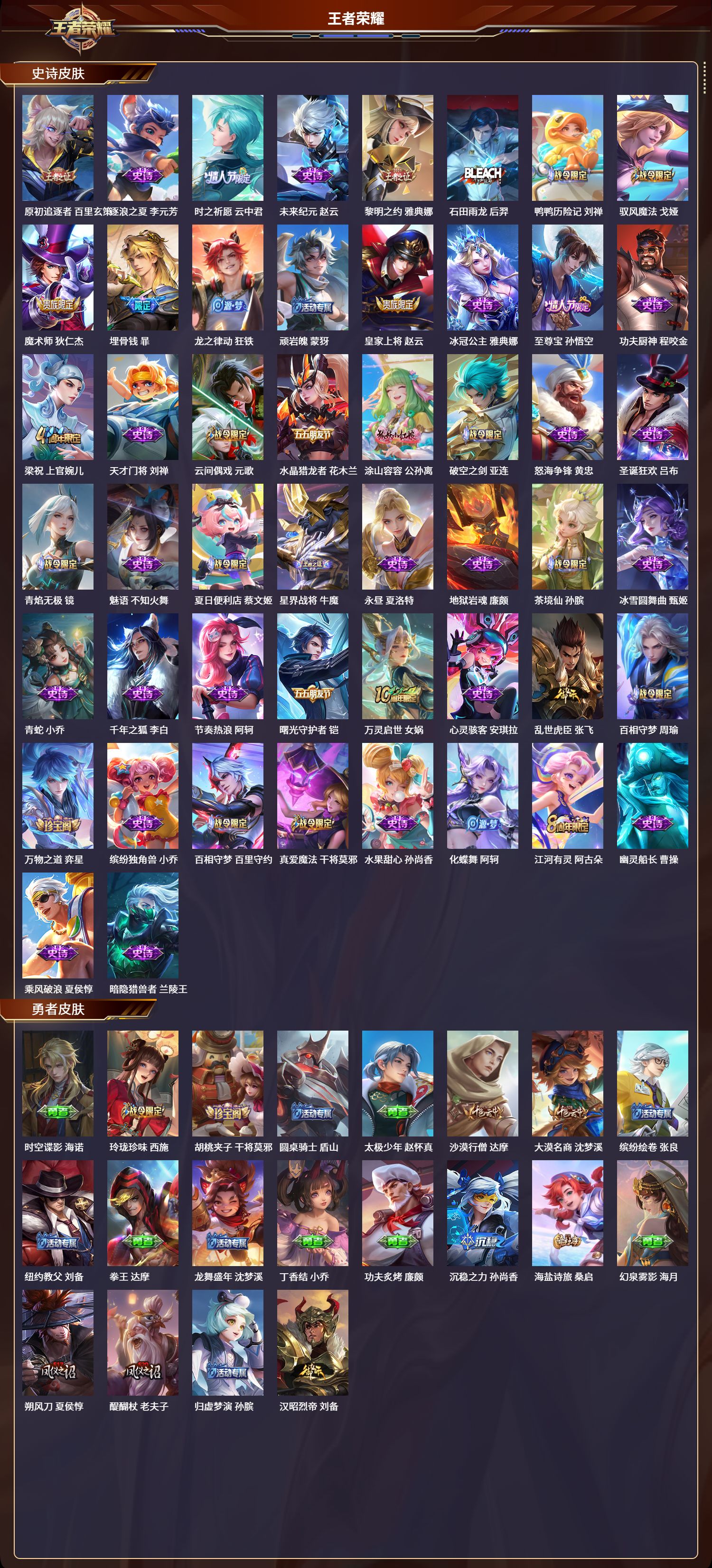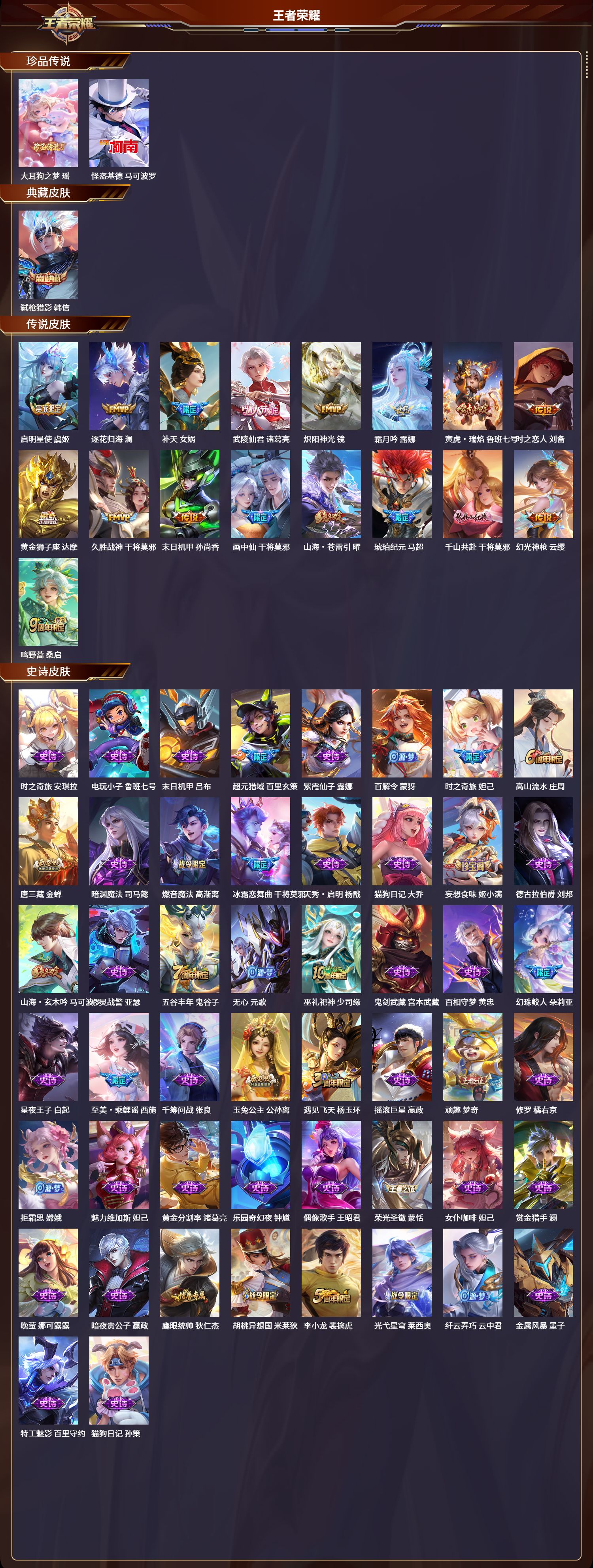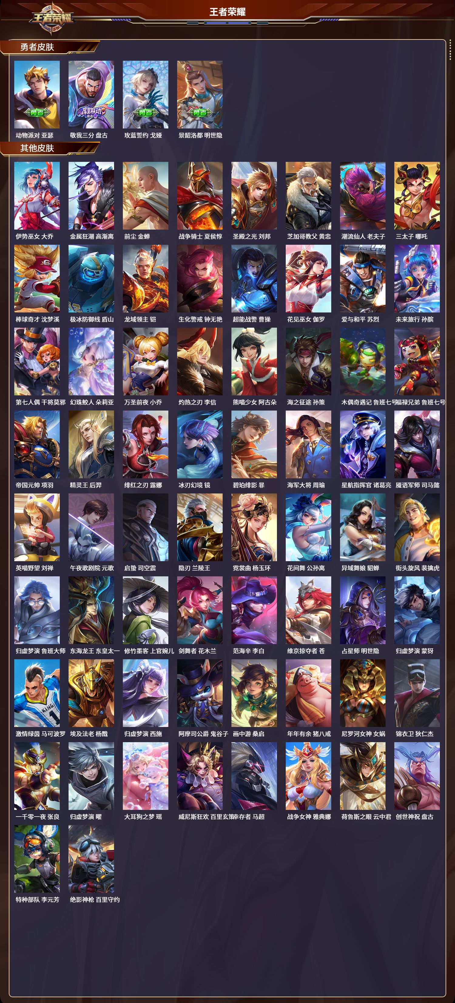 安卓qq/非凡王者/364皮肤/124英雄/1典藏/0珍品无双/0无双/2珍品传说/17传说/100史诗/8稀有英雄【2 珍品传说】大耳狗之梦 瑶怪盗基德 马可波罗【1 典藏皮肤】弑呛猎影 韩信【17 传说皮肤】启明星使 虞姬逐花归海 澜补天 女娲武陵仙君 诸葛亮炽阳神光 镜霜月吟 露娜寅虎·瑞焰 鲁班七号时之恋人 刘备黄金狮子座 达摩久胜战神 干将莫邪