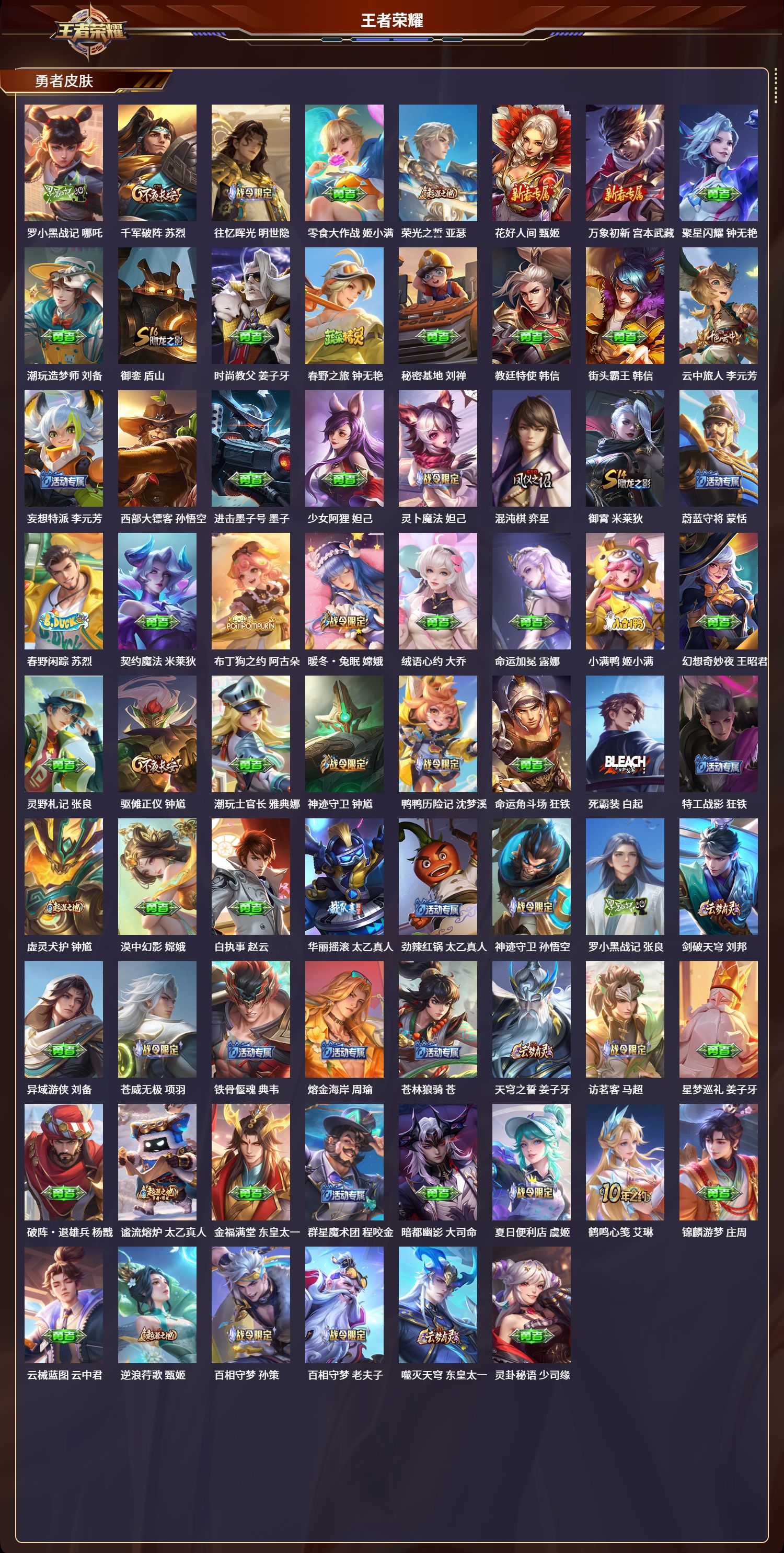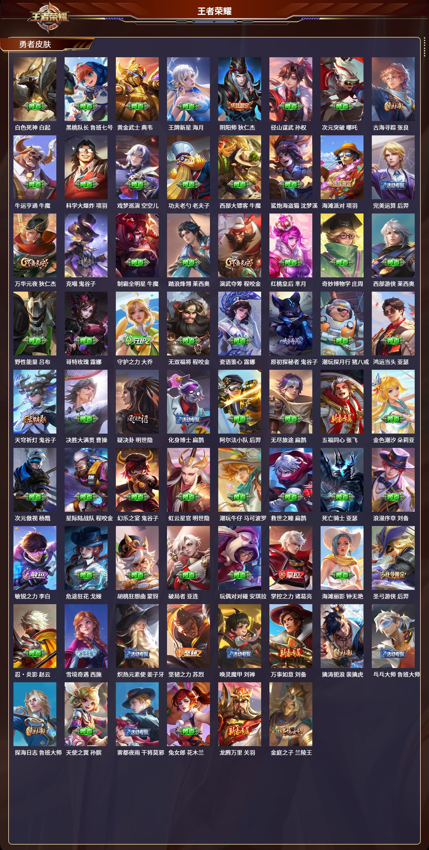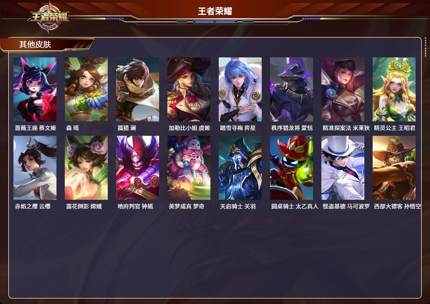 安卓qq/非凡王者/364皮肤/124英雄/1典藏/0珍品无双/0无双/2珍品传说/17传说/100史诗/8稀有英雄【2 珍品传说】大耳狗之梦 瑶怪盗基德 马可波罗【1 典藏皮肤】弑呛猎影 韩信【17 传说皮肤】启明星使 虞姬逐花归海 澜补天 女娲武陵仙君 诸葛亮炽阳神光 镜霜月吟 露娜寅虎·瑞焰 鲁班七号时之恋人 刘备黄金狮子座 达摩久胜战神 干将莫邪
