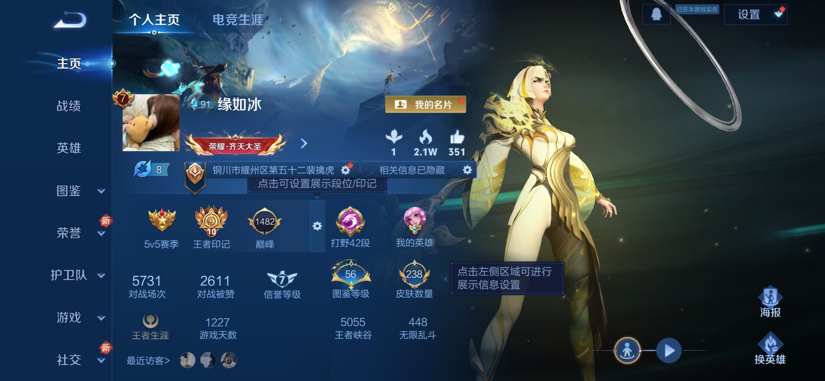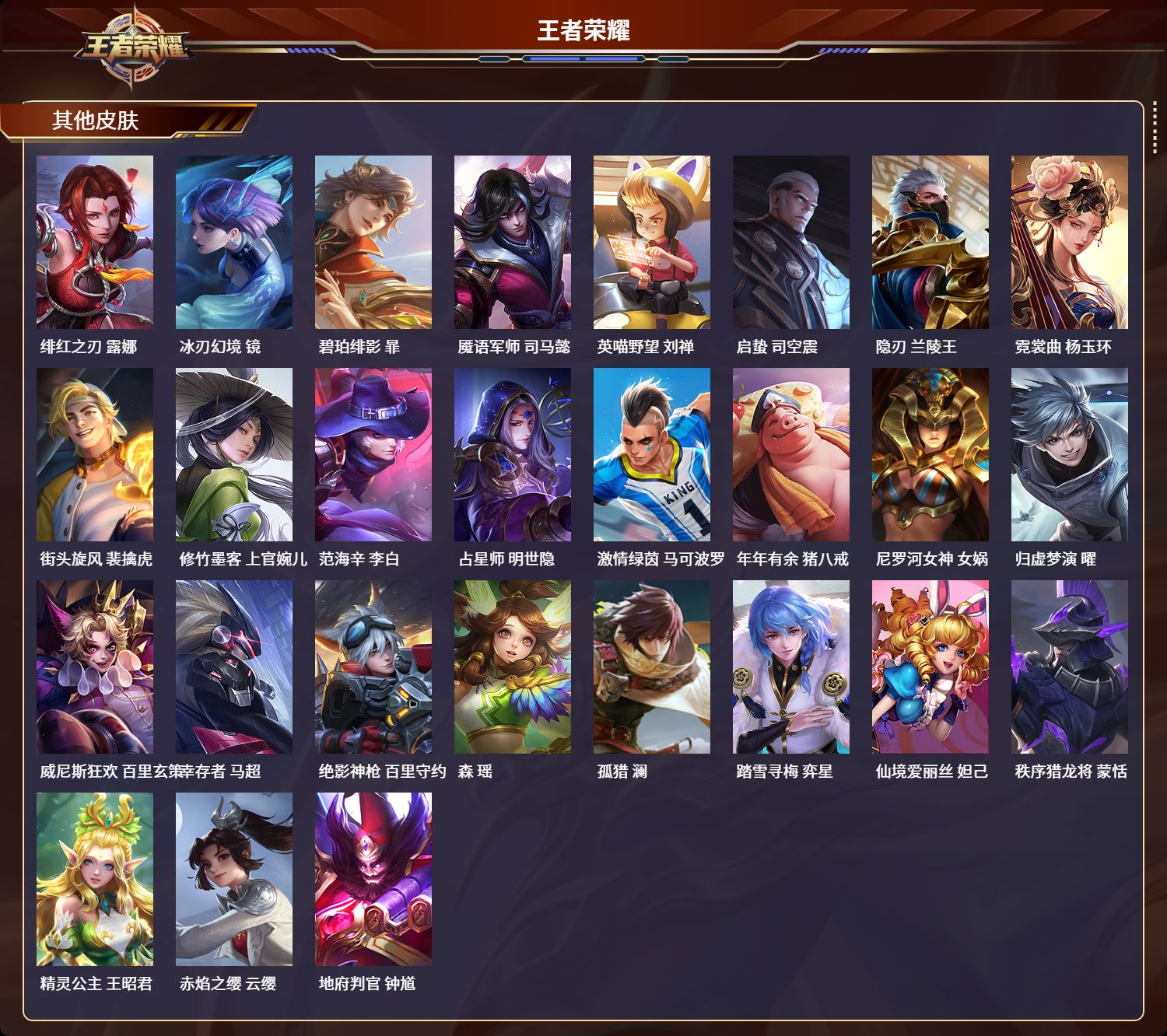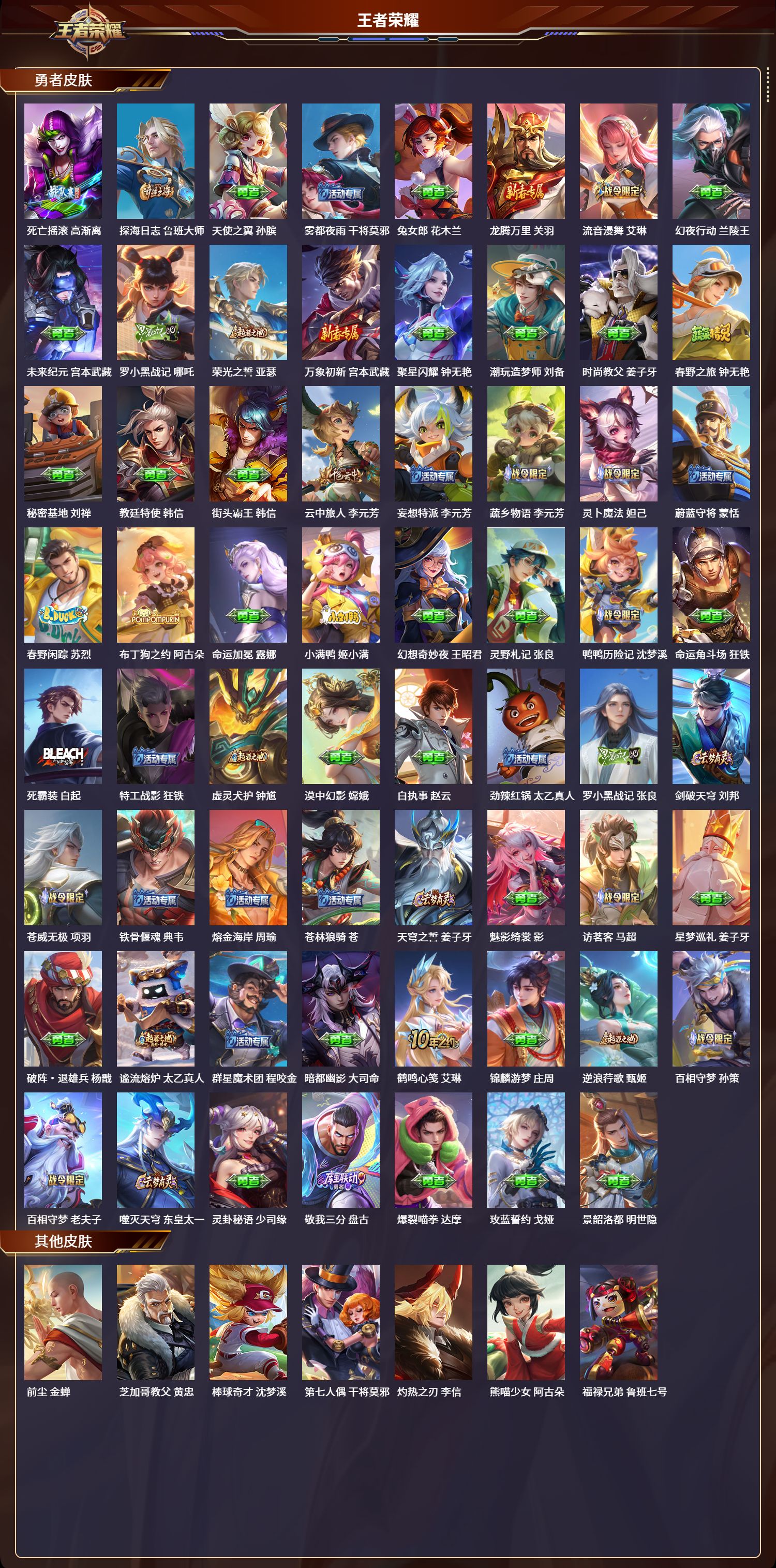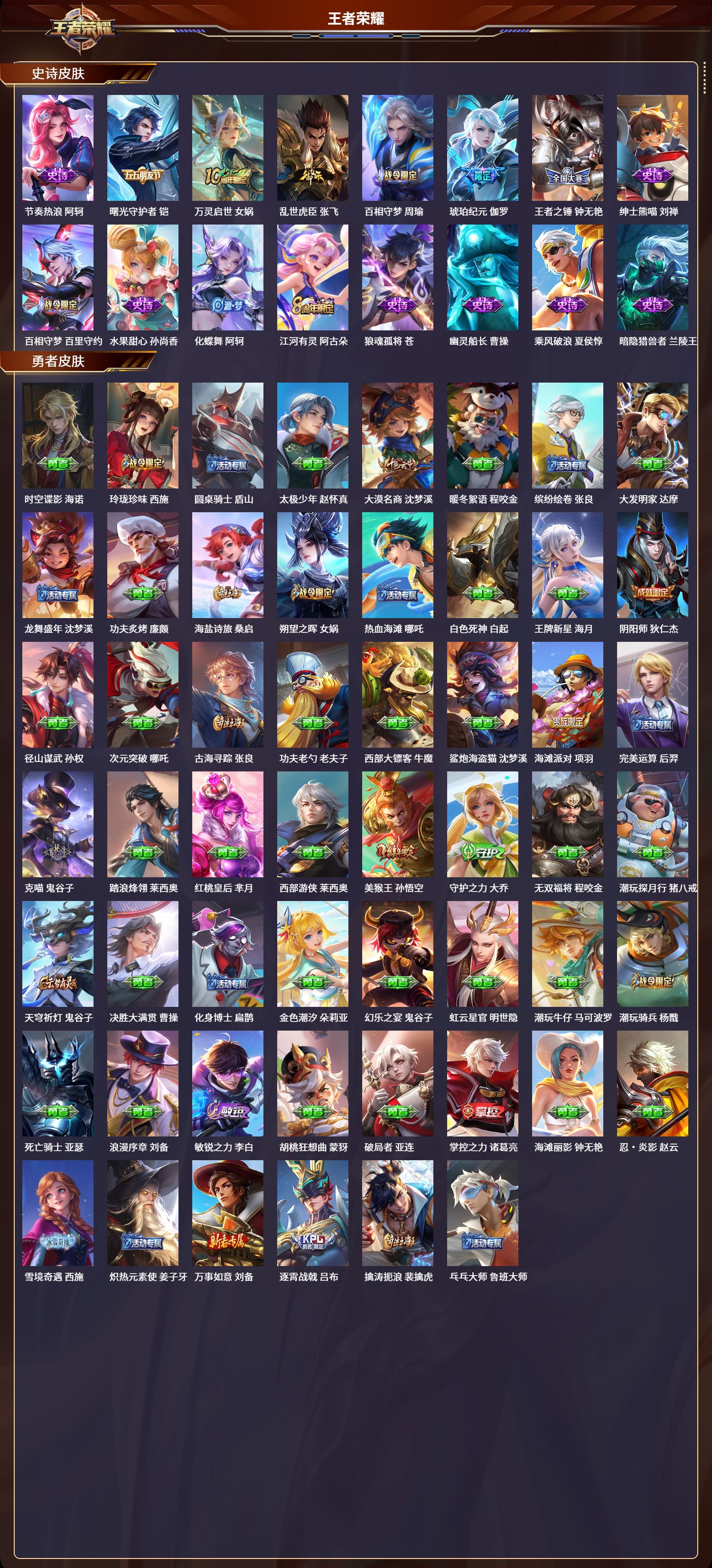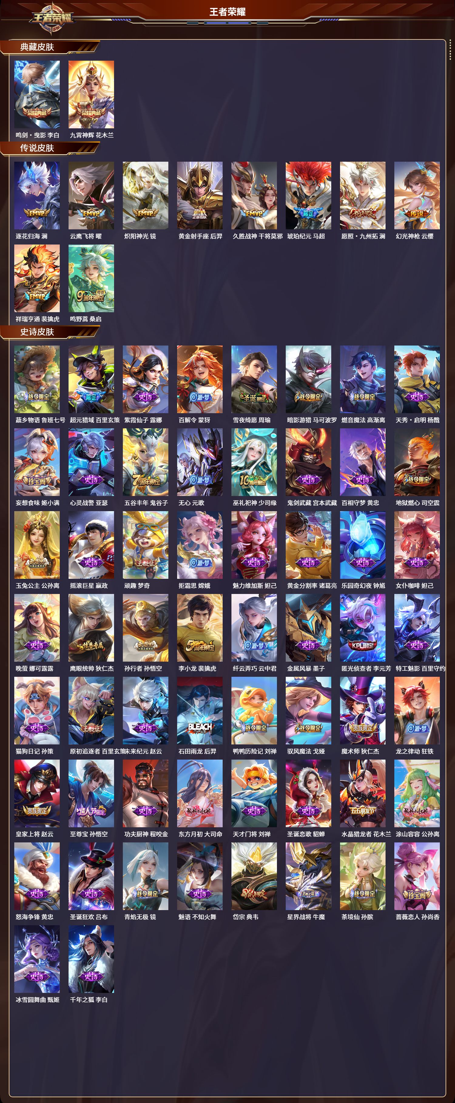 安卓qq/荣耀王者/238皮肤/124英雄/2典藏/0珍品无双/0无双/0珍品传说/10传说/74史诗/8稀有英雄【2 典藏皮肤】鸣剑·曳影 李白九霄神辉 花木兰【10 传说皮肤】逐花归海 澜云鹰飞将 曜炽阳神光 镜黄金射手座 后羿久胜战神 干将莫邪琥珀纪元 马超愿照·九州拓 澜幻光神呛 云缨祥瑞亨通 裴擒虎鸣野蒿 桑启【74 史诗皮肤】蔬乡物语 鲁班七