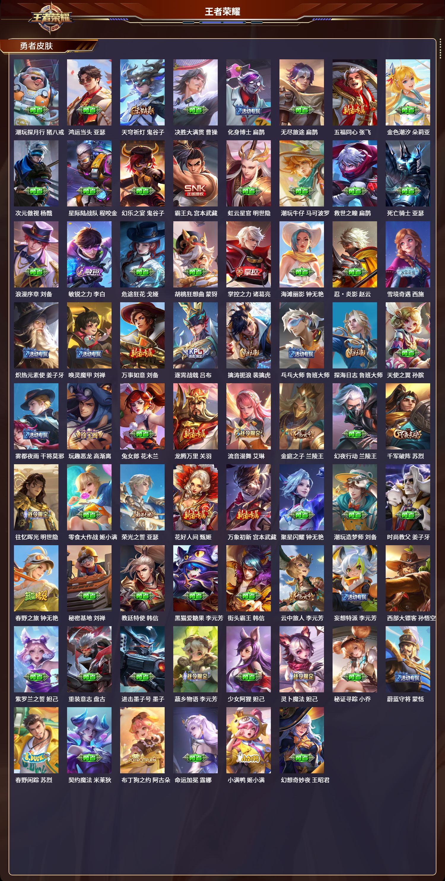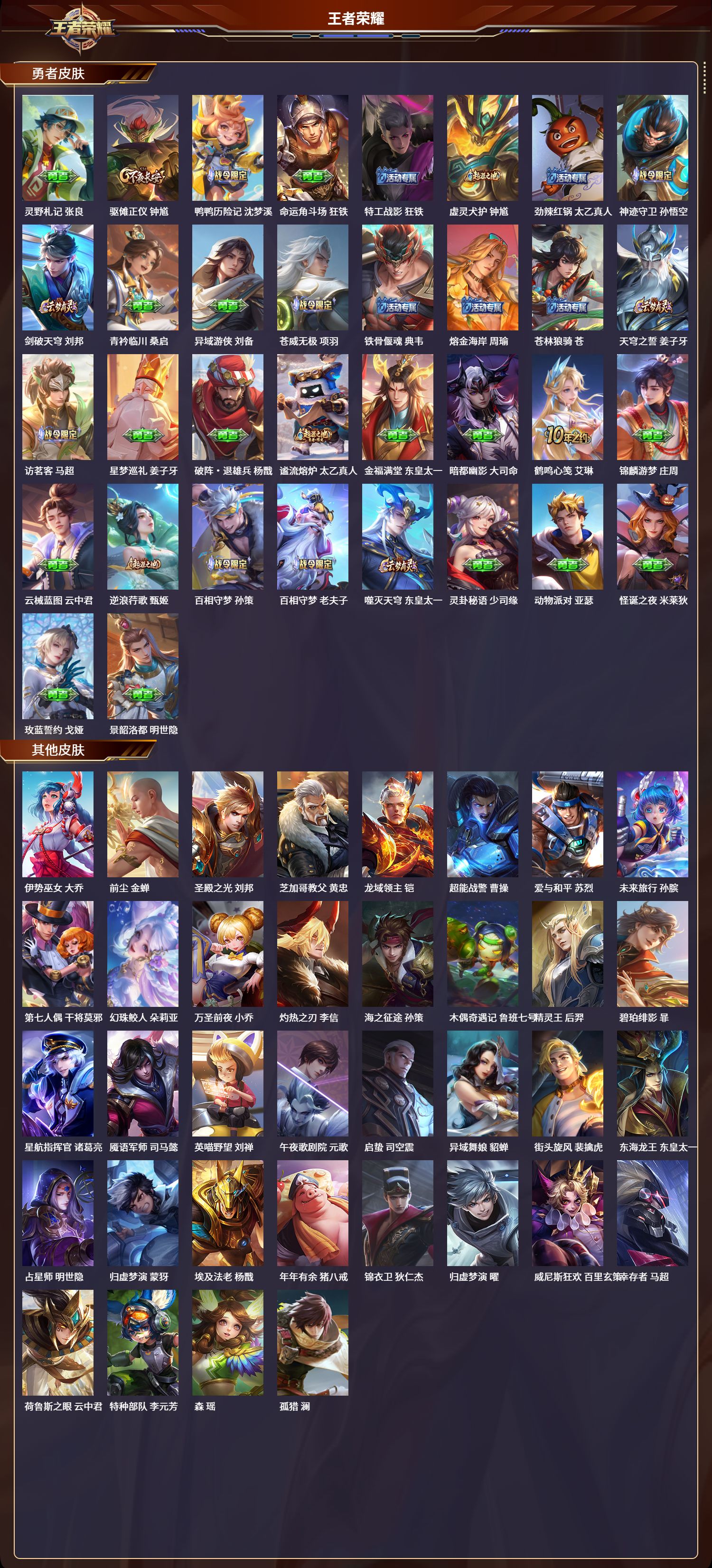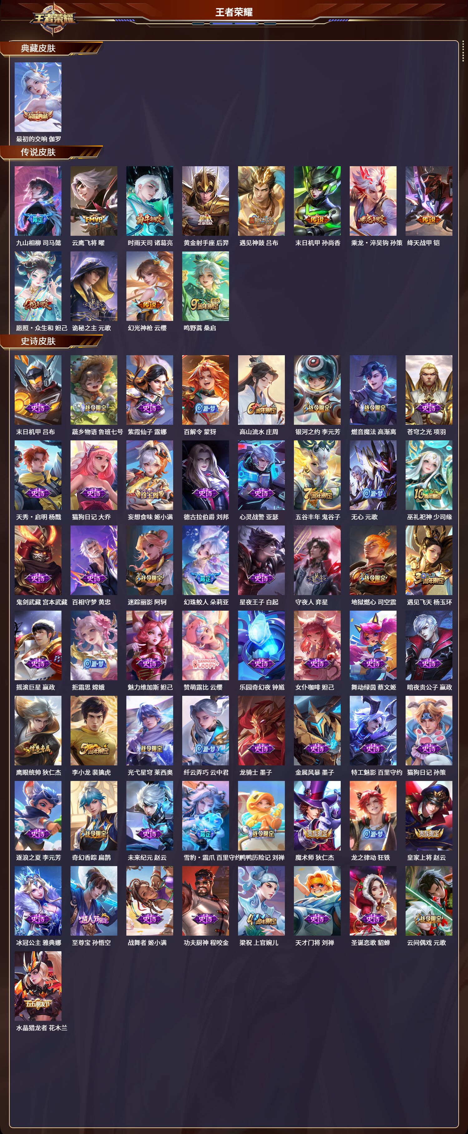 安卓qq/绝世王者/285皮肤/124英雄/1典藏/0珍品无双/0无双/0珍品传说/12传说/85史诗/8稀有英雄【1 典藏皮肤】最初的交响 伽罗【12 传说皮肤】九山相柳 司马懿云鹰飞将 曜时雨天司 诸葛亮黄金射手座 后羿遇见神鼓 吕布末日机甲 孙尚香乘龙·淬吴钩 孙策绛天战甲 铠愿照·众生和 妲己诡秘之主 元歌幻光神呛 云缨鸣野蒿 桑启【85 史诗皮肤】末日机甲 吕布