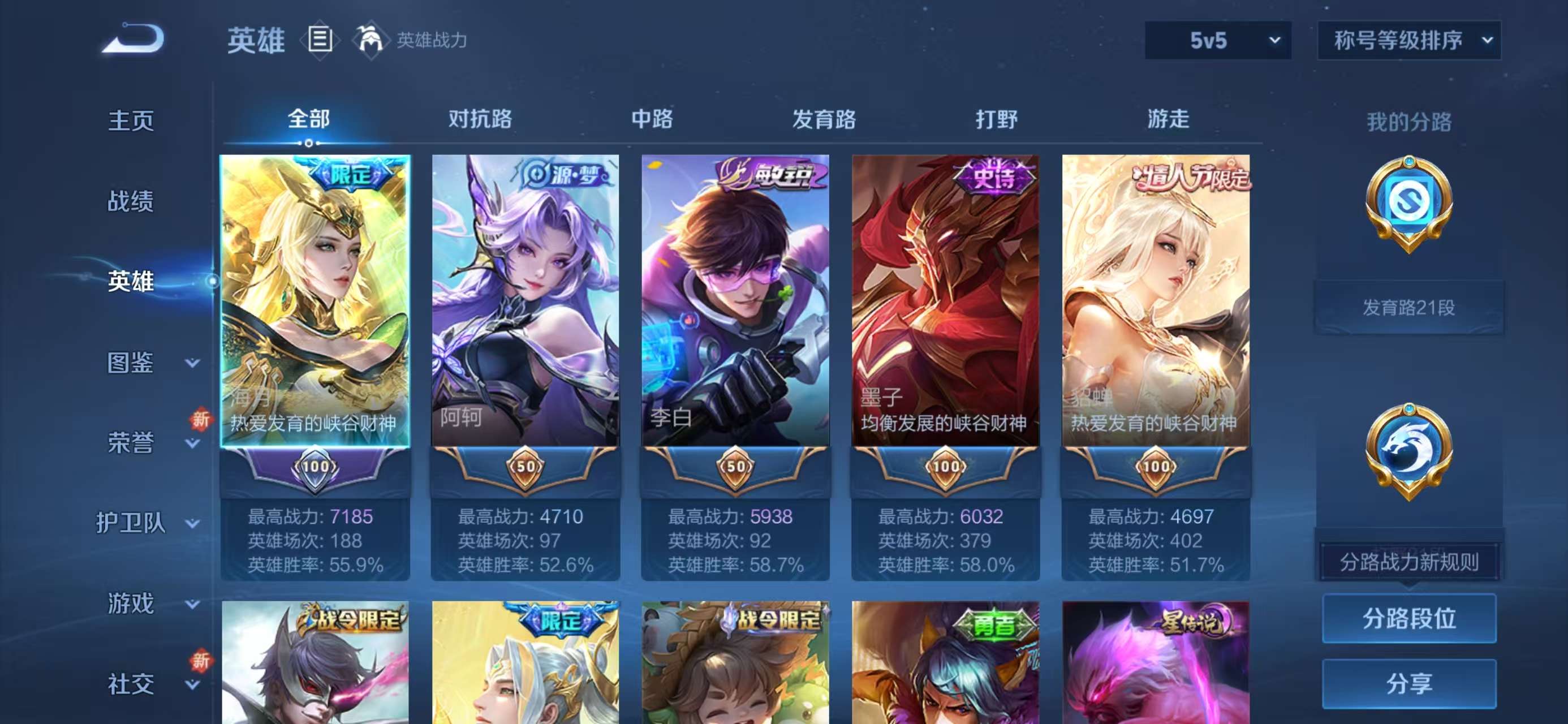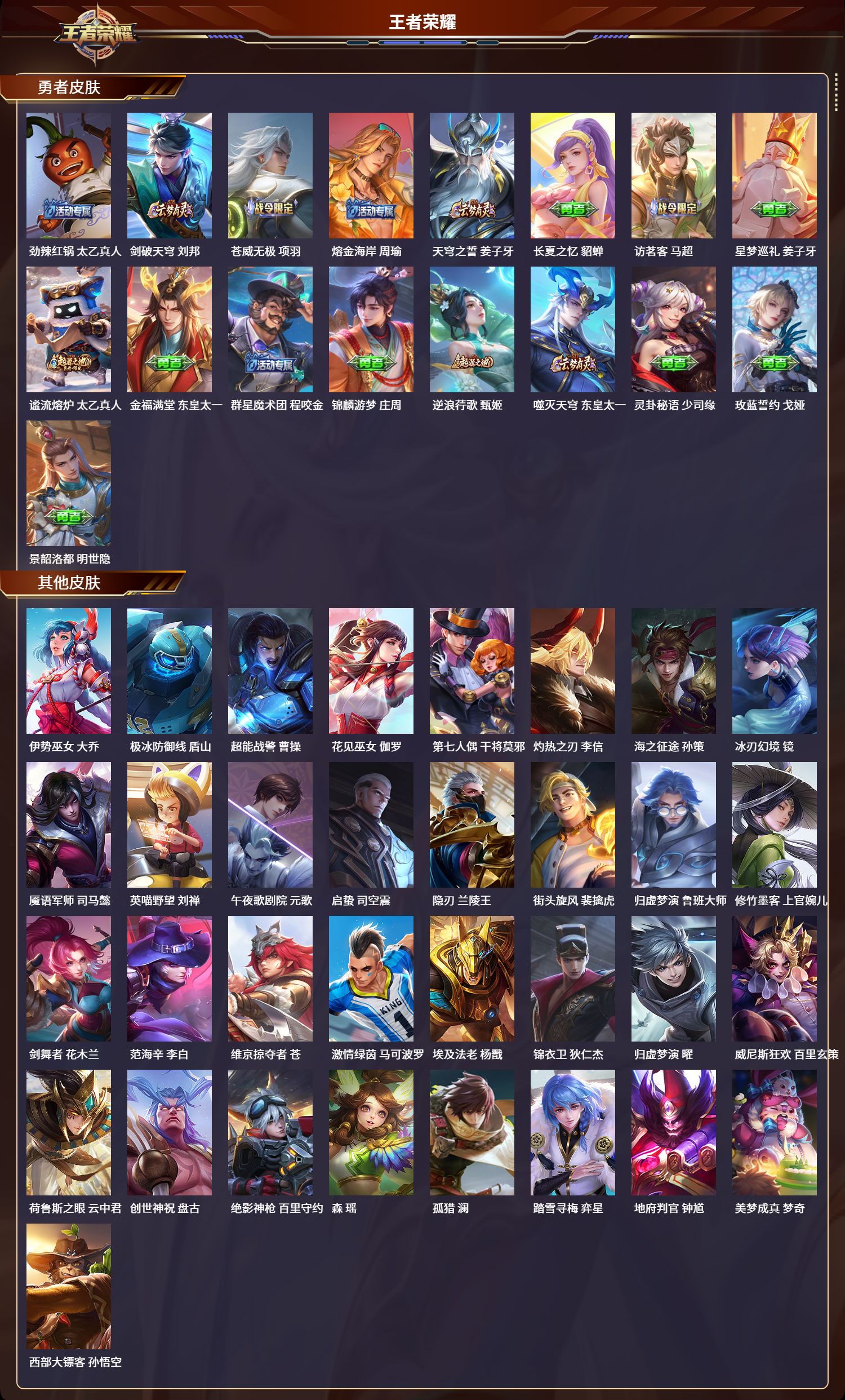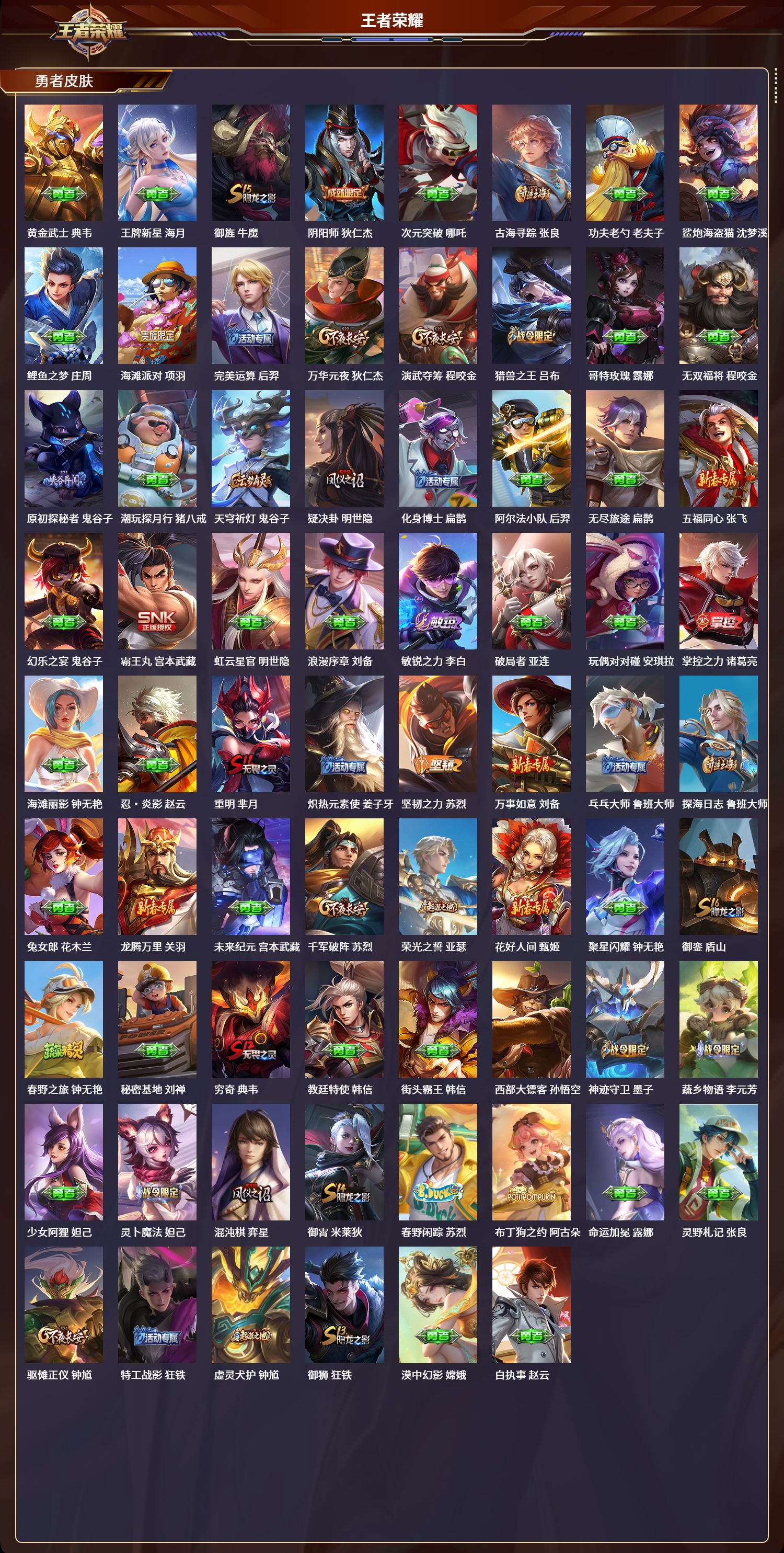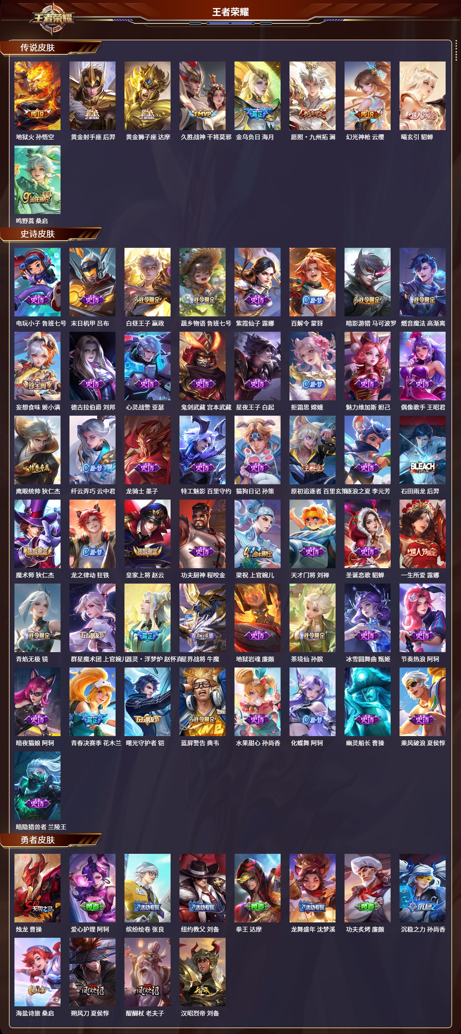 安卓qq/绝世王者/189皮肤/124英雄/0典藏/0珍品无双/0无双/0珍品传说/9传说/49史诗/8稀有英雄【9 传说皮肤】地狱火 孙悟空黄金射手座 后羿黄金狮子座 达摩久胜战神 干将莫邪金乌负日 海月愿照·九州拓 澜幻光神呛 云缨曦玄引 貂蝉鸣野蒿 桑启【49 史诗皮肤】电玩小子 鲁班七号末日机甲 吕布白昼王子 嬴政蔬乡物语 鲁班七号紫霞仙子 露