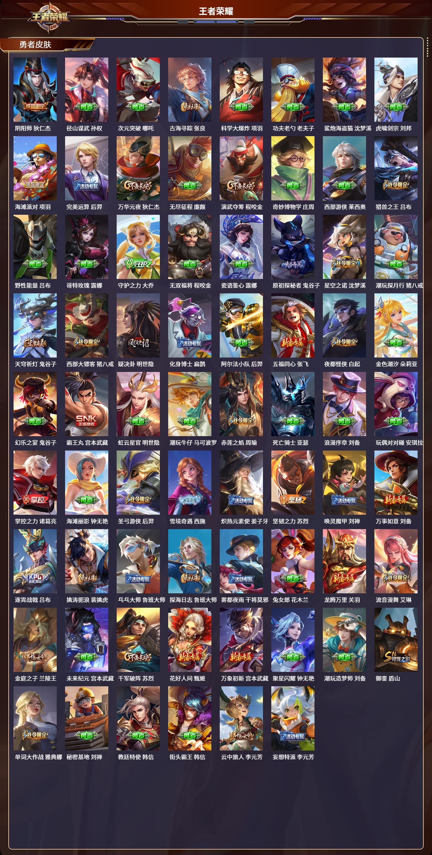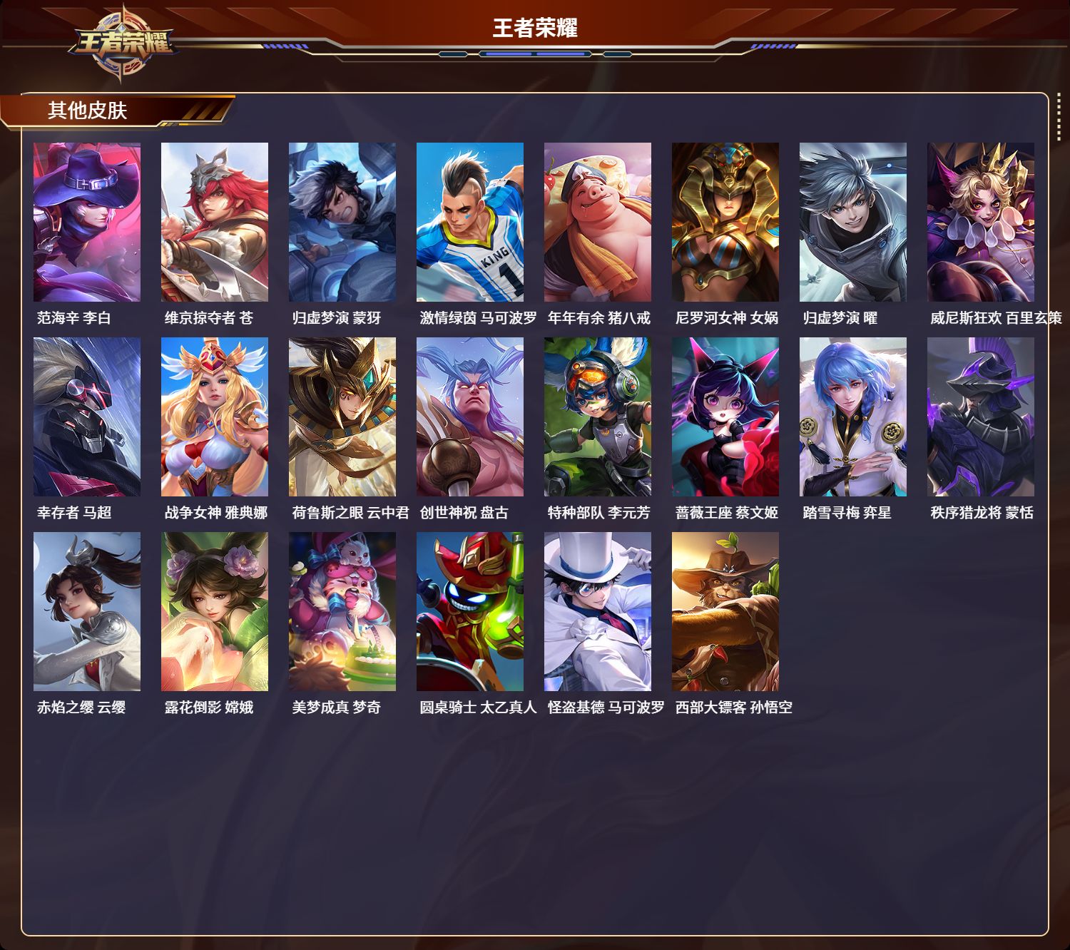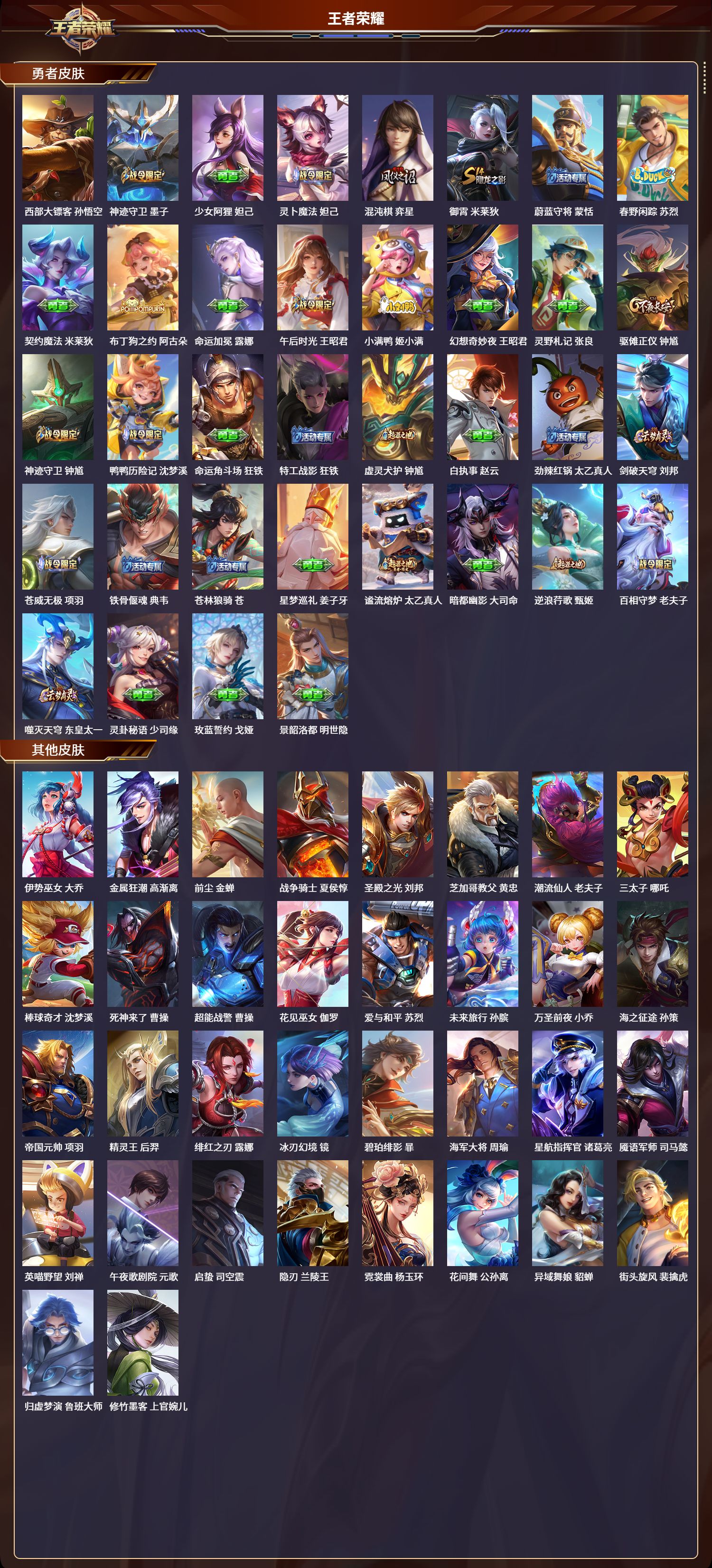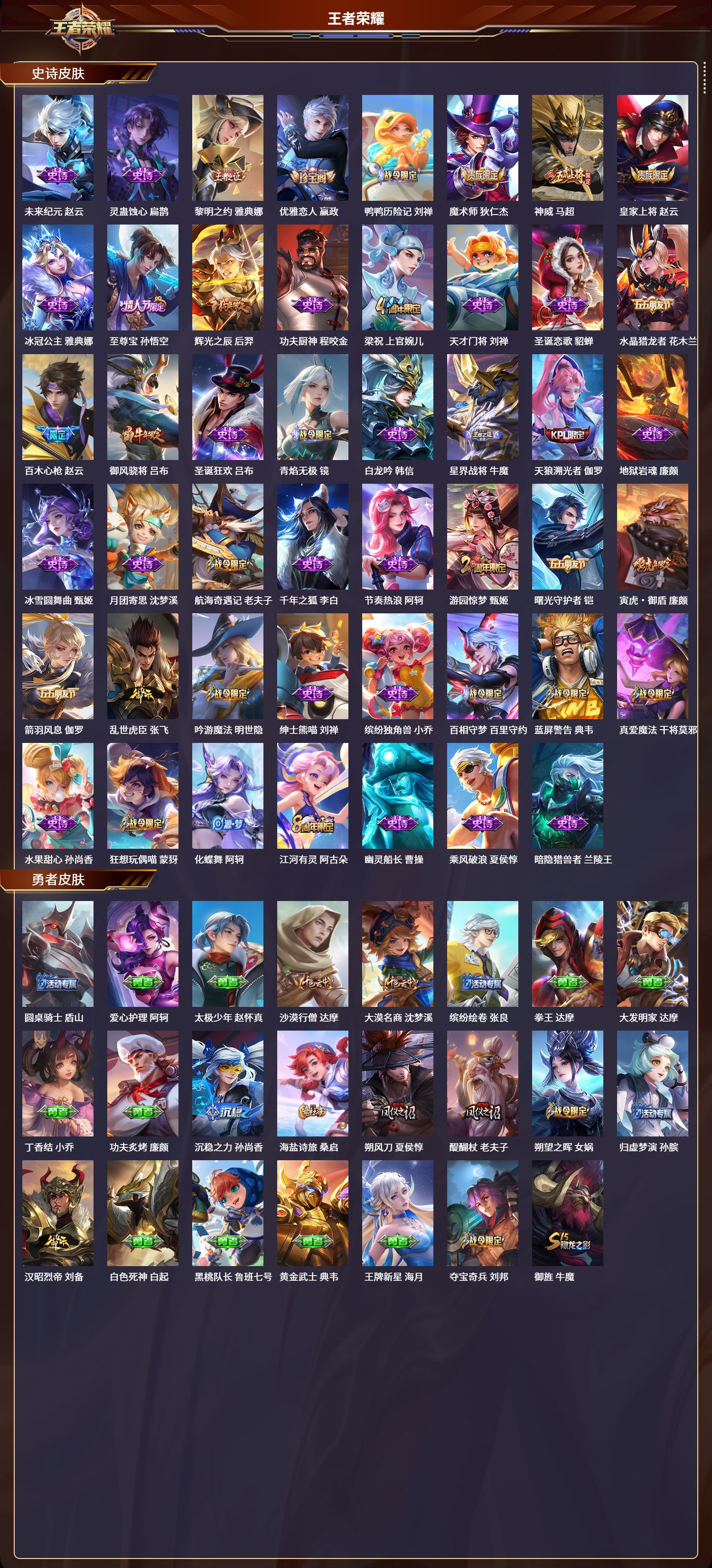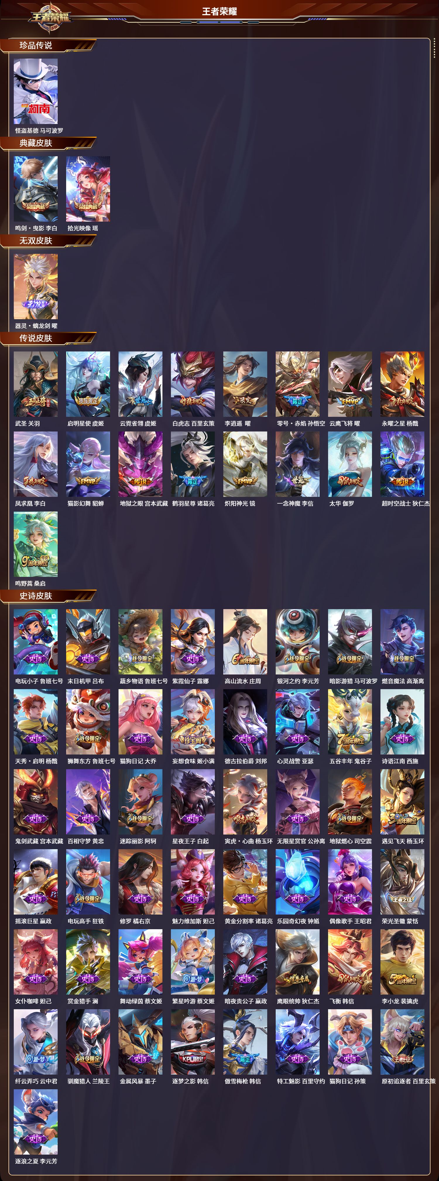 苹果qq/无双王者/300皮肤/125英雄/2典藏/0珍品无双/1无双/1珍品传说/17传说/96史诗/9稀有英雄【1 珍品传说】怪盗基德 马可波罗【2 典藏皮肤】鸣剑·曳影 李白拾光映像 瑶【1 无双皮肤】器灵·螭龙剑 曜【17 传说皮肤】武圣 关羽启明星使 虞姬云霓雀翎 虞姬白虎志 百里玄策李 曜零号·赤焰 孙悟空云鹰飞将 曜永曜之星 杨戬凤求
