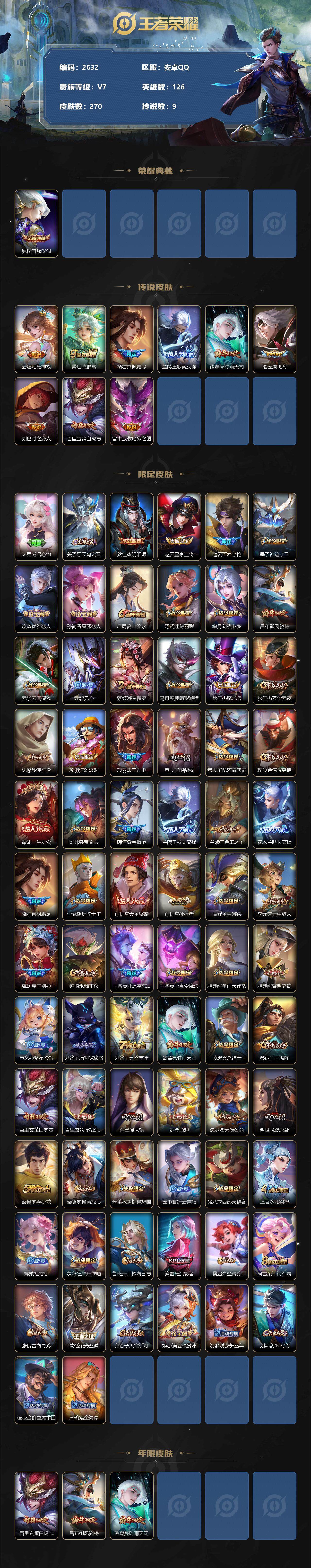 [14326310]安卓q-v7-最强王者段位-126英雄-270皮肤-1典藏-0珍品无双-0无双-0珍品传说-9传说-86史诗 【英雄全皮】:橘右京全皮,鬼谷子全皮,蒙恬全皮,影全皮 【荣耀典藏】:铠银白咏叹调 【传说皮肤】:云缨幻光神呛,桑启鸣野蒿,橘右京枫霜尽,兰陵王默契交锋,诸葛亮时雨天司,曜云鹰飞将,刘备时之恋人,百里玄策白虎志,宫本武藏地狱之眼 【限定皮肤】:大乔绒语心约,姜子牙天穹之誓,狄仁杰阴阳师,赵云皇家上将,赵云百木心呛,墨子神迹守卫,嬴政优雅恋人,孙尚香蔷薇恋人,庄周高山流水,阿轲迷踪丽影,芈月幻夜卜梦,吕布御风骁将,元歌云间偶戏,元歌无心,甄姬游园惊梦,马可波罗暗影游猎,狄仁杰魔术师,狄仁杰万华元夜,达摩沙漠行僧,项羽海滩派对,项羽霸王别姬,老夫子醍醐杖,老夫子航海奇遇记,程咬金演武夺筹,露娜一生所爱,刘邦夺宝奇兵,韩信傲雪梅呛,兰陵王默契交锋,兰陵王金庭之子,花木兰默契交锋,橘右京枫霜尽,亚瑟潮玩骑士王,孙悟空大圣娶亲,孙悟空孙行者,后羿圣弓游侠,李元芳云中旅人,虞姬霸王别姬,钟馗驱傩正仪,干将莫邪冰霜恋舞曲,干将莫邪真爱魔法,雅典娜单词大作战,雅典娜黎明之约,蔡文姬繁星吟游,鬼谷子原初探秘者,鬼谷子五谷丰年,诸葛亮时雨天司,黄忠火炮绅士,苏烈千军破阵,百里玄策白虎志,百里玄策原初追逐者,弈星混沌棋,梦奇顽趣,沈梦溪大漠名商,明世隐疑决卦,裴擒虎李小龙,裴擒虎擒涛扼浪,米莱狄胡桃异想国,云中君纤云弄巧,猪八戒西部大镖客,上官婉儿梁祝,嫦娥拒霜思,蒙犽狂想玩偶喵,鲁班大师探海日志,镜匿光追影者,桑启海盐诗旅,阿古朵江河有灵,张良古海寻踪,蒙恬荣光圣徽,鬼谷子天穹祈灯,姬小满妄想食味,沈梦溪龙舞盛年,刘邦剑破天穹,程咬金群星魔术团,周瑜熔金海岸 【年限皮肤】:百里玄策白虎志,吕布御风骁将,诸葛亮时雨天司 【赛季限定】:狄仁杰万华元夜,达摩沙漠行僧,老夫子醍醐杖,程咬金演武夺筹,兰陵王金庭之子,张良古海寻踪,李元芳云中旅人,钟馗驱傩正仪,雅典娜黎明之约,鬼谷子原初探秘者,苏烈千军破阵,百里玄策原初追逐者,弈星混沌棋,梦奇顽趣,沈梦溪大漠名商,明世隐疑决卦,裴擒虎擒涛扼浪,鲁班大师探海日志,桑启海盐诗旅,鬼谷子天穹祈灯,蒙恬荣光圣徽,刘邦剑破天穹,姜子牙天穹之誓 【战令限定】:墨子神迹守卫,阿轲迷踪丽影,芈月幻夜卜梦,元歌云间偶戏,马可波罗暗影游猎,老夫子航海奇遇记