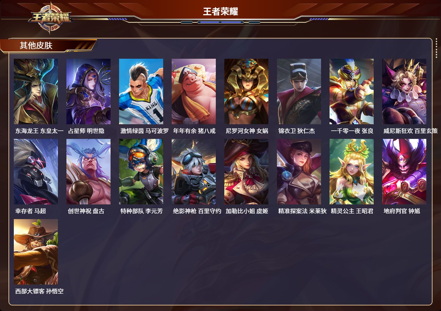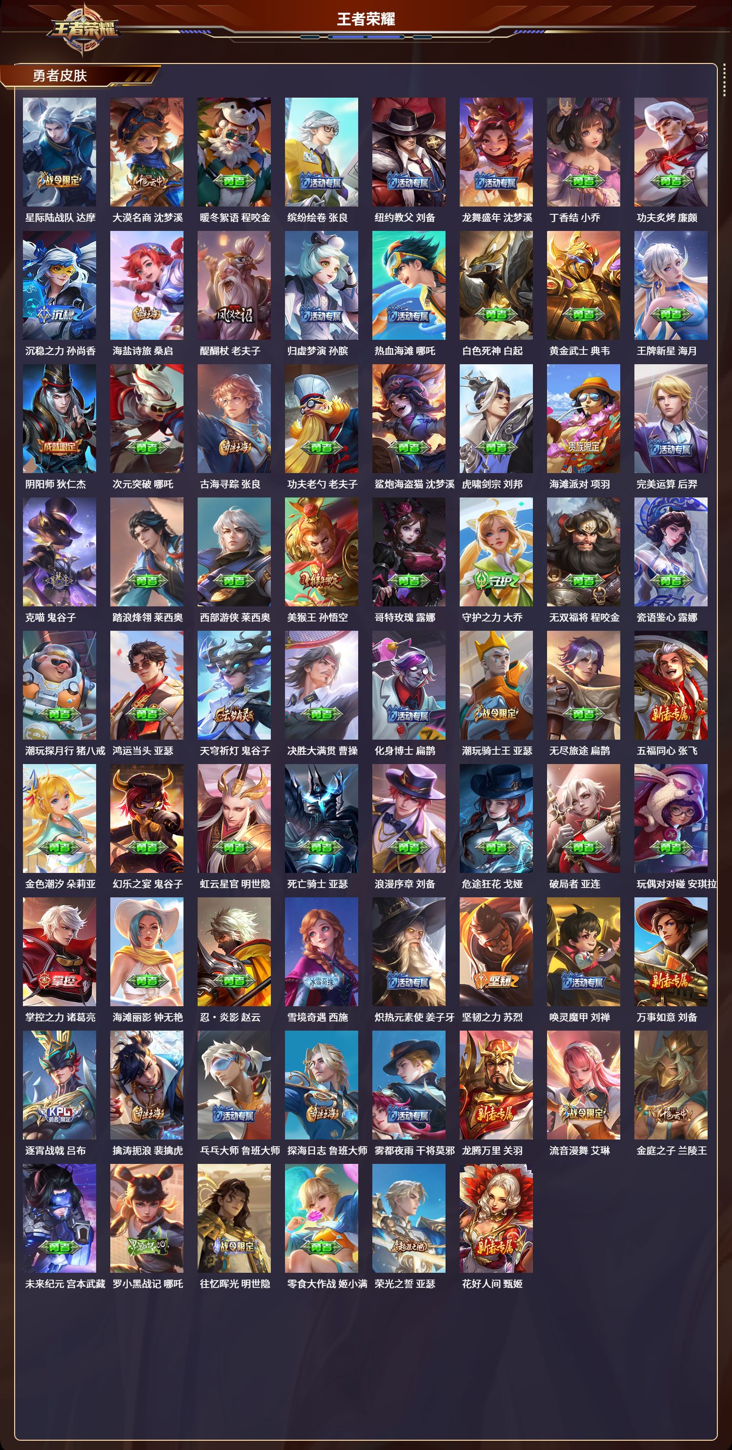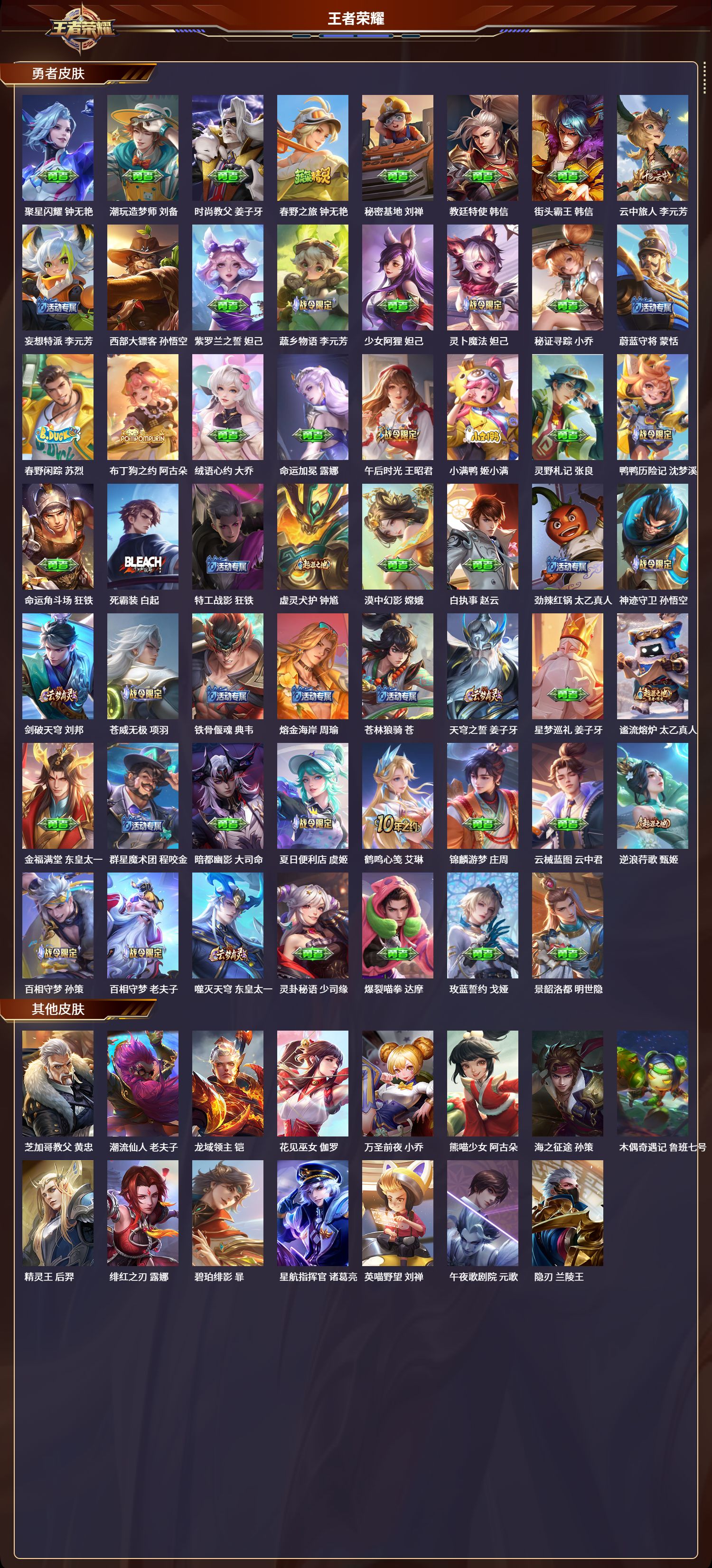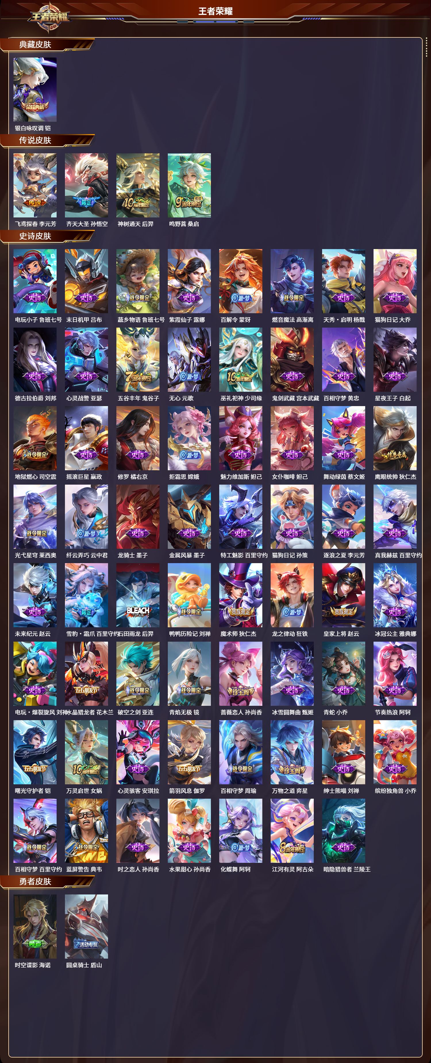 安卓qq/最强王者/226皮肤/123英雄/1典藏/0珍品无双/0无双/0珍品传说/4传说/63史诗/7稀有英雄【1 典藏皮肤】银白咏叹调 铠【4 传说皮肤】飞鸢探春 李元芳齐天大圣 孙悟空神树通天 后羿鸣野蒿 桑启【63 史诗皮肤】电玩小子 鲁班七号末日机甲 吕布蔬乡物语 鲁班七号紫霞仙子 露娜百解令 蒙犽燃音魔法 高渐离天秀·启明 杨戬猫狗日记 大乔德古拉伯爵 刘邦