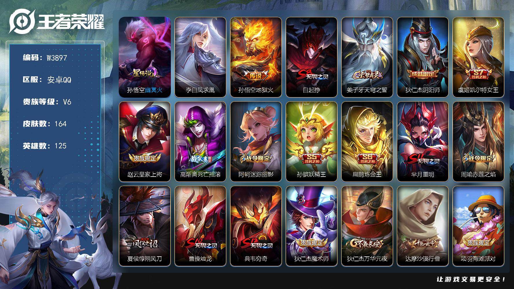 【w3897】极品打野号-亮点-满铭文.【优质皮肤】凤求凰.地狱火.幽冥火.安卓q-可二次-贵6-125英雄-164皮肤-1星元-2传说-54限定-贵族积分1.5万-营地id:368694810 【星元皮肤】:孙悟空幽冥火
