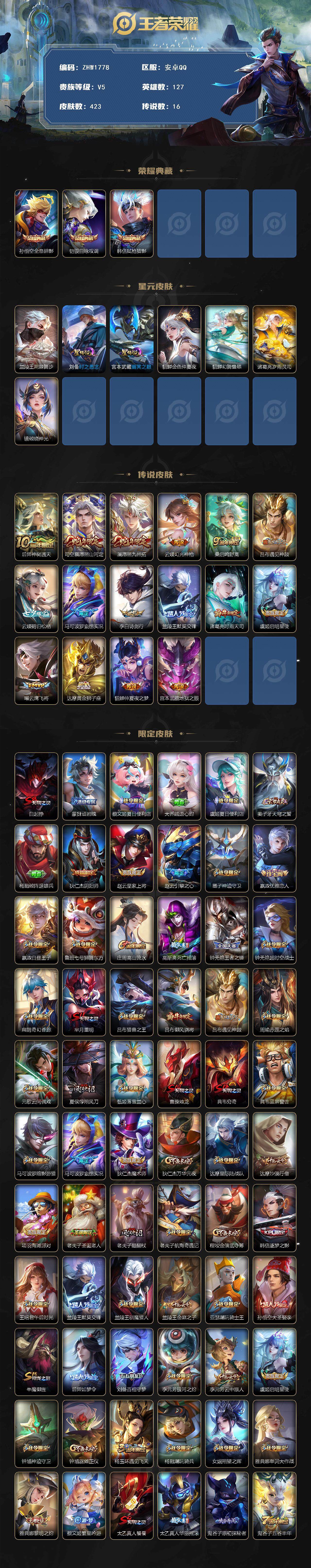 可二次【店主推荐捡漏号!可直接换绑】安卓q-v5-至尊星耀iv段位-127英雄-423皮肤-3典藏皮肤-16传说-125史诗-7星元 【英雄全皮】:达摩全皮,孙权全皮,钟馗全皮,太乙真人全皮,鬼谷子全皮,苏烈全皮,狂铁全皮,猪八戒全皮,蒙恬全皮,司空震全皮,赵怀真全皮,戈娅全皮,空空儿全皮,影全皮 【荣耀典藏】:孙悟空全息碎影,铠银白咏叹调,韩信弑呛猎影 【传说皮肤】:后羿神树通天,司空震愿照山河定,澜愿照九州拓,云缨幻光神呛,桑启鸣野蒿,吕布遇见神鼓,云缨鹤归松栖,马可波罗妄想实况,李白诗剑行,兰陵王默契交锋,诸葛亮时雨天司,虞姬启明星使,曜云鹰飞将,达摩黄金狮子座,貂蝉仲夏夜之梦,宫本武藏地狱之眼 【限定皮肤】:白起狰,蒙犽顽岩魄,蔡文姬夏日便利店,大乔绒语心约,虞姬夏日便利店,姜子牙天穹之誓,杨戬破阵退雄兵,狄仁杰阴阳师,赵云皇家上将,赵云引擎之心,墨子神迹守卫,嬴政优雅恋人,嬴政白昼王子,鲁班七号狮舞东方,庄周高山流水,高渐离死亡摇滚,钟无艳王者之锤,钟无艳超时空战士,扁鹊奇幻香踪,芈月重明,吕布猎兽之王,吕布御风骁将,吕布遇见神鼓,周瑜赤莲之焰,元歌云间偶戏,夏侯惇朔风刀,甄姬落雪兰心,曹操烛龙,典韦穷奇,典韦蓝屏警告,马可波罗暗影游猎,马可波罗妄想实况,狄仁杰魔术师,狄仁杰万华元夜,达摩星际陆战队,达摩沙漠行僧,项羽海滩派对,老夫子圣诞老人,老夫子醍醐杖,老夫子航海奇遇记,程咬金演武夺筹,韩信逐梦之影,王昭君午后时光,兰陵王默契交锋,兰陵王驯魔猎人,兰陵王金庭之子,亚瑟潮玩骑士王,孙悟空大圣娶亲,牛魔御旌,后羿如梦令,刘备百相守梦,李元芳银河之约,李元芳云中旅人,虞姬启明星使,钟馗神迹守卫,钟馗驱傩正仪,杨玉环遇见飞天,杨戬潮玩骑兵,女娲朔望之晖,雅典娜单词大作战,雅典娜黎明之约,蔡文姬繁星吟游,太乙真人饕餮,太乙真人华丽摇滚,鬼谷子原初探秘者,鬼谷子五谷丰年,诸葛亮时雨天司,苏烈玄武志,苏烈千军破阵,百里玄策原初追逐者,弈星混沌棋,梦奇顽趣,沈梦溪大漠名商,明世隐疑决卦,裴擒虎天狼狩猎者,裴擒虎李小龙,裴擒虎擒涛扼浪,狂铁御狮,狂铁电玩高手,米莱狄御霄,米莱狄胡桃异想国,云中君纤云弄巧,盾山御銮,猪八戒西部大镖客,猪八戒猪悟能,上官婉儿梁祝,嫦娥拒霜思,嫦娥暖冬兔眠,西施玲珑珍味,蒙犽狂想玩偶喵,鲁班大师探海日志,桑启海盐诗旅,暃星界游侠,戈娅驭风魔法,艾琳女武神,艾琳流音漫舞,赵怀真鹤归松栖,云缨鹤归松栖,司空震地狱燃心,阿古朵江河有灵,张良古海寻踪,蒙犽百解令,蒙恬荣光圣徽,高渐离燃音魔法,妲己灵卜魔法,鬼谷子天穹祈灯,姬小满妄想食味,沈梦溪龙舞盛年,鲁班七号蔬乡物语,李元芳蔬乡物语,刘邦剑破天穹,程咬金群星魔术团,镜青焰无极,项羽苍威无极,刘备异域游侠,周瑜熔金海岸 【年限皮肤】:苏烈玄武志,吕布御风骁将,诸葛亮时雨天司 【赛季限定】:白起狰,芈月重明,夏侯惇朔风刀,曹操烛龙,典韦穷奇,狄仁杰万华元夜,达摩沙漠行僧,老夫子醍醐杖,程咬金演武夺筹,兰陵王金庭之子,张良古海寻踪,牛魔御旌,李元芳云中旅人,钟馗驱傩正仪,雅典娜黎明之约,太乙真人饕餮,鬼谷子原初探秘者,苏烈千军破阵,百里玄策原初追逐者,弈星混沌棋,梦奇顽趣,沈梦溪大漠名商,明世隐疑决卦,裴擒虎擒涛扼浪,狂铁御狮,米莱狄御霄,盾山御銮,鲁班大师探海日志,桑启海盐诗旅,鬼谷子天穹祈灯,蒙恬荣光圣徽,刘邦剑破天穹,姜子牙天穹之誓 【战令限定】:墨子神迹守卫,蔡文姬夏日便利店,虞姬夏日便利店,嬴政白昼王子,鲁班七号狮舞东方,钟无艳超时空战士,扁鹊奇幻香踪,吕布猎兽之王,周瑜赤莲之焰,元歌云间偶戏,甄姬落雪兰心,典韦蓝屏警告,马可波罗暗影游猎,达摩星际陆战队,老夫子航海奇遇记,王昭君午后时光,兰陵王驯魔猎人,艾琳流音漫舞,亚瑟潮玩骑士王,李元芳银河之约,钟馗神迹守卫,杨戬潮玩骑兵,女娲朔望之晖,雅典娜单词大作战,狂铁电玩高手,米莱狄胡桃异想国,猪八戒西部大镖客,嫦娥暖冬兔眠,西施玲珑珍味,蒙犽狂想玩偶喵,司空震地狱燃心,暃星界游侠,戈娅驭风魔法,高渐离燃音魔法,妲己灵卜魔法,鲁班七号蔬乡物语,李元芳蔬乡物语,镜青焰无极,项羽苍威无极 【史诗皮肤】:鲁班七号电玩小子,项羽苍穹之光,露娜紫霞仙子,阿轲暗夜猫娘,钟无艳王者之锤,赵云皇家上将,赵云未来纪元,貂蝉圣诞恋歌,老夫子圣诞老人,甄姬冰雪圆舞曲,王昭君偶像歌手,狄仁杰魔术师,廉颇地狱岩魂,宫本武藏鬼剑武藏,孙尚香水果甜心,嬴政优雅恋人,嬴政暗夜贵公子,嬴政摇滚巨星,妲己魅力维加斯,妲己女仆咖啡,墨子龙骑士,墨子金属风暴,吕布圣诞狂欢,刘禅绅士熊喵,曹操幽灵船长,李白千年之狐,吕布末日机甲,张飞乱世虎臣,赵云引擎之心,花木兰水晶猎龙者,刘邦德古拉伯爵,韩信逐梦之影,夏侯惇乘风破浪,小乔缤纷独角兽,兰陵王暗隐猎兽者,诸葛亮黄金分割率,亚瑟心灵战警,雅典娜冰冠公主,安琪拉心灵骇客,百里守约特工魅影,铠曙光守护者,蔡文姬舞动绿茵,刘禅天才门将,李元芳逐浪之夏,程咬金功夫厨神,白起星夜王子,阿轲节奏热浪,杨玉环遇见飞天,嬴政白昼王子,孙策猫狗日记,大乔猫狗日记,孙悟空大圣娶亲,苏烈玄武志,典韦蓝屏警告,伽罗箭羽风息,裴擒虎天狼狩猎者,鲁班七号狮舞东方,狄仁杰鹰眼统帅,公孙离无限星赏官,兰陵王驯魔猎人,上官婉儿梁祝,蔡文姬繁星吟游,李元芳银
