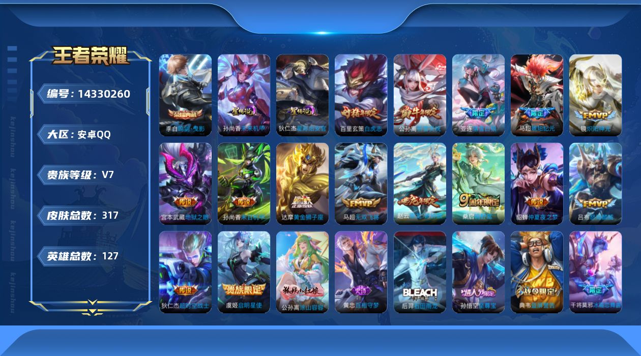[14330260]可二次【店主推荐捡漏号!可直接换绑】安卓q-v7-最强王者段位-127英雄-317皮肤-1典藏皮肤-2星传说-15传说-105史诗 【英雄全皮】:金蝉全皮,戈娅全皮,空空儿全皮 【荣耀典藏】:李白鸣剑曳影 【传说皮肤】:桑启鸣野蒿,亚连落雪白狼,赵云乘龙铭钟鼎,马超琥珀纪元,吕布怒海麟威,马超无双飞将,公孙离祈雪灵祝,镜炽阳神光,虞姬启明星使,达摩黄金狮子座,百里玄策白虎志,貂蝉仲夏夜之梦,孙尚香末日机甲,宫本武藏地狱之眼,狄仁杰超时空战士 【限定皮肤】:大乔绒语心约,姜子牙天穹之誓,狄仁杰阴阳师,赵云皇家上将,墨子神迹守卫,嬴政优雅恋人,嬴政白昼王子,孙尚香蔷薇恋人,鲁班七号狮舞东方,庄周云端筑梦师,庄周高山流水,阿轲迷踪丽影,孙膑天狼运算者,吕布猎兽之王,吕布御风骁将,元歌云间偶戏,元歌无心,夏侯惇朔风刀,典韦穷奇,典韦蓝屏警告,马可波罗暗影游猎,狄仁杰魔术师,狄仁杰万华元夜,达摩星际陆战队,达摩沙漠行僧,项羽海滩派对,老夫子醍醐杖,老夫子航海奇遇记,关羽冰锋战神,程咬金演武夺筹,刘邦夺宝奇兵,王昭君午后时光,兰陵王金庭之子,亚瑟潮玩骑士王,孙悟空至尊宝,牛魔御旌,李元芳银河之约,李元芳云中旅人,虞姬启明星使,钟馗神迹守卫,钟馗驱傩正仪,杨玉环遇见飞天,女娲朔望之晖,干将莫邪冰霜恋舞曲,雅典娜单词大作战,雅典娜黎明之约,蔡文姬繁星吟游,太乙真人华丽摇滚,鬼谷子原初探秘者,鬼谷子五谷丰年,苏烈千军破阵,百里玄策白虎志,百里玄策原初追逐者,弈星混沌棋,公孙离蜜橘之夏,公孙离祈雪灵祝,公孙离玉兔公主,沈梦溪星空之诺,沈梦溪大漠名商,明世隐疑决卦,裴擒虎李小龙,裴擒虎擒涛扼浪,狂铁御狮,狂铁电玩高手,米莱狄御霄,米莱狄胡桃异想国,云中君纤云弄巧,伽罗天狼溯光者,盾山御銮,猪八戒猪悟能,上官婉儿梁祝,上官婉儿天狼绘梦者,嫦娥拒霜思,西施玲珑珍味,蒙犽狂想玩偶喵,鲁班大师探海日志,镜匿光追影者,桑启海盐诗旅,金蝉唐三藏,戈娅驭风魔法,艾琳女武神,艾琳流音漫舞,赵怀真鹤归松栖,司空震地狱燃心,阿古朵江河有灵,张良古海寻踪,蒙犽百解令,鬼谷子天穹祈灯,马超琥珀纪元,姬小满妄想食味,赵云乘龙铭钟鼎,亚连落雪白狼,沈梦溪龙舞盛年,鲁班七号蔬乡物语,李元芳蔬乡物语,刘邦剑破天穹,程咬金群星魔术团,关羽决胜骁骑,镜青焰无极,项羽苍威无极,周瑜熔金海岸 【年限皮肤】:百里玄策白虎志,公