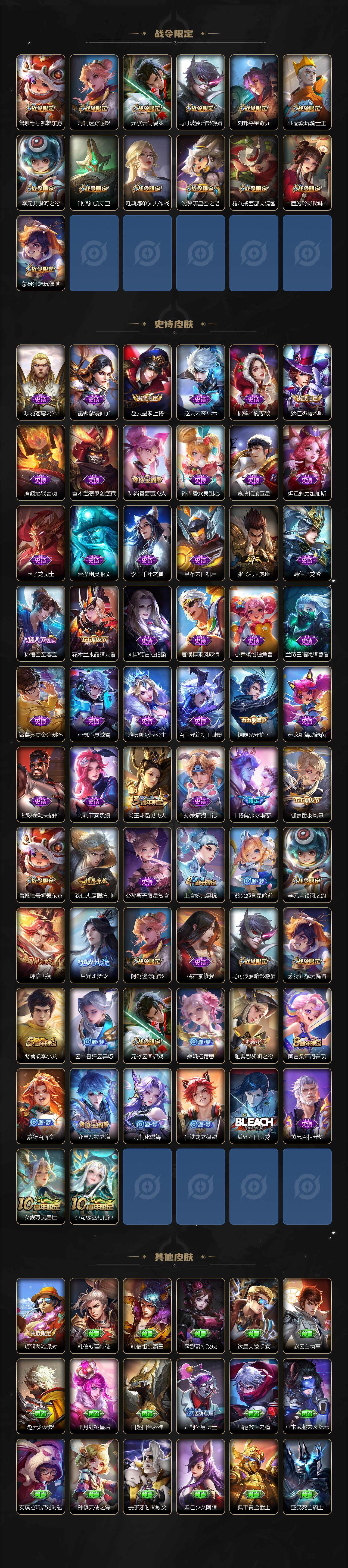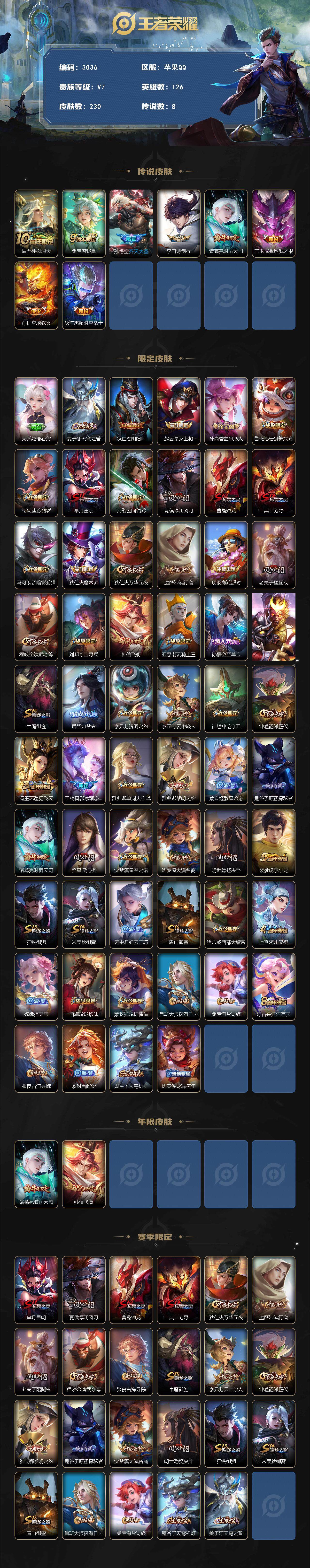 [14331770]苹果q-v7-最强王者段位-126英雄-230皮肤-0典藏-0珍品无双-0无双-0珍品传说-8传说-62史诗 【传说皮肤】:后羿神树通天,桑启鸣野蒿,孙悟空齐天大圣,李白诗剑行,诸葛亮时雨天司,宫本武藏地狱之眼,孙悟空地狱火,狄仁杰超时空战士 【限定皮肤】:大乔绒语心约,姜子牙天穹之誓,狄仁杰阴阳师,赵云皇家上将,孙尚香蔷薇恋人,鲁班七号狮舞东方,阿轲迷踪丽影,芈月重明,元歌云间偶戏,夏侯惇朔风刀,曹操烛龙,典韦穷奇,马可波罗暗影游猎,狄仁杰魔术师,狄仁杰万华元夜,达摩沙漠行僧,项羽海滩派对,老夫子醍醐杖,程咬金演武夺筹,刘邦夺宝奇兵,韩信飞衡,亚瑟潮玩骑士王,孙悟空至尊宝,孙悟空齐天大圣,牛魔御旌,后羿如梦令,李元芳银河之约,李元芳云中旅人,钟馗神迹守卫,钟馗驱傩正仪,杨玉环遇见飞天,干将莫邪冰霜恋舞曲,雅典娜单词大作战,雅典娜黎明之约,蔡文姬繁星吟游,鬼谷子原初探秘者,诸葛亮时雨天司,弈星混沌棋,沈梦溪星空之诺,沈梦溪大漠名商,明世隐疑决卦,裴擒虎李小龙,狂铁御狮,米莱狄御霄,云中君纤云弄巧,盾山御銮,猪八戒西部大镖客,上官婉儿梁祝,嫦娥拒霜思,西施玲珑珍味,蒙犽狂想玩偶喵,鲁班大师探海日志,桑启海盐诗旅,阿古朵江河有灵,张良古海寻踪,蒙犽百解令,鬼谷子天穹祈灯,沈梦溪龙舞盛年 【年限皮肤】:诸葛亮时雨天司,韩信飞衡 【赛季限定】:芈月重明,夏侯惇朔风刀,曹操烛龙,典韦穷奇,狄仁杰万华元夜,达摩沙漠行僧,老夫子醍醐杖,程咬金演武夺筹,张良古海寻踪,牛魔御旌,李元芳云中旅人,钟馗驱傩正仪,雅典娜黎明之约,鬼谷子原初探秘者,弈星混沌棋,沈梦溪大漠名商,明世隐疑决卦,狂铁御狮,米莱狄御霄,盾山御銮,鲁班大师探海日志,桑启海盐诗旅,鬼谷子天穹祈灯,姜子牙天穹之誓 【战令限定】:鲁班七号狮舞东方,阿轲迷踪丽影,元歌云间偶戏,马可波罗暗影游猎,刘邦夺宝奇兵,亚瑟潮玩骑士王,李元芳银河之约,钟馗神迹守卫,雅典娜单词大作战,沈梦溪星空之诺,猪八戒西部大镖客,西施玲珑珍味,蒙犽狂想玩偶喵 【史诗皮肤】:项羽苍穹之光,露娜紫霞仙子,赵云皇家上将,赵云未来纪元,貂蝉圣诞恋歌,狄仁杰魔术师,廉颇地狱岩魂,宫本武藏鬼剑武藏,孙尚香蔷薇恋人,孙尚香水果甜心,嬴政摇滚巨星,妲己魅力维加斯,墨子龙骑士,曹操幽灵船长,李白千年之狐,吕布末日机甲,张飞乱世虎臣,韩信白龙吟,孙悟空至尊宝,花木兰水