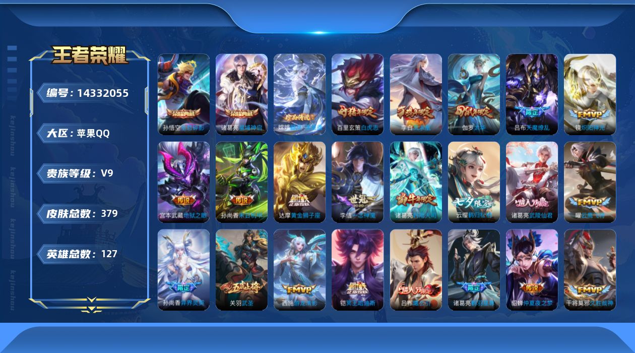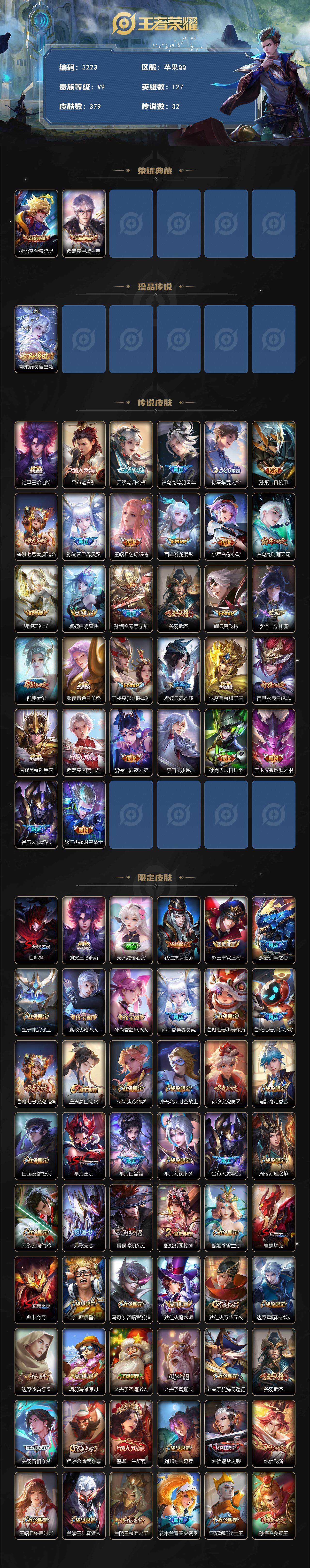 [14332055]苹果q-v9-最强王者段位-127英雄-379皮肤-2典藏皮肤-1珍品传说-32传说-115史诗 【英雄全皮】:达摩全皮,刘邦全皮,猪八戒全皮 【荣耀典藏】:孙悟空全息碎影,诸葛亮星域神启 【珍品传说】:嫦娥器灵落星盏 【传说皮肤】:铠冥王哈迪斯,吕布曦玄引,云缨鹤归松栖,诸葛亮鹤羽星尊,孙策挚爱之约,孙策末日机甲,鲁班七号寅虎瑞焰,孙尚香异界灵契,王昭君乞巧织情,西施游龙清影,小乔音你心动,诸葛亮时雨天司,镜炽阳神光,虞姬启明星使,孙悟空零号赤焰,关羽武圣,曜云鹰飞将,李信一念神魔,伽罗太华,张良黄金白羊座,干将莫邪久胜战神,虞姬云霓雀翎,达摩黄金狮子座,百里玄策白虎志,后羿黄金射手座,诸葛亮武陵仙君,貂蝉仲夏夜之梦,李白凤求凰,孙尚香末日机甲,宫本武藏地狱之眼,吕布天魔缭乱,狄仁杰超时空战士 【限定皮肤】:白起狰,铠冥王哈迪斯,大乔绒语心约,狄仁杰阴阳师,赵云皇家上将,赵云引擎之心,墨子神迹守卫,嬴政优雅恋人,孙尚香蔷薇恋人,孙尚香异界灵契,鲁班七号狮舞东方,鲁班七号乒乒小将,鲁班七号寅虎瑞焰,庄周高山流水,阿轲迷踪丽影,钟无艳超时空战士,孙膑寅虎展翼,扁鹊奇幻香踪,白起夜都怪侠,芈月重明,芈月白晶晶,芈月幻夜卜梦,吕布天魔缭乱,周瑜赤莲之焰,元歌云间偶戏,元歌无心,夏侯惇朔风刀,甄姬游园惊梦,甄姬落雪兰心,曹操烛龙,典韦穷奇,典韦蓝屏警告,马可波罗暗影游猎,狄仁杰魔术师,狄仁杰万华元夜,达摩星际陆战队,达摩沙漠行僧,项羽海滩派对,老夫子圣诞老人,老夫子醍醐杖,老夫子航海奇遇记,关羽武圣,关羽百相守梦,程咬金演武夺筹,露娜一生所爱,刘邦夺宝奇兵,韩信逐梦之影,韩信飞衡,王昭君午后时光,兰陵王驯魔猎人,兰陵王金庭之子,花木兰青春决赛季,亚瑟潮玩骑士王,孙悟空美猴王,孙悟空至尊宝,孙悟空大圣娶亲,孙悟空零号赤焰,孙悟空孙行者,牛魔御旌,后羿圣弓游侠,刘备百相守梦,李元芳银河之约,李元芳云中旅人,虞姬霸王别姬,虞姬启明星使,钟馗神迹守卫,钟馗驱傩正仪,杨玉环遇见飞天,杨戬潮玩骑兵,女娲朔望之晖,干将莫邪真爱魔法,雅典娜单词大作战,雅典娜黎明之约,蔡文姬繁星吟游,太乙真人饕餮,鬼谷子原初探秘者,鬼谷子五谷丰年,诸葛亮武陵仙君,诸葛亮时雨天司,诸葛亮鹤羽星尊,大乔白鹤梁神女,黄忠火炮绅士,苏烈千军破阵,百里玄策白虎志,百里玄策原初追逐者,百里守约朱雀志,弈星混沌棋,梦奇