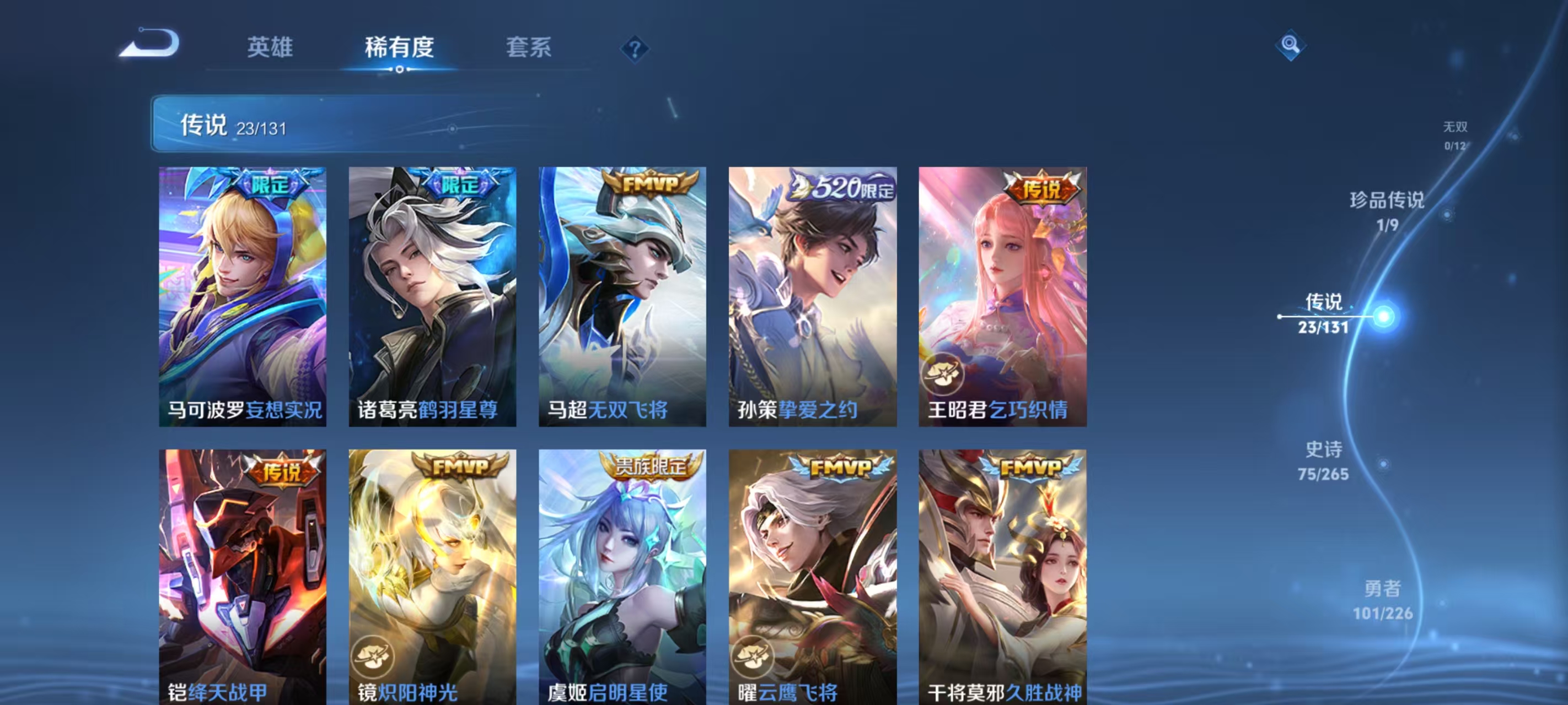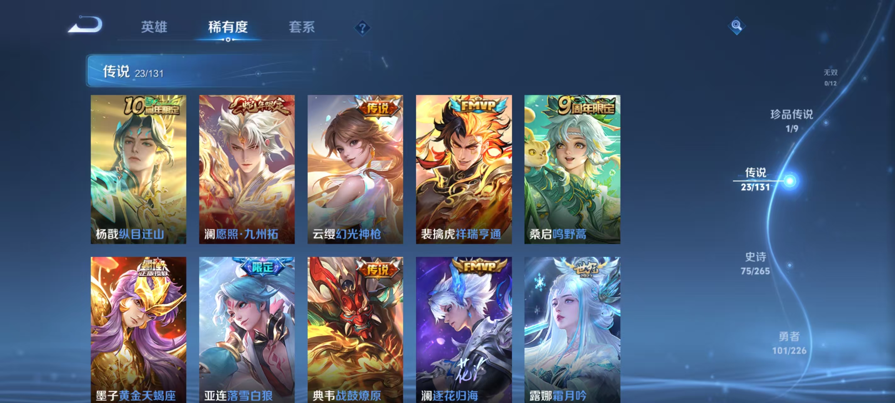 234皮肤 1典藏1珍品23传说 弑呛猎影 黑崎一护 纵目迁山,乞巧织情,末日机甲,绛天战甲,落雪白狼,霜月吟,启明星使,无双飞将,炽阳神光,妄想实况,久胜战神,战鼓燎原,祥瑞亨通,黄金天蝎座,云鹰飞将,地狱之眼,幻光神呛,逐花归海,愿照·九州拓,黄金狮子座,鸣野蒿,挚爱之约,鹤羽星尊