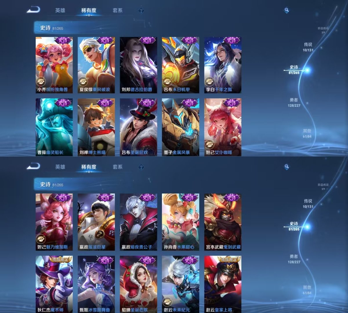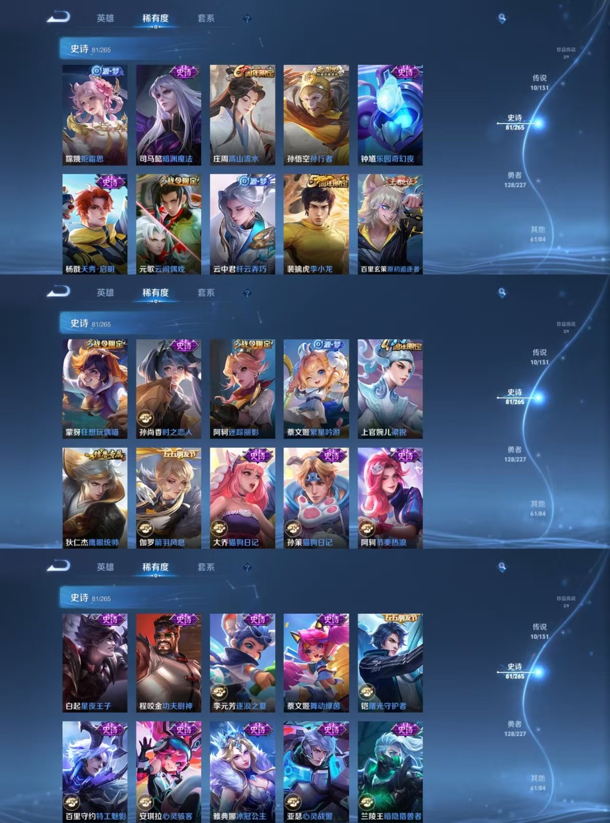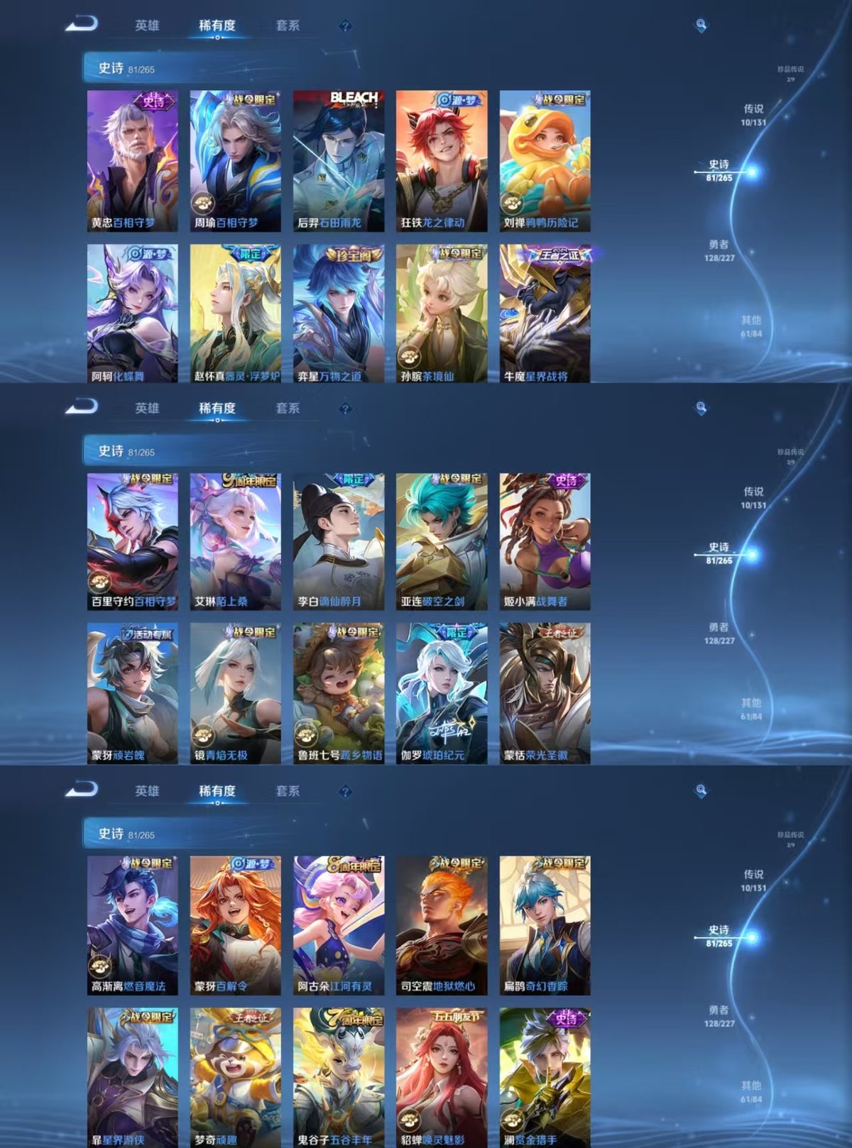 _2292217-实名:可修改贵族等级:v7英雄数:127皮肤数:284荣耀水晶:鸣剑·曳影拾光映像珍品传说:怪盗基德时之奇旅-孙策传说皮:猫影幻舞地狱火淬星耀世无双飞将澜逐花归海幻光神呛神树通天限定皮:李小龙梁祝白虎志高山流水孙行者五谷丰年鸣野蒿陌上桑逐霄战戟愿照·九州拓