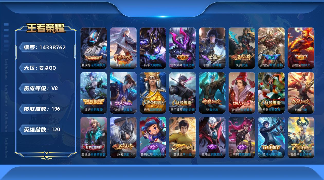 [14338762]v8 1典藏 8传说 120英雄 196皮肤 可修改实名 【稀有英雄】:嬴政始皇帝韩信韩跳跳夏洛特夏师傅艾琳橘右京橘子娜可露露鸟人不知火舞赵云金蝉唐僧戈娅 【荣耀水晶】:无限飓风号高达 【传说皮】:零号·赤焰地狱火地狱之眼一念神魔 【珍宝阁皮】:优雅恋人 【赛季/战令皮】:古海寻踪s33海盐诗旅s30擒涛扼浪s31探海日志s32顽趣-梦奇剑破天穹s35天穹祈灯s34炼金王s6凯尔特女王s7狰s8饕餮s9烛龙s10重明s11穷奇s12御狮s13御霄s14御旌s15御銮s16朔风刀s17混沌棋s18疑决卦s19醍醐杖s20原初探秘者s21万华元夜s22演武夺筹s23驱傩正仪s24千军破阵s25猎兽之王白昼王子朔望之晖蓝屏警告神迹守卫-钟馗狮舞东方赤莲之焰驯魔猎人星空之诺银河之约西部大镖客-猪八戒暗影游猎游乐娃子单词大作战狂想玩偶喵潮玩骑士王云间偶戏沙漠行僧s26金庭之子s27大漠名商s28云中旅人s29 【史诗皮】:电玩小子小书包白龙吟特工魅影千年之狐龙骑士小龙虾冰冠公主偶像歌手电玩·爆裂旋风暗夜猫娘摇滚巨星水果甜心星夜王子德古拉伯爵暗隐猎兽者幽灵船长鬼剑武藏舞动绿茵纤云弄巧乘风破浪水晶猎龙者曙光守护者金属风暴圣诞狂欢圣诞恋歌鹰眼统帅魅力维加斯黎明之约未来纪元-赵云 【限定皮】:至尊宝凤求凰白切鸡飞衡韩信年限遇见飞天五谷丰年青龙志铠年限武圣天狼运算者游园惊梦梁祝天狼狩猎者龙胆天狼溯光者李小龙逐梦之影大圣娶亲天魔缭乱 【普通皮】:春野之旅功夫炙烤完美运算鬼谷子天穹祈灯s34万事如意五福同心龙腾万里花好人间归虚梦演-孙膑归虚梦演-西施海滩丽影海滩派对皇家上将魔术师启明星使沉稳之力掌控之力守护之力坚韧之力霸王丸化身博士炽热元素使纽约教父特工战影圆桌骑士(盾山)乓乓大师万象初新次元突破大发明家天使之翼功夫老勺哥特玫瑰鲨炮海盗猫教廷特使进击