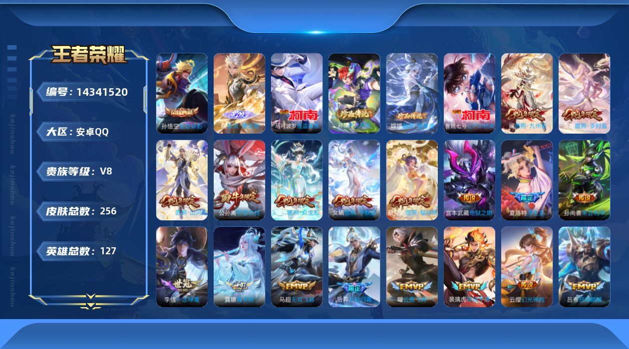 [14341520]可二次 贵族8 王者23星 贵族积分84986 安卓手q291区256皮1典藏24传说1无双4珍品传说v8 营地id2130338503无双王者【珍品传说皮肤】:器灵·落星盏时之奇旅江户川柯南怪盗基德【无双皮肤】:器灵·螭龙剑【荣耀典藏】:全息碎影【优质限定皮肤】:祈雪灵祝神威无双飞将至尊宝【传说皮肤】:地狱之眼愿照·福禄聚愿照·岁时盈千劫归真愿照·众生和