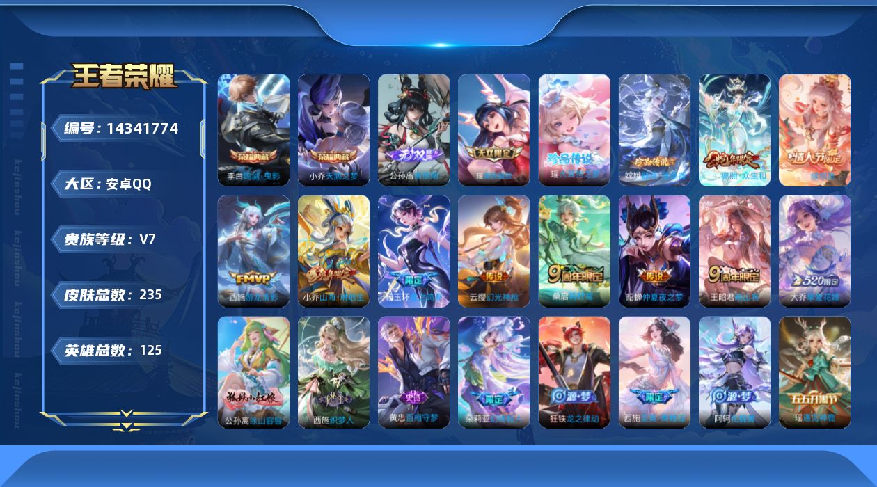 [14341774]贵族7-235皮2典藏10传说2无双2珍品传说-1个英雄全皮 安卓手q313区235皮2典藏10传说2无双2珍品传说v7 营地id2147311635最强王者【珍品传说皮肤】:器灵·落星盏大耳狗之梦【无双皮肤】:瑶真我赫兹离恨烟【荣耀典藏】:鸣剑·曳影天鹅之梦【优质限定皮肤】:山海·琳琅生【传说皮肤】:游龙清影仲夏夜之梦挚爱花嫁鸣野蒿幻光神呛愿照·众生和
