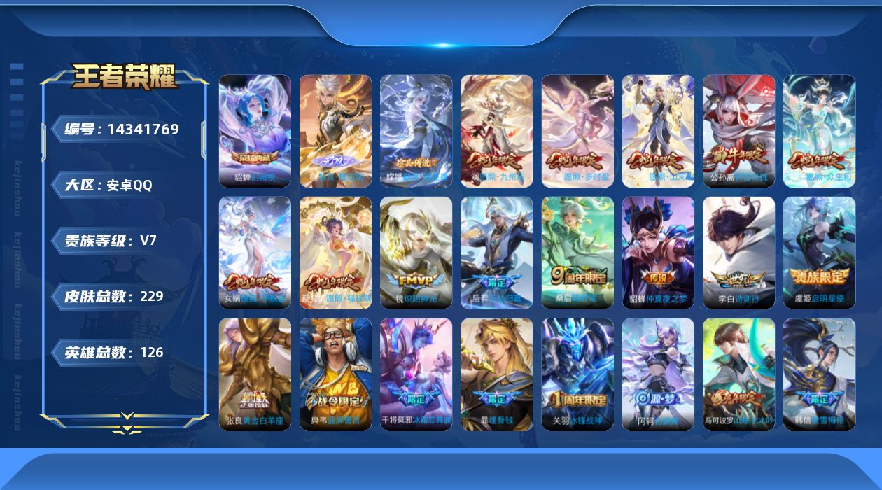 [14341769]可二次 贵族8-贵族积分50795-229皮1典藏15传说1无双1珍品传说 安卓手q136区229皮1典藏15传说1无双1珍品传说v7 营地id338073020无双王者【珍品传说皮肤】:器灵·落星盏【无双皮肤】:器灵·螭龙剑【荣耀典藏】:幻阙歌【优质限定皮肤】:祈雪灵祝【传说皮肤】:神树通天启明星使诗剑行千劫归真愿照·福禄聚愿照·山河定愿照·千秋盛愿照·岁时盈