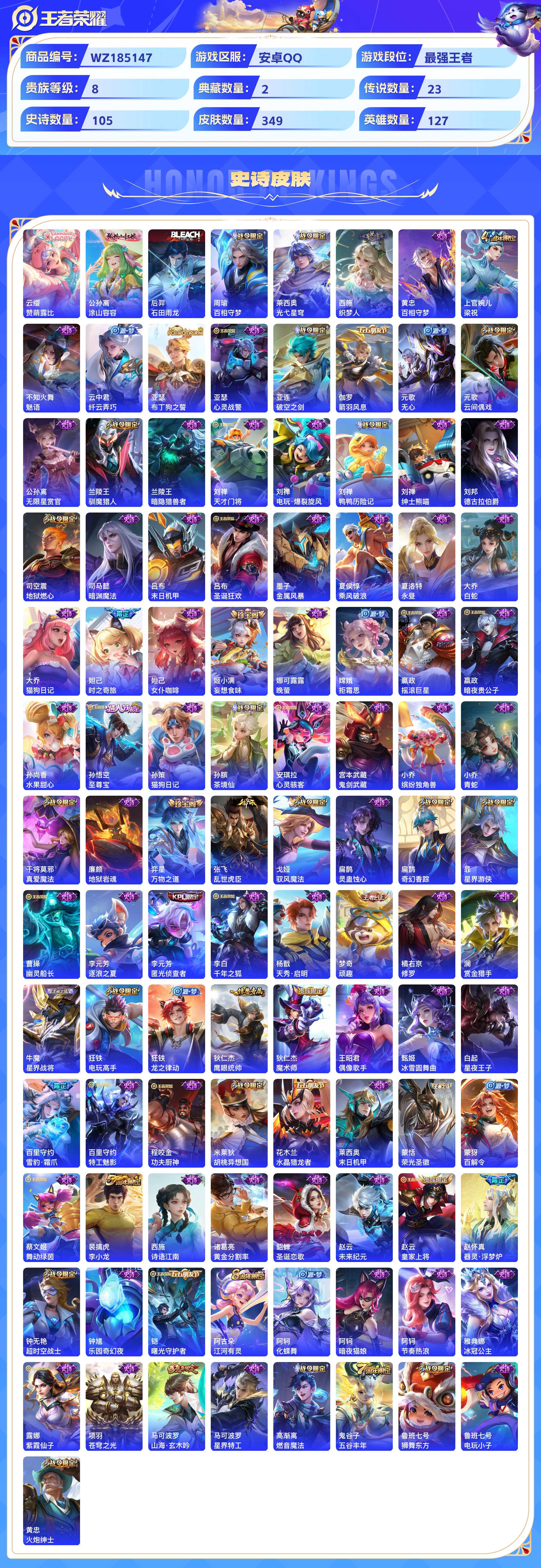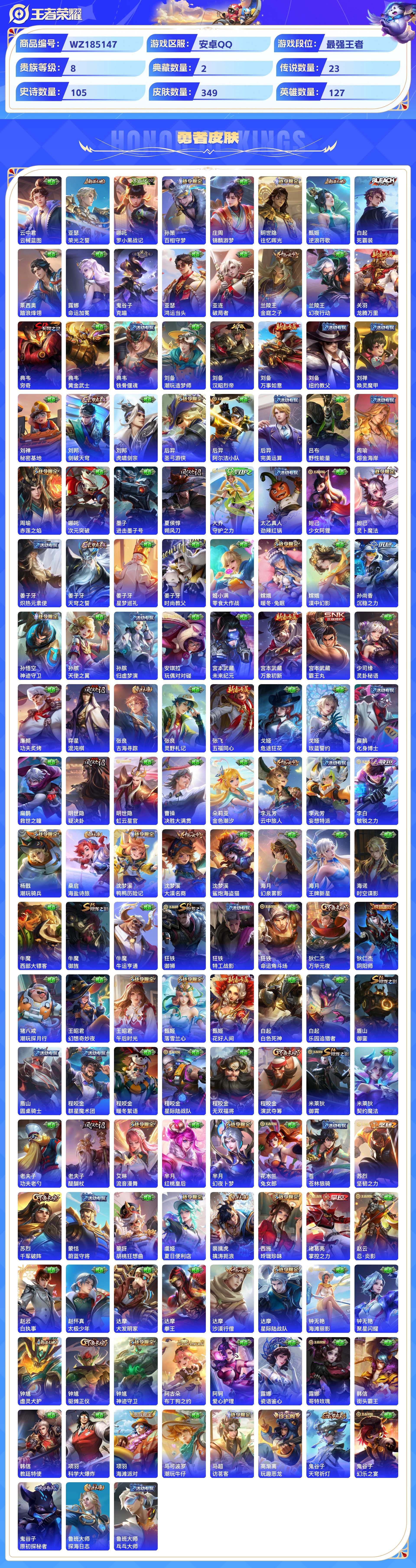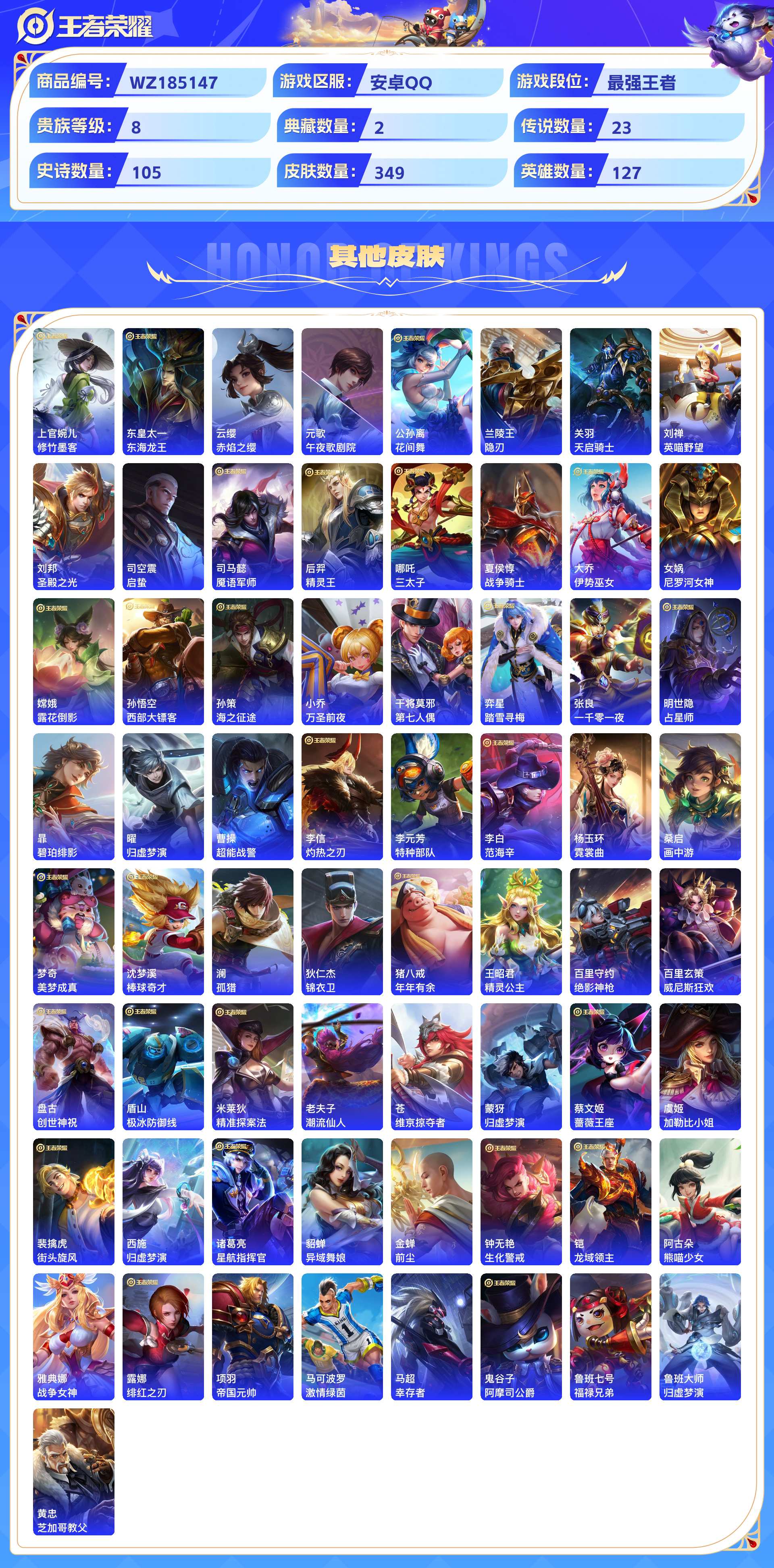 2280892-安卓qq 349皮 贵族8级 2典藏 2珍品传说 1无双 23传说 105史诗【荣耀典藏】鸣剑·曳影银白咏叹调【珍品传说】兔狲·蓬尾大耳狗之梦【无双限定】器灵·螭龙剑【传说皮肤】幻光神呛云诺千山时之恋人黄金射手座末日机甲齐天大圣地狱之眼音你心动画中仙云鹰飞将一念神魔鸣野蒿胖达荣荣愿照·九州拓乞巧织情云霓雀翎启明星使鹤羽星尊仲夏夜之梦黄