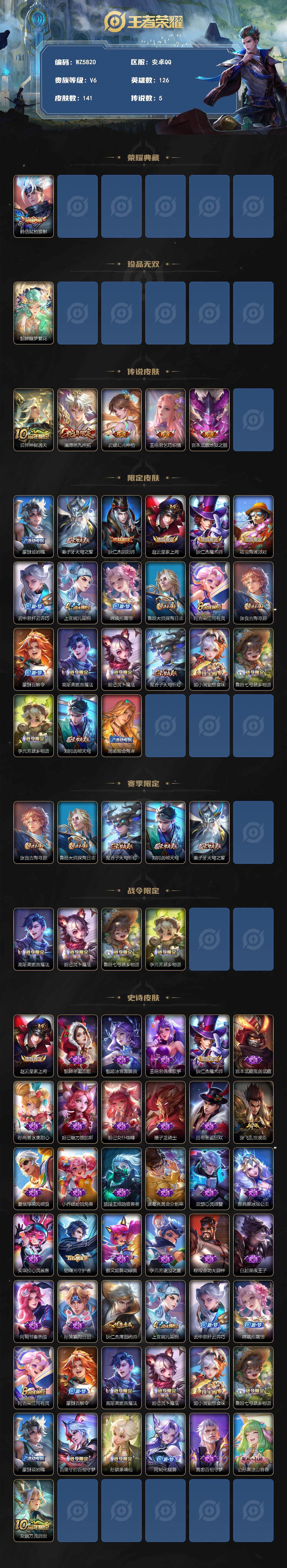 安卓q-v6-至尊星耀iv段位-126英雄-141皮肤-1典藏-1珍品无双-0无双-0珍品传说-5传说-42史诗 【荣耀典藏】:韩信弑呛猎影 【珍品无双】:貂蝉馥梦繁花 【传说皮肤】:后羿神树通天,澜愿照九州拓,云缨幻光神呛,王昭君乞巧织情,宫本武藏地狱之眼 【限定皮肤】:蒙犽顽岩魄,姜子牙天穹之誓,狄仁杰阴阳师,赵云皇家上将,狄仁杰魔术师,项羽海滩派对,云中君纤云弄巧,上官婉儿梁祝,嫦娥拒霜思,鲁班大师探海日志,阿古朵江河有灵,张良古海寻踪,蒙犽百解令,高渐离燃音魔法,妲己灵卜魔法,鬼谷子天穹祈灯,姬小满妄想食味,鲁班七号蔬乡物语,李元芳蔬乡物语,刘邦剑破天穹,周瑜熔金海岸 【赛季限定】:张良古海寻踪,鲁班大师探海日志,鬼谷子天穹祈灯,刘邦剑破天穹,姜子牙天穹之誓 【战令限定】:高渐离燃音魔法,妲己灵卜魔法,鲁班七号蔬乡物语,李元芳蔬乡物语 【史诗皮肤】:赵云皇家上将,貂蝉圣诞恋歌,甄姬冰雪圆舞曲,王昭君偶像歌手,狄仁杰魔术师,宫本武藏鬼剑武藏,孙尚香水果甜心,妲己魅力维加斯,妲己女仆咖啡,墨子龙骑士,吕布圣诞狂欢,张飞乱世虎臣,夏侯惇乘风破浪,小乔缤纷独角兽,兰陵王暗隐猎兽者,诸葛亮黄金分割率,亚瑟心灵战警,雅典娜冰冠公主,安琪拉心灵骇客,铠曙光守护者,蔡文姬舞动绿茵,李元芳逐浪之夏,程咬金功夫厨神,白起星夜王子,阿轲节奏热浪,孙策猫狗日记,狄仁杰鹰眼统帅,上官婉儿梁祝,云中君纤云弄巧,嫦娥拒霜思,阿古朵江河有灵,蒙犽百解令,妲己灵卜魔法,高渐离燃音魔法,姬小满妄想食味,鲁班七号蔬乡物语,蒙犽顽岩魄,百里守约百相守梦,孙膑茶境仙,阿轲化蝶舞,黄忠百相守梦,公孙离涂山容容,女娲万灵启世 【其他皮肤】:项羽海滩派对,韩信教廷特使,赵云白执事,赵云忍炎影,芈月红桃皇后,白起白色死神,亚瑟死亡骑士,达摩拳王,狄仁杰阴阳师,刘备汉昭烈帝,王昭君幻想奇妙夜,狂铁命运角斗场,明世隐虹云星官,吕布野性能量,狂铁特工战影,刘禅秘密基地,鲁班大师乓乓大师,程咬金无双福将,鲁班大师探海日志,李元芳妄想特派,张良古海寻踪,后羿完美运算,程咬金暖冬絮语,鬼谷子天穹祈灯,妲己灵卜魔法,海诺时空谍影,嫦娥漠中幻影,钟无艳春野之旅,李元芳蔬乡物语,刘邦剑破天穹,姜子牙天穹之誓,周瑜熔金海岸,盘古敬我三分,东皇太一噬灭天穹,老夫子百相守梦,干将莫邪雾都夜雨,太乙真人谧流熔炉,典韦铁骨偃魂,马超访茗客,西施雪境奇遇,姜子牙星梦巡礼,钟馗虚灵犬护,张良灵野札记,阿古朵布丁狗之约,露娜命运加冕,姬小满小满鸭,白起死霸装,甄姬逆浪荇歌,莱西奥踏浪烽翎,鬼谷子克喵,亚瑟荣光之誓,艾琳鹤鸣心笺,鲁班七号福禄兄弟,鲁班七号木偶奇遇记,高渐离金属狂潮,貂蝉异域舞娘,老夫子潮流仙人,王昭君精灵公主,小乔万圣前夜,孙悟空西部大镖客,后羿精灵王,刘禅英喵野望,兰陵王隐刃,李白范海辛,钟馗地府判官,夏侯惇战争骑士,马可波罗激情绿茵,苍维京掠夺者,黄忠芝加哥教父,东皇太一东海龙王,铠龙域领主,百里守约绝影神呛,百里玄策威尼斯狂欢,女娲尼罗河女神,明世隐占星师,公孙离花间舞,米莱狄精准探案法,元歌午夜歌剧院,司马懿魇语军师,伽罗花见巫女,沈梦溪棒球奇才,李信灼热之刃,上官婉儿修竹墨客,盘古创世神祝,瑶森,马超幸存者,西施归虚梦演,镜冰刃幻境,阿古朵熊喵少女,澜孤猎,云缨赤焰之缨,暃碧珀绯影 【内测皮肤】:狂铁特工战影 【营地id】:1722670763