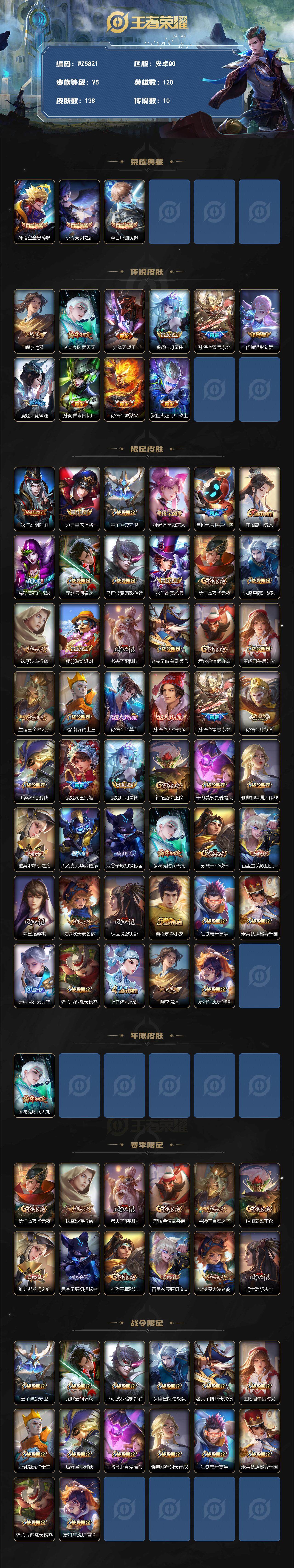 安卓q-v5-荣耀黄金i段位-120英雄-138皮肤-3典藏-0珍品无双-0无双-0珍品传说-10传说-42史诗 【荣耀典藏】:孙悟空全息碎影,小乔天鹅之梦,李白鸣剑曳影 【传说皮肤】:曜李 ,诸葛亮时雨天司,铠绛天战甲,虞姬启明星使,孙悟空零号赤焰,貂蝉猫影幻舞,虞姬云霓雀翎,孙尚香末日机甲,孙悟空地狱火,狄仁杰超时空战士 【限定皮肤】:狄仁杰阴阳师,赵云皇家上将,墨子神迹守卫,孙尚香蔷薇恋人,鲁班七号乒乒小将,庄周高山流水,高渐离死亡摇滚,元歌云间偶戏,马可波罗暗影游猎,狄仁杰魔术师,狄仁杰万华元夜,达摩星际陆战队,达摩沙漠行僧,项羽海滩派对,老夫子醍醐杖,老夫子航海奇遇记,程咬金演武夺筹,王昭君午后时光,兰陵王金庭之子,亚瑟潮玩骑士王,孙悟空至尊宝,孙悟空大圣娶亲,孙悟空零号赤焰,孙悟空孙行者,后羿圣弓游侠,虞姬霸王别姬,虞姬启明星使,钟馗驱傩正仪,干将莫邪真爱魔法,雅典娜单词大作战,雅典娜黎明之约,太乙真人华丽摇滚,鬼谷子原初探秘者,诸葛亮时雨天司,苏烈千军破阵,百里玄策原初追逐者,弈星混沌棋,沈梦溪大漠名商,明世隐疑决卦,裴擒虎李小龙,狂铁电玩高手,米莱狄胡桃异想国,云中君纤云弄巧,猪八戒西部大镖客,上官婉儿梁祝,曜李 ,蒙犽狂想玩偶喵 【年限皮肤】:诸葛亮时雨天司 【赛季限定】:狄仁杰万华元夜,达摩沙漠行僧,老夫子醍醐杖,程咬金演武夺筹,兰陵王金庭之子,钟馗驱傩正仪,雅典娜黎明之约,鬼谷子原初探秘者,苏烈千军破阵,百里玄策原初追逐者,弈星混沌棋,沈梦溪大漠名商,明世隐疑决卦 【战令限定】:墨子神迹守卫,元歌云间偶戏,马可波罗暗影游猎,达摩星际陆战队,老夫子航海奇遇记,王昭君午后时光,亚瑟潮玩骑士王,后羿圣弓游侠,干将莫邪真爱魔法,雅典娜单词大作战,狂铁电玩高手,米莱狄胡桃异想国,猪八戒西部大镖客,蒙犽狂想玩偶喵 【史诗皮肤】:鲁班七号电玩小子,赵云皇家上将,王昭君偶像歌手,狄仁杰魔术师,宫本武藏鬼剑武藏,孙尚香蔷薇恋人,孙尚香水果甜心,嬴政摇滚巨星,妲己魅力维加斯,墨子龙骑士,墨子金属风暴,吕布圣诞狂欢,曹操幽灵船长,韩信白龙吟,虞姬霸王别姬,孙悟空至尊宝,花木兰水晶猎龙者,刘邦德古拉伯爵,夏侯惇乘风破浪,小乔缤纷独角兽,诸葛亮黄金分割率,程咬金功夫厨神,白起星夜王子,孙悟空大圣娶亲,狄仁杰鹰眼统帅,上官婉儿梁祝,马可波罗暗影游猎,蒙犽狂想玩偶喵,百里玄策原初追逐者,裴擒虎李小龙,云中君纤云弄巧,元歌云间偶戏,米莱狄胡桃异想国,老夫子航海奇遇记,鲁班七号乒乒小将,干将莫邪真爱魔法,钟馗乐园奇幻夜,孙悟空孙行者,庄周高山流水,雅典娜黎明之约,狂铁电玩高手,后羿石田雨龙 【其他皮肤】:项羽海滩派对,露娜哥特玫瑰,赵云白执事,赵云忍炎影,芈月红桃皇后,宫本武藏未来纪元,姜子牙时尚教父,典韦黄金武士,亚瑟死亡骑士,达摩拳王,花木兰兔女郎,甄姬花好人间,后羿阿尔法小队,狄仁杰阴阳师,高渐离死亡摇滚,刘备汉昭烈帝,关羽龙腾万里,钟无艳海滩丽影,宫本武藏霸王丸,王昭君幻想奇妙夜,老夫子功夫老勺,诸葛亮掌控之力,太乙真人华丽摇滚,苏烈坚韧之力,项羽科学大爆炸,庄周奇妙博物学,小乔丁香结,吕布野性能量,孙膑归虚梦演,姜子牙炽热元素使,弈星混沌棋,哪吒次元突破,明世隐疑决卦,盾山圆桌骑士,老夫子醍醐杖,猪八戒西部大镖客,狂铁特工战影,鬼谷子原初探秘者,雅典娜单词大作战,狄仁杰万华元夜,亚瑟潮玩骑士王,杨戬次元傲视,露娜瓷语鉴心,达摩星际陆战队,程咬金演武夺筹,张良缤纷绘卷,盘古重装意志,钟馗驱傩正仪,墨子神迹守卫,鲁班大师乓乓大师,苏烈千军破阵,后羿圣弓游侠,典韦铁甲之心,妲己紫罗兰之誓,达摩沙漠行僧,兰陵王金庭之子,王昭君午后时光,沈梦溪大漠名商,猪八戒潮玩探月行,廉颇功夫炙烤,姜子牙星梦巡礼,钟馗虚灵犬护,白起死霸装,高渐离金属狂潮,老夫子潮流仙人,狄仁杰锦衣卫,曹操死神来了,曹操超能战警,小乔万圣前夜,孙悟空西部大镖客,李白范海辛,钟馗地府判官,虞姬加勒比小姐,马可波罗激情绿茵,黄忠芝加哥教父,苏烈爱与和平,女娲尼罗河女神,米莱狄精准探案法,孙策海之征途,司马懿魇语军师,嫦娥露花倒影,司空震启蛰,云缨赤焰之缨 【内测皮肤】:孙尚香蔷薇恋人,狂铁特工战影 【营地id】:1570742128