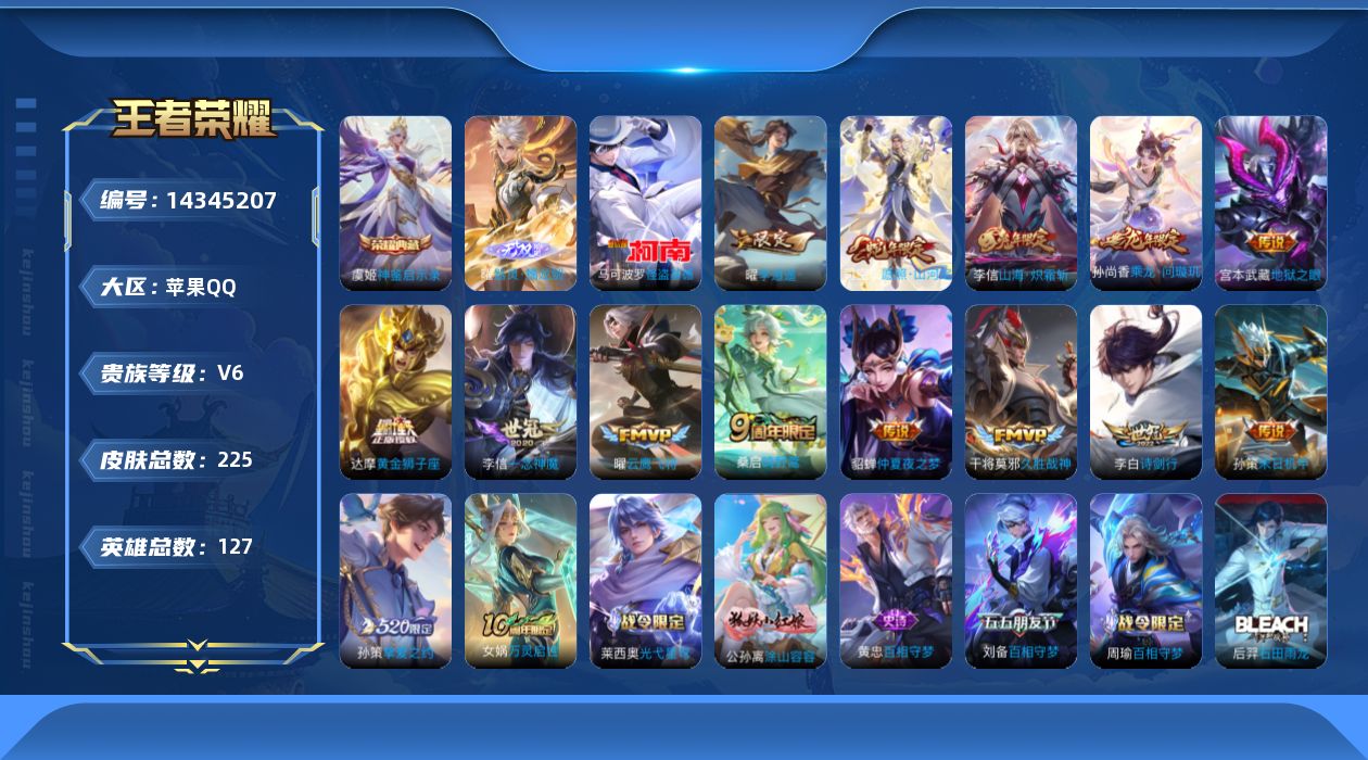 [14345207]贵族7-225皮-1典藏-15传说-1无双-1珍品传说-珍品无双0 苹果手q135区225皮1典藏15传说1无双1珍品传说v6 营地id1773475256绝世王者【珍品传说皮肤】:怪盗基德【无双皮肤】:器灵·螭龙剑【荣耀典藏】:神鉴启示录【优质限定皮肤】:山海·炽霜斩【传说皮肤】:地狱之眼乘龙·问璇玑神树通天久胜战神愿照·山河定鸣野蒿云鹰飞将诗剑行山海·炽霜