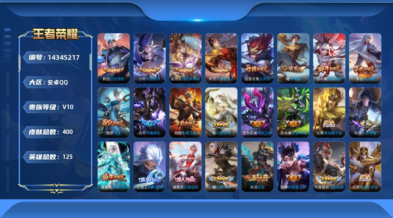 [14345217]贵族10-400皮-4典藏-32传说-0无双-0珍品传说-珍品无双0 安卓手q92区400皮4典藏32传说0无双v10 营地id465646334尊贵铂金iii【荣耀典藏】:弑呛猎影倪克斯神谕大秦宣太后天鹅之梦【优质限定皮肤】:祈雪灵祝武圣神威白虎志梅西天魔缭乱至尊宝凤求凰【传说皮肤】:炽阳神光觅芳踪李 默契交锋祈雪灵祝时雨天司启明星使零