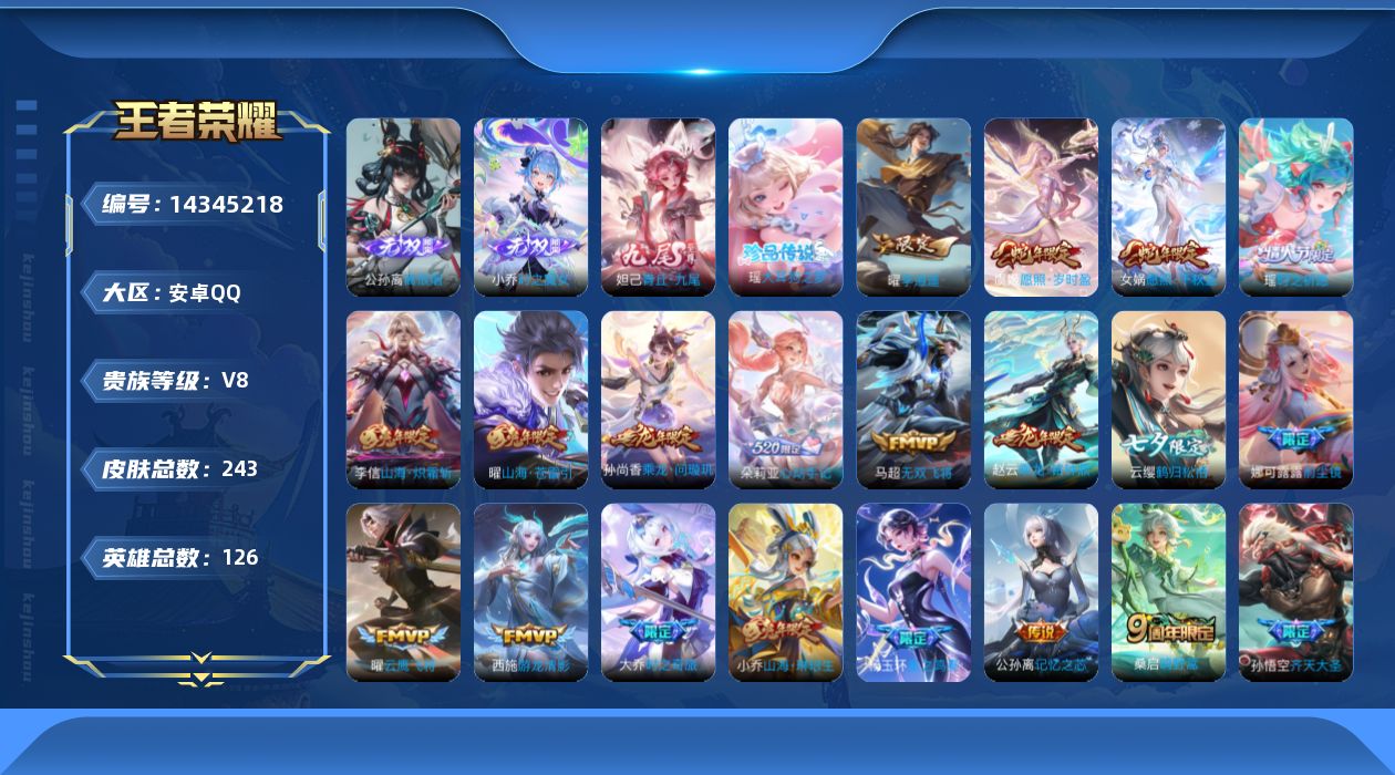 [14345218]贵族9-243皮-0典藏-27传说-3无双-1珍品传说-3个英雄全皮-改名卡1-灵宝改名卡1-天幕财神纳福 鸿兔大展-星传说时之愿境 背包有1荣耀水晶小女号 安卓手q367区243皮0典藏27传说3无双1珍品传说v8 营地id1846947571至圣王者【珍品传说皮肤】:大耳狗之梦【无双皮肤】:离恨烟时之魔女青丘·九尾【优质限定皮肤】:无双飞将瑶时之祈愿山海·琳琅生