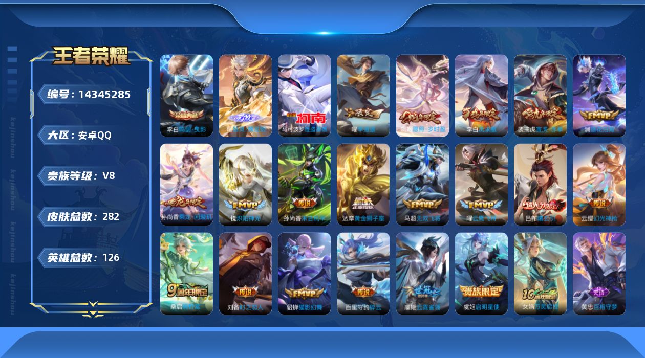 [14345285]贵族8-282皮1典藏20传说1无双1珍品传说-0个英雄全皮-灵宝改名卡1-星传说未来机甲 背包一颗荣耀水晶 安卓手q297区282皮1典藏20传说1无双1珍品传说v8 营地id1893860642最强王者【珍品传说皮肤】:怪盗基德【无双皮肤】:器灵·螭龙剑【荣耀典藏】:鸣剑·曳影【优质限定皮肤】:无双飞将云中君时之祈愿凤求凰【传说皮肤】:神树通天黄金狮子座幻光神呛