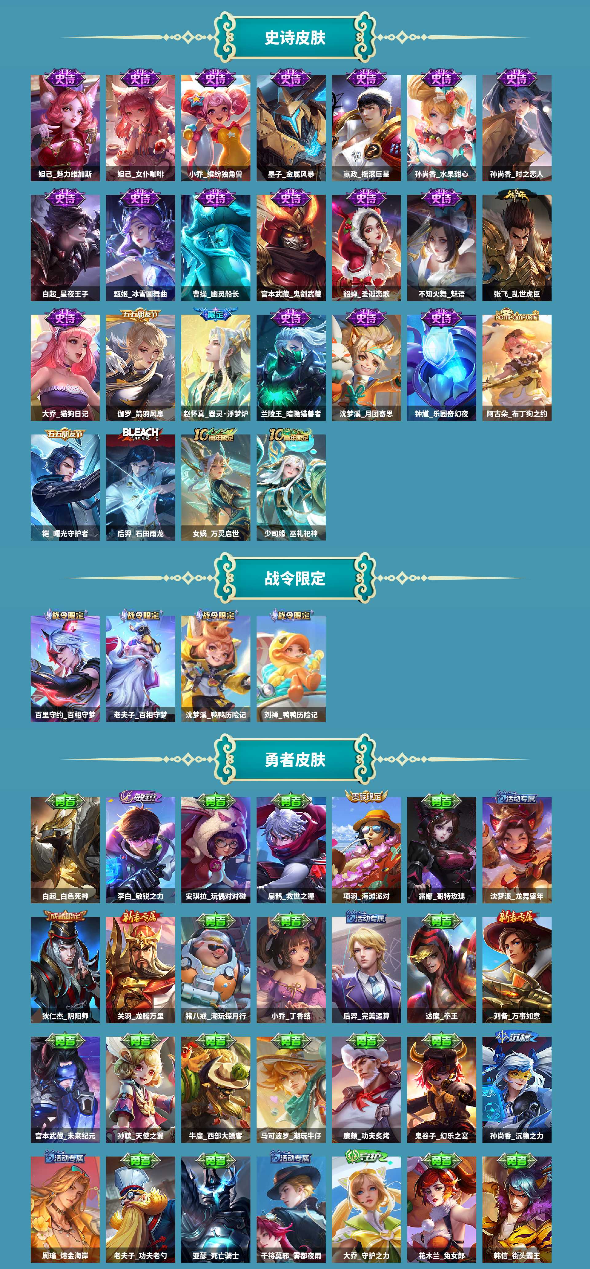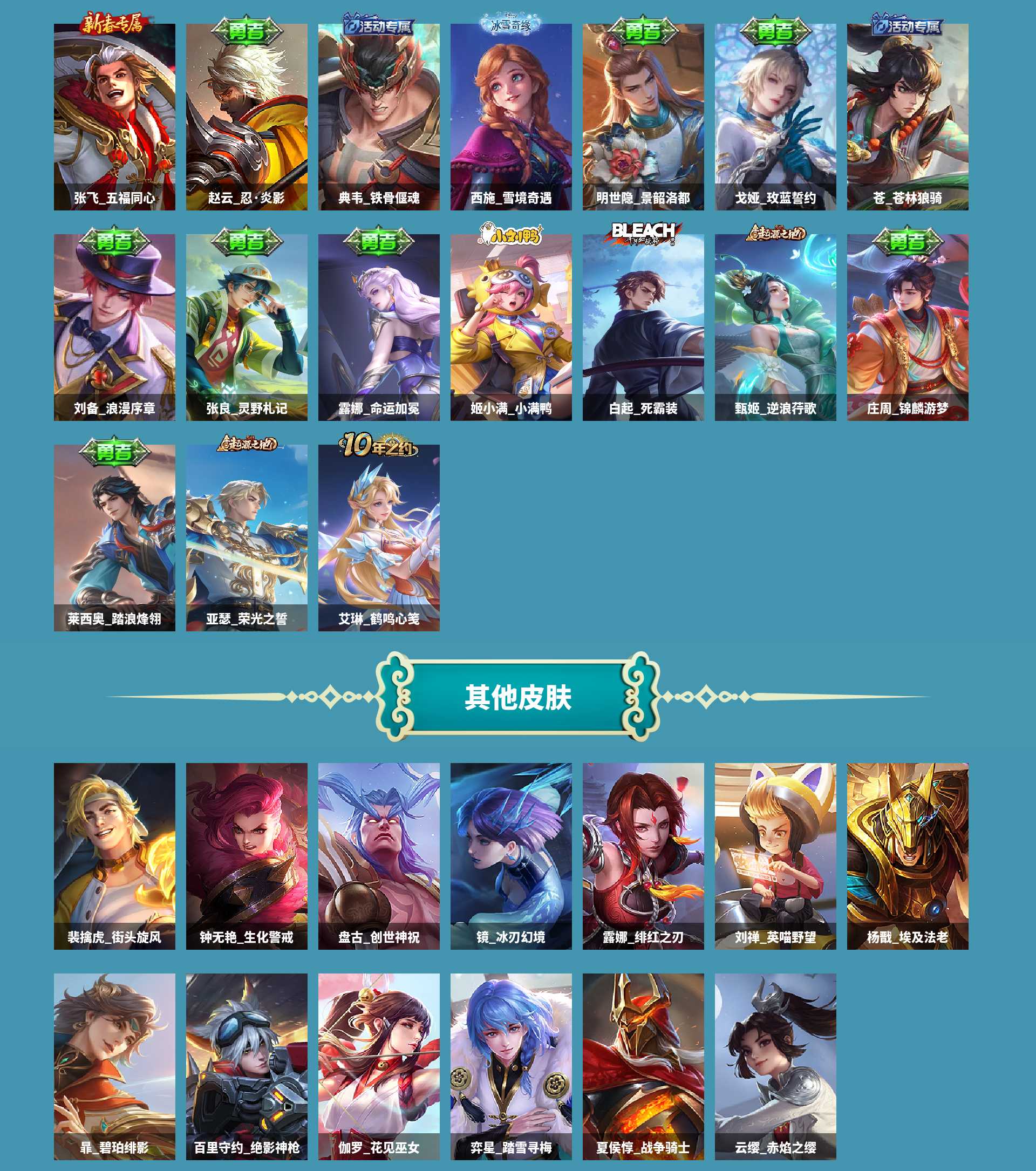 al634221 【极品女号3珍品传说张飞兔狲蓬尾安琪拉酷洛米之心瑶大耳狗之梦】 皮肤数113 皮肤价值78680 传说皮肤数11 珍品传说皮数3 史诗皮肤数32 英雄数122 营地id1619054623 贵族等级【文本】贵族7级 【贵族7级】 【可排位】 【是】 珍品传说3 年限皮肤4 限定皮肤30 赛季限定7 史诗皮肤33 战令限定4 勇者皮肤52 其他皮肤13 天幕1 珍品传说:张飞兔狲蓬尾,安琪拉酷洛米之心,瑶大耳狗之梦; 年限皮肤:澜愿照九州拓,司空震愿照山河定,女娲愿照千秋盛,虞姬愿照岁时盈; 限定皮肤:少司缘巫礼祀神,白起死霸装,后羿石田雨龙,姬小满小满鸭,阿轲化蝶舞,澜愿照九州拓,司空震愿照山河定,赵怀真器灵浮梦炉,狄仁杰魔术师,女娲愿照千秋盛,虞姬愿照岁时盈,太乙真人谧流熔炉,狄仁杰鹰眼统帅,百里守约百相守梦,赵云皇家上将,海诺心动手记,桑启鸣野蒿,狂铁龙之律动,张飞兔狲蓬尾,安琪拉酷洛米之心,瑶大耳狗之梦,东皇太一噬灭天穹,钟馗虚灵犬护,沈梦溪龙舞盛年,项羽海滩派对,苏烈春野闲踪,狄仁杰阴阳师,老夫子百相守梦,刘邦剑破天穹,桑启海盐诗旅; 赛季限定:亚瑟荣光之誓,甄姬逆浪荇歌,太乙真人谧流熔炉,东皇太一噬灭天穹,钟馗虚灵犬护,刘邦剑破天穹,桑启海盐诗旅; 史诗皮肤:不知火舞魅语,女娲万灵启世,少司缘巫礼祀神,曹操幽灵船长,白起星夜王子,后羿石田雨龙,阿轲化蝶舞,铠曙光守护者,小乔缤纷独角兽,孙尚香时之恋人,赵怀真器灵浮梦炉,狄仁杰魔术师,大乔猫狗日记,狄仁杰鹰眼统帅,妲己魅力维加斯,百里守约百相守梦,赵云皇家上将,刘禅鸭鸭历险记,海诺心动手记,钟馗乐园奇幻夜,妲己女仆咖啡,墨子金属风暴,孙尚香水果甜心,沈梦溪月团寄思,伽罗箭羽风息,狂铁龙之律动,貂蝉圣诞恋歌,张飞乱世虎臣,嬴政摇滚巨星,甄姬冰雪圆舞曲,宫本武藏鬼剑武藏,兰陵王暗隐猎兽者,阿古朵_布丁狗之约; 战令限定:百里守约百相守梦,沈梦溪鸭鸭历险记,刘禅鸭鸭历险记,老夫子百相守梦; 勇者皮肤:韩信街头霸王,达摩拳王,艾琳鹤鸣心笺,亚瑟荣光之誓,赵云忍炎影,莱西奥踏浪烽翎,庄周锦麟游梦,甄姬逆浪荇歌,猪八戒潮玩探月行,白起死霸装,姬小满小满鸭,露娜命运加冕,刘备浪漫序章,廉颇功夫炙烤,扁鹊救世之瞳,戈娅玫蓝誓约,牛魔西部大镖客,明世隐景韶洛都,白起白色死神,张飞五福同心,西施雪境奇遇,太乙真人谧流熔炉,典韦铁骨偃魂,苍苍林狼骑,沈梦溪鸭鸭历险记,露娜哥特玫瑰,周瑜熔金海岸,小乔丁香结,马可波罗潮玩牛仔,安琪拉玩偶对对碰,东皇太一噬灭天穹,关羽龙腾万里,钟馗虚灵犬护,沈梦溪龙舞盛年,项羽海滩派对,刘备万事如意,后羿完美运算,李白敏锐之力,狄仁杰阴阳师,干将莫邪雾都夜雨,老夫子功夫老勺,老夫子百相守梦,刘邦剑破天穹,亚瑟死亡骑士,张良灵野札记,大乔守护之力,桑启海盐诗旅,孙膑天使之翼,鬼谷子幻乐之宴,孙尚香沉稳之力,宫本武藏未来纪元,花木兰兔女郎; 其他皮肤:裴擒虎街头旋风,镜冰刃幻境,暃碧珀绯影,杨戬埃及法老,钟无艳生化警戒,刘禅英喵野望,伽罗花见巫女,弈星踏雪寻梅,百里守约绝影神呛,盘古创世神祝,露娜绯红之刃,夏侯惇战争骑士,云缨赤焰之缨; 天幕:繁花交响诗天幕;