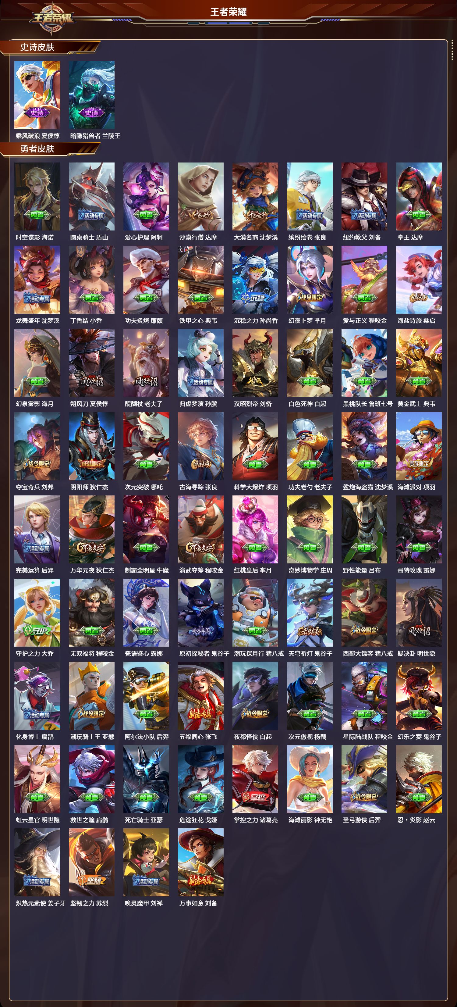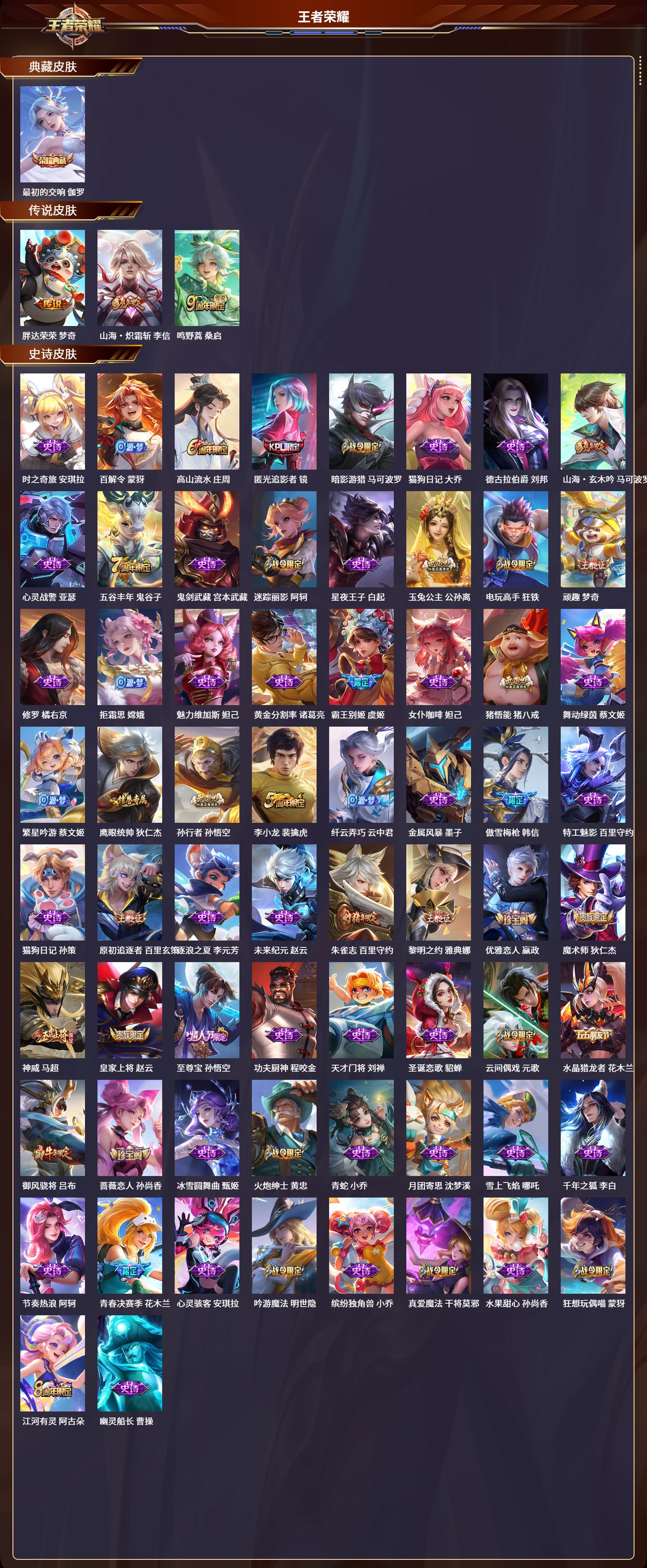 安卓qq/至尊星耀/217皮肤/124英雄/1典藏/0珍品无双/0无双/0珍品传说/3传说/68史诗/8稀有英雄【1 典藏皮肤】最初的交响 伽罗【3 传说皮肤】胖达荣荣 梦奇山海·炽霜斩 李信鸣野蒿 桑启【68 史诗皮肤】时之奇旅 安琪拉百解令 蒙犽高山流水 庄周匿光追影者 镜暗影游猎 马可波罗猫狗日记 大乔德古拉伯爵 刘邦山海·玄木吟 马可波罗心灵战警