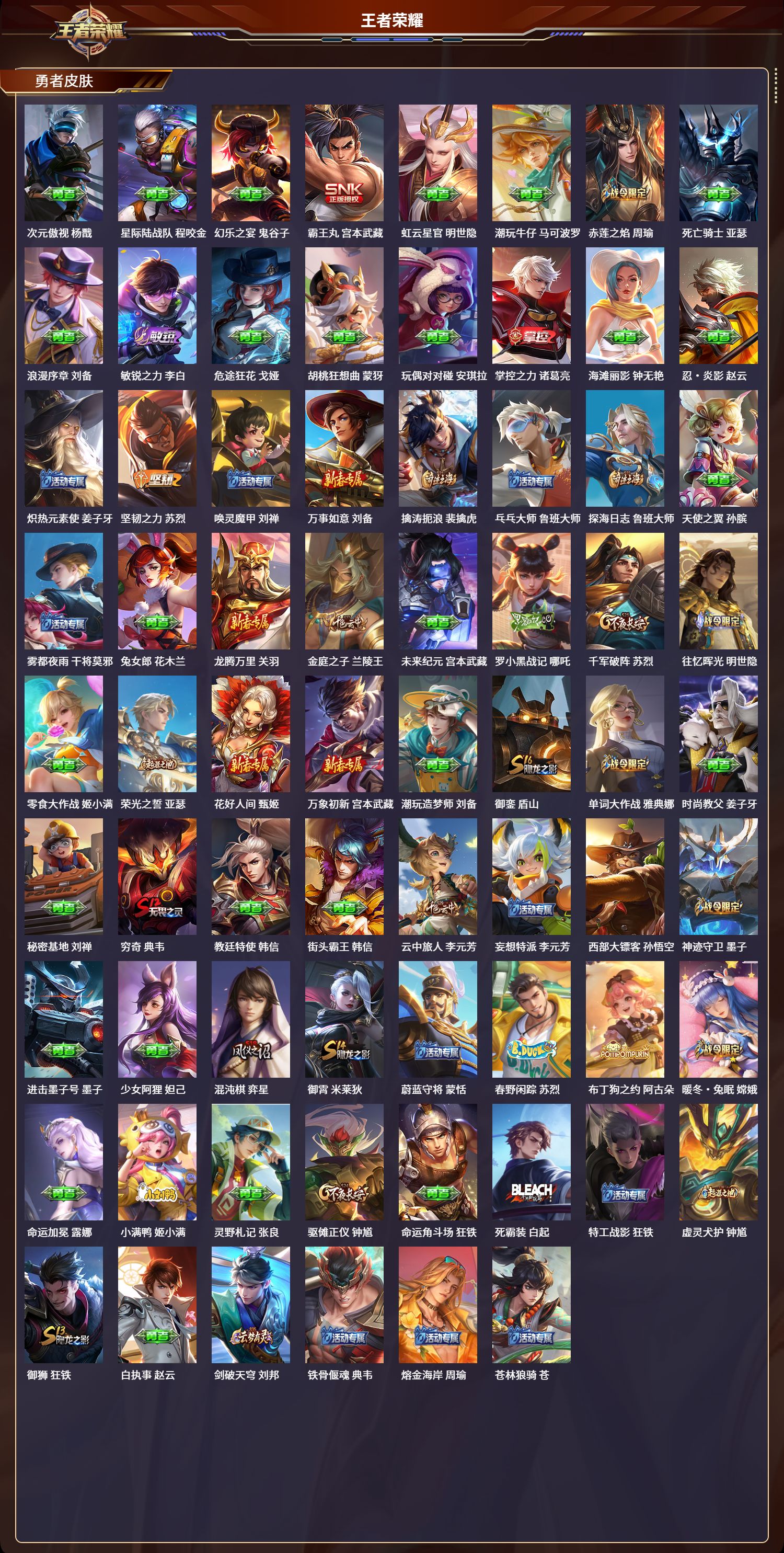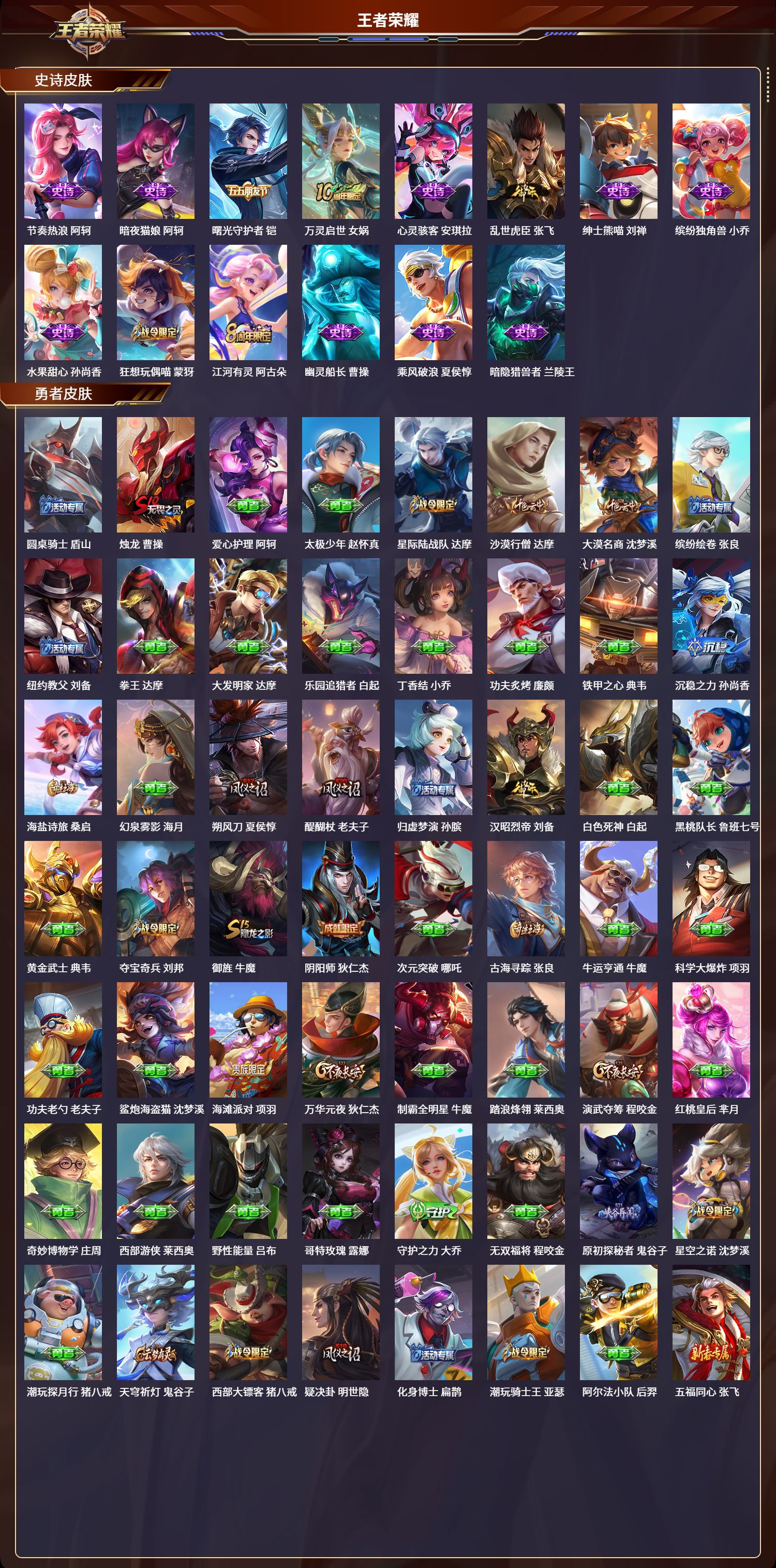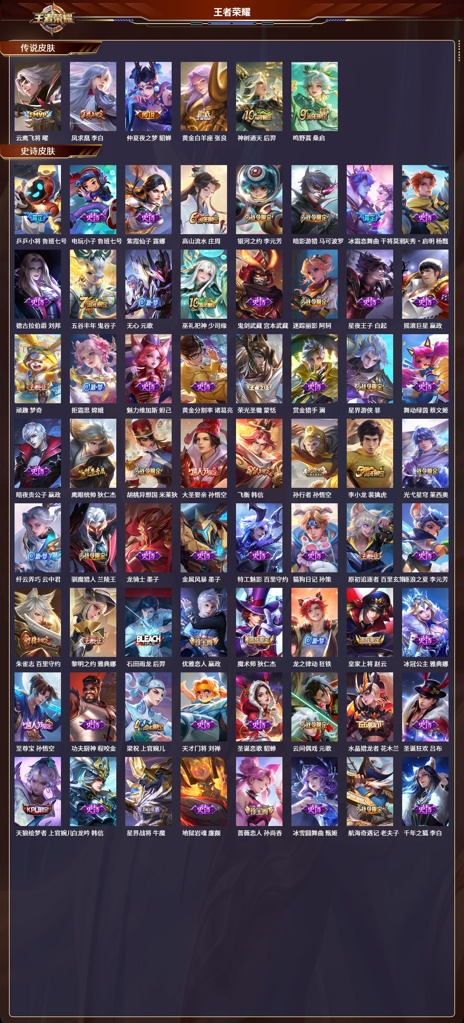 苹果qq/无双王者/282皮肤/124英雄/0典藏/0珍品无双/0无双/0珍品传说/6传说/78史诗/8稀有英雄【6 传说皮肤】云鹰飞将 曜凤求凰 李白仲夏夜之梦 貂蝉黄金白羊座 张良神树通天 后羿鸣野蒿 桑启【78 史诗皮肤】乒乒小将 鲁班七号电玩小子 鲁班七号紫霞仙子 露娜高山流水 庄周银河之约 李元芳暗影游猎 马可波罗冰霜恋舞曲 干将莫邪天秀·启