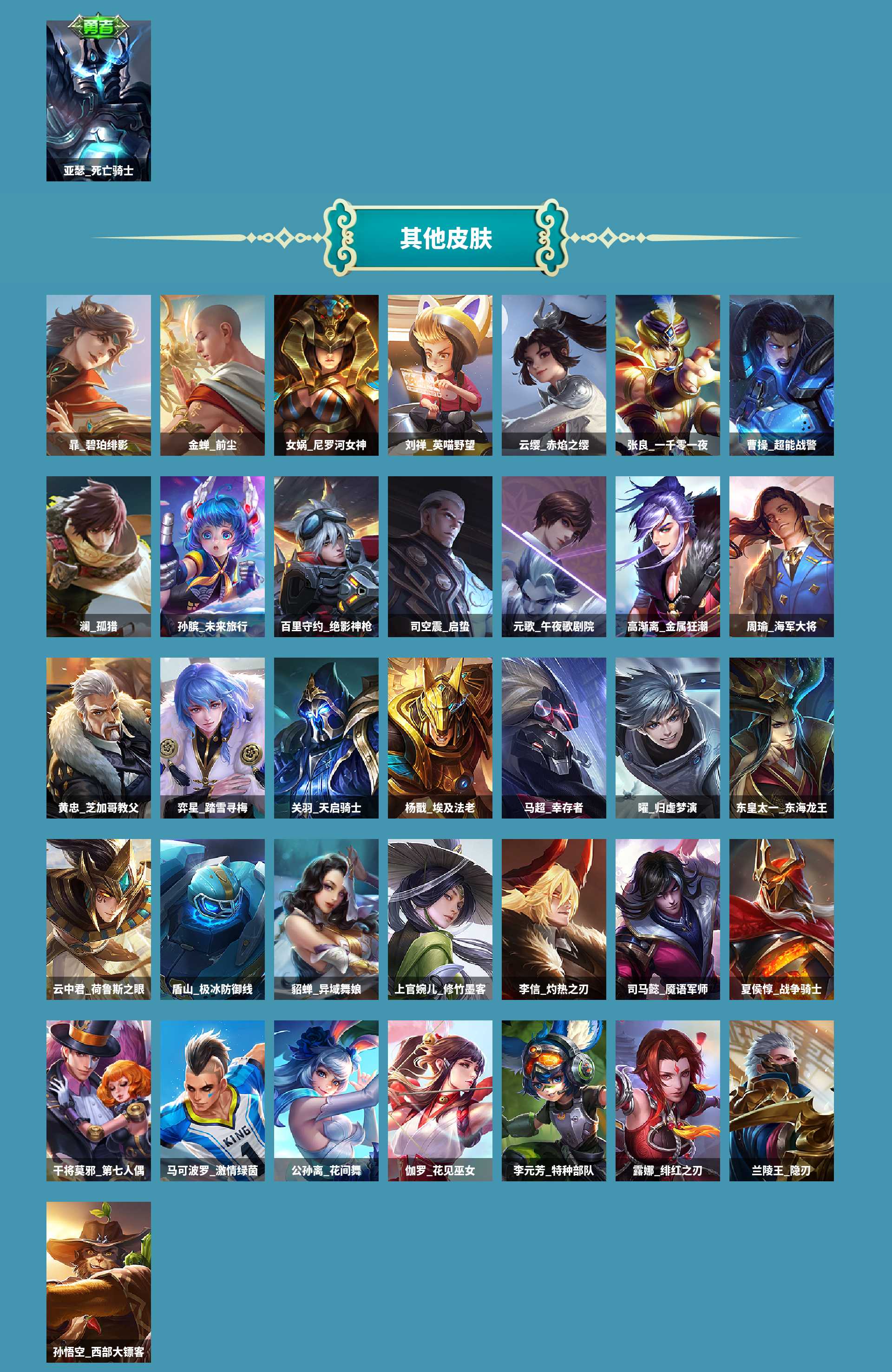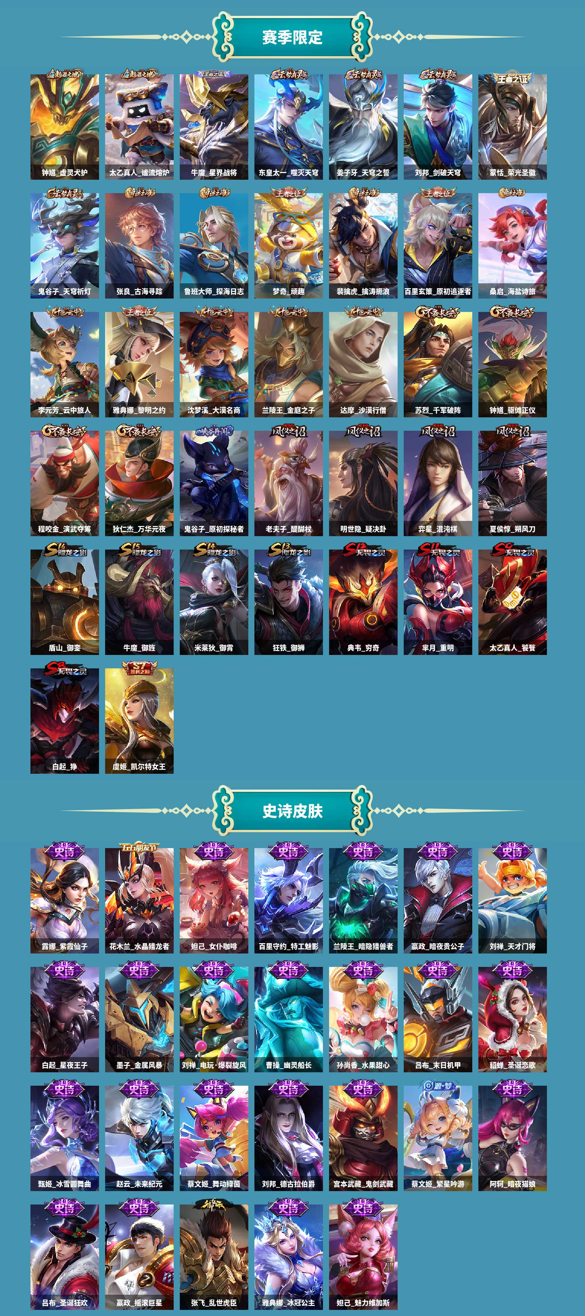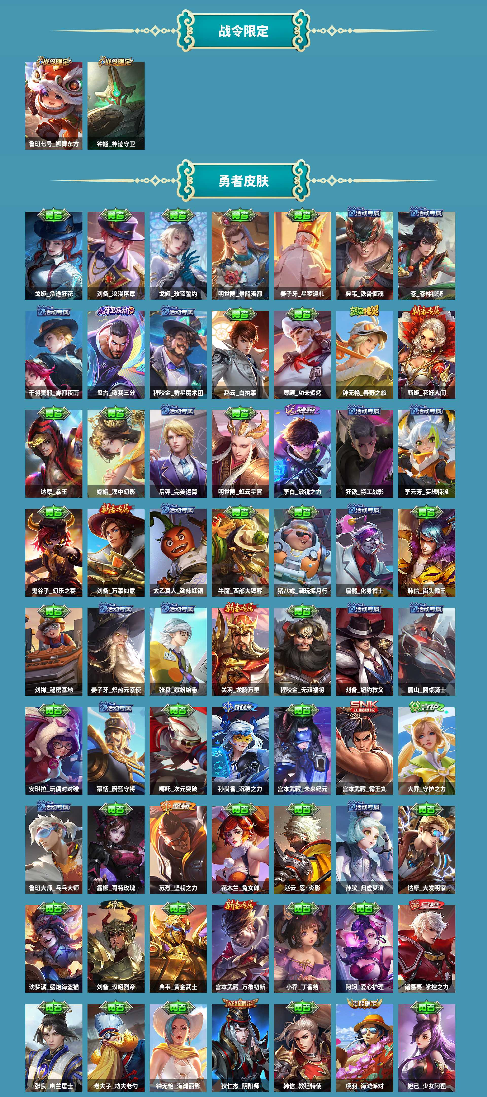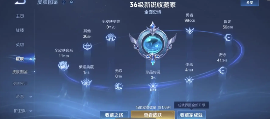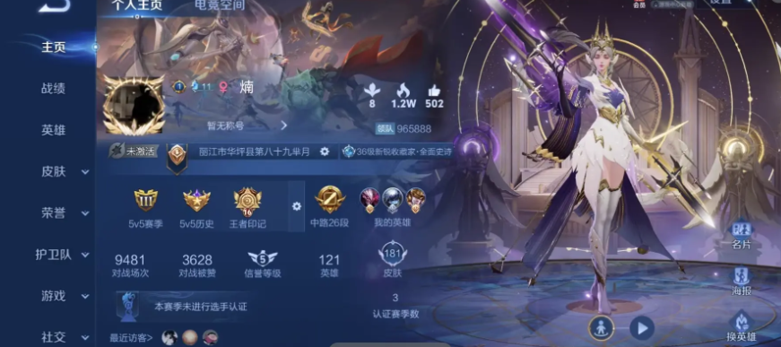 al602950 【亲情价出4传说】 皮肤数181 无双皮肤数0 传说皮肤数4 珍品传说皮数0 史诗皮肤数41 英雄数121 营地id237152831 贵族等级【文本】贵族5级 贵族等级【文本】贵族5级 【贵族5级】 荣耀典藏1 内测皮肤3 年限皮肤1 限定皮肤56 赛季限定37 史诗皮肤41 战令限定2 勇者皮肤97 其他皮肤36 荣耀典藏:虞姬神鉴启示录; 内测皮肤:弈星万物之道,干将莫邪胡桃夹子,嬴政优雅恋人; 年限皮肤:百里守约朱雀志; 限定皮肤:苏烈春野闲踪,钟馗虚灵犬护,太乙真人谧流熔炉,弈星万物之道,牛魔星界战将,东皇太一噬灭天穹,桑启鸣野蒿,盘古敬我三分,蒙犽顽岩魄,姜子牙天穹之誓,刘邦剑破天穹,蒙恬荣光圣徽,嫦娥漠中幻影,鬼谷子天穹祈灯,阿古朵江河有灵,干将莫邪胡桃夹子,张良古海寻踪,鲁班大师探海日志,梦奇顽趣,裴擒虎擒涛扼浪,百里玄策原初追逐者,桑启海盐诗旅,鬼谷子五谷丰年,李元芳云中旅人,雅典娜黎明之约,沈梦溪大漠名商,兰陵王金庭之子,嬴政优雅恋人,达摩沙漠行僧,苏烈千军破阵,钟馗驱傩正仪,程咬金演武夺筹,狄仁杰万华元夜,鬼谷子原初探秘者,老夫子醍醐杖,明世隐疑决卦,弈星混沌棋,蔡文姬繁星吟游,上官婉儿梁祝,夏侯惇朔风刀,鲁班七号狮舞东方,赵云皇家上将,钟馗神迹守卫,狄仁杰鹰眼统帅,盾山御銮,牛魔御旌,米莱狄御霄,百里守约朱雀志,狂铁御狮,典韦穷奇,芈月重明,狄仁杰阴阳师,太乙真人饕餮,白起狰,项羽海滩派对,虞姬凯尔特女王; 赛季限定:钟馗虚灵犬护,太乙真人谧流熔炉,牛魔星界战将,东皇太一噬灭天穹,姜子牙天穹之誓,刘邦剑破天穹,蒙恬荣光圣徽,鬼谷子天穹祈灯,张良古海寻踪,鲁班大师探海日志,梦奇顽趣,裴擒虎擒涛扼浪,百里玄策原初追逐者,桑启海盐诗旅,李元芳云中旅人,雅典娜黎明之约,沈梦溪大漠名商,兰陵王金庭之子,达摩沙漠行僧,苏烈千军破阵,钟馗驱傩正仪,程咬金演武夺筹,狄仁杰万华元夜,鬼谷子原初探秘者,老夫子醍醐杖,明世隐疑决卦,弈星混沌棋,夏侯惇朔风刀,盾山御銮,牛魔御旌,米莱狄御霄,狂铁御狮,典韦穷奇,芈月重明,太乙真人饕餮,白起狰,虞姬凯尔特女王; 史诗皮肤:弈星万物之道,露娜紫霞仙子,牛魔星界战将,花木兰水晶猎龙者,妲己女仆咖啡,百里守约特工魅影,兰陵王暗隐猎兽者,嬴政暗夜贵公子,蒙犽顽岩魄,蒙恬荣光圣徽,刘禅天才门将,阿古朵江河有灵,白起星夜王子,墨子金属风暴,刘禅电玩爆裂旋风,梦奇顽趣,曹操幽灵船长,百里玄策原初追逐者,孙尚香水果甜心,吕布末日机甲,貂蝉圣诞恋歌,鬼谷子五谷丰年,雅典娜黎明之约,甄姬冰雪圆舞曲,嬴政优雅恋人,赵云未来纪元,蔡文姬舞动绿茵,刘邦德古拉伯爵,宫本武藏鬼剑武藏,蔡文姬繁星吟游,阿轲暗夜猫娘,吕布圣诞狂欢,上官婉儿梁祝,鲁班七号狮舞东方,赵云皇家上将,狄仁杰鹰眼统帅,嬴政摇滚巨星,张飞乱世虎臣,百里守约朱雀志,雅典娜冰冠公主,妲己魅力维加斯; 战令限定:鲁班七号狮舞东方,钟馗神迹守卫; 勇者皮肤:戈娅危途狂花,刘备浪漫序章,戈娅玫蓝誓约,明世隐景韶洛都,姜子牙星梦巡礼,太乙真人谧流熔炉,典韦铁骨偃魂,苍苍林狼骑,干将莫邪雾都夜雨,东皇太一噬灭天穹,盘古敬我三分,姜子牙天穹之誓,程咬金群星魔术团,赵云白执事,刘邦剑破天穹,廉颇功夫炙烤,钟无艳春野之旅,甄姬花好人间,达摩拳王,嫦娥漠中幻影,鬼谷子天穹祈灯,后羿完美运算,干将莫邪胡桃夹子,明世隐虹云星官,张良古海寻踪,李白敏锐之力,狂铁特工战影,李元芳妄想特派,鲁班大师探海日志,鬼谷子幻乐之宴,刘备万事如意,太乙真人劲辣红锅,裴擒虎擒涛扼浪,牛魔西