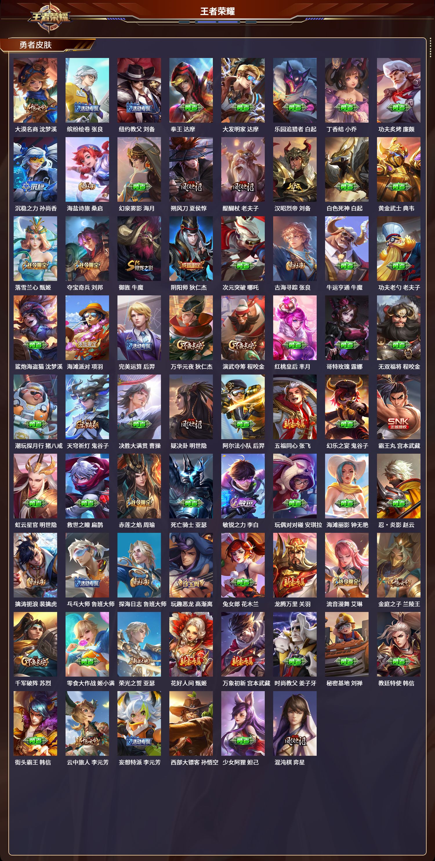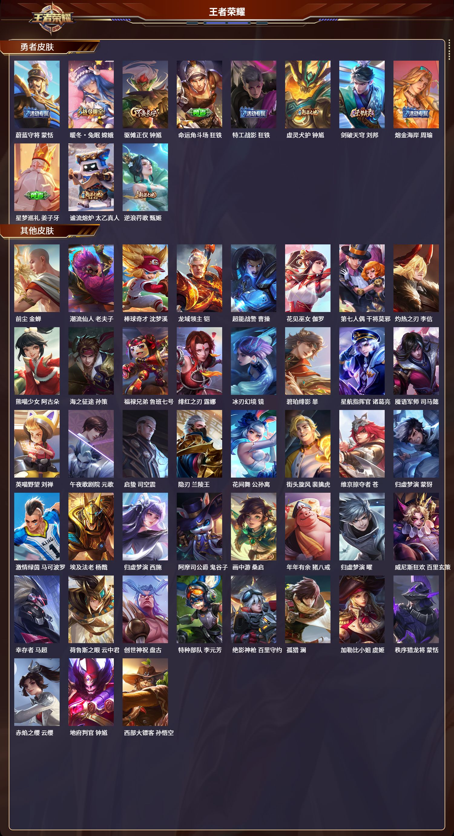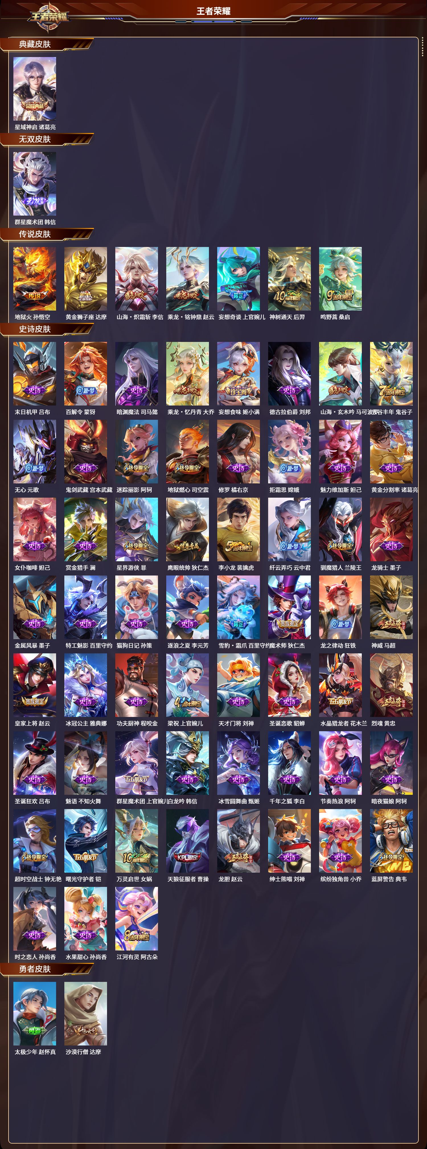 安卓qq/非凡王者/193皮肤/125英雄/1典藏/0珍品无双/1无双/0珍品传说/7传说/59史诗/9稀有英雄【1 典藏皮肤】星域神启 诸葛亮【1 无双皮肤】群星魔术团 韩信【7 传说皮肤】地狱火 孙悟空黄金狮子座 达摩山海·炽霜斩 李信乘龙·铭钟鼎 赵云妄想奇谈 上官婉儿神树通天 后羿鸣野蒿 桑启【59 史诗皮肤】末日机甲 吕布百解令 蒙犽暗渊魔法 司马懿乘龙·忆丹青