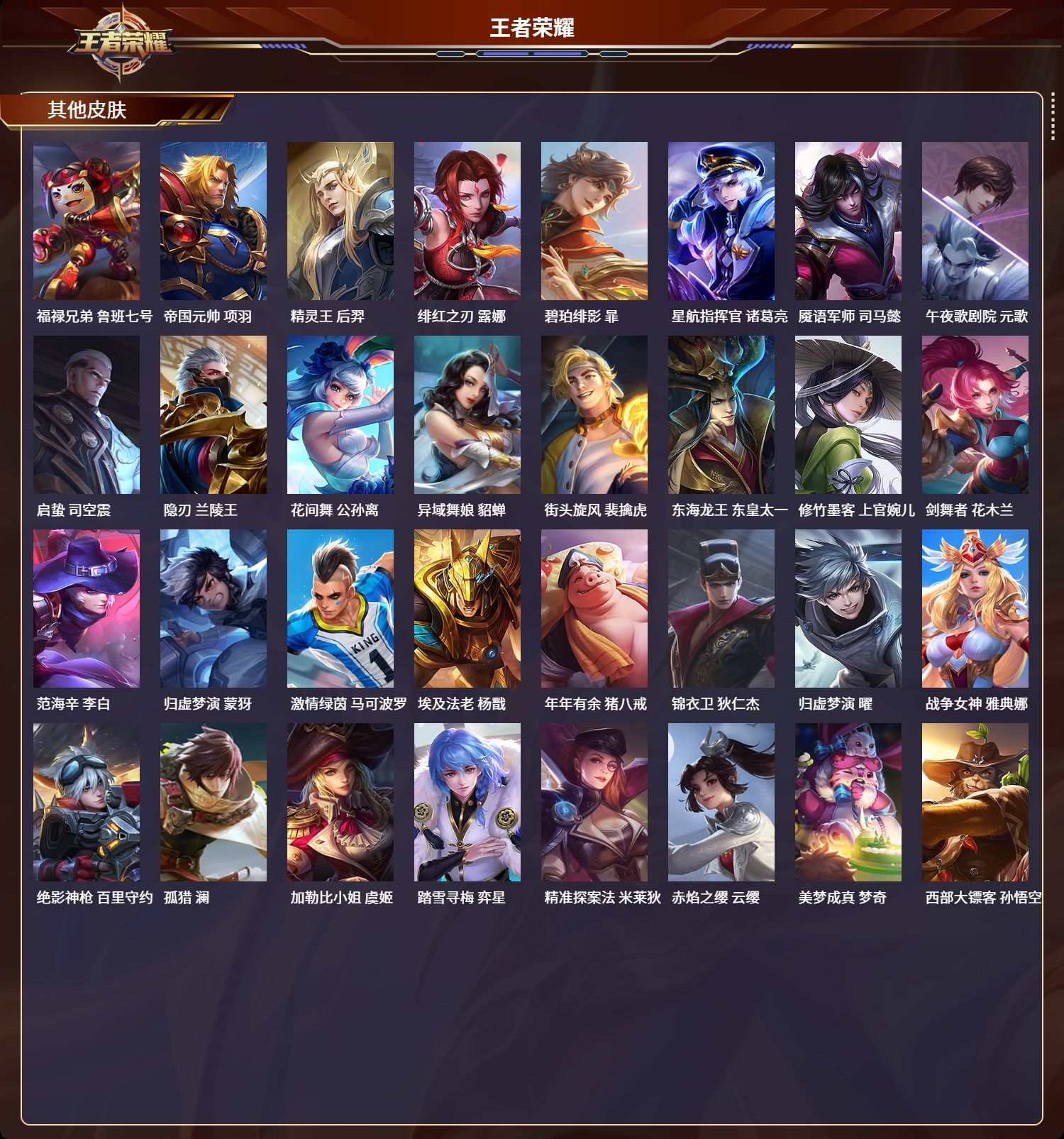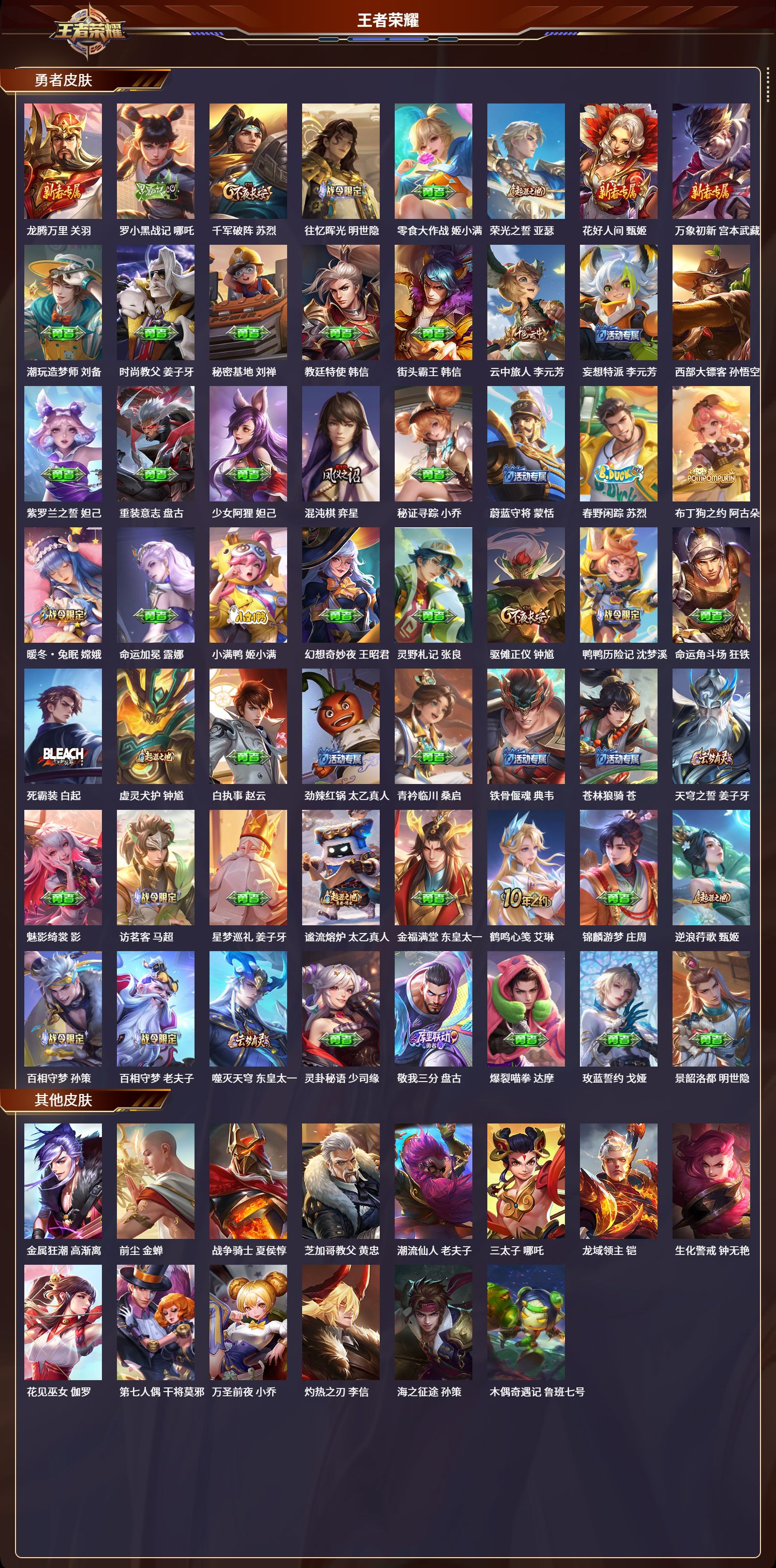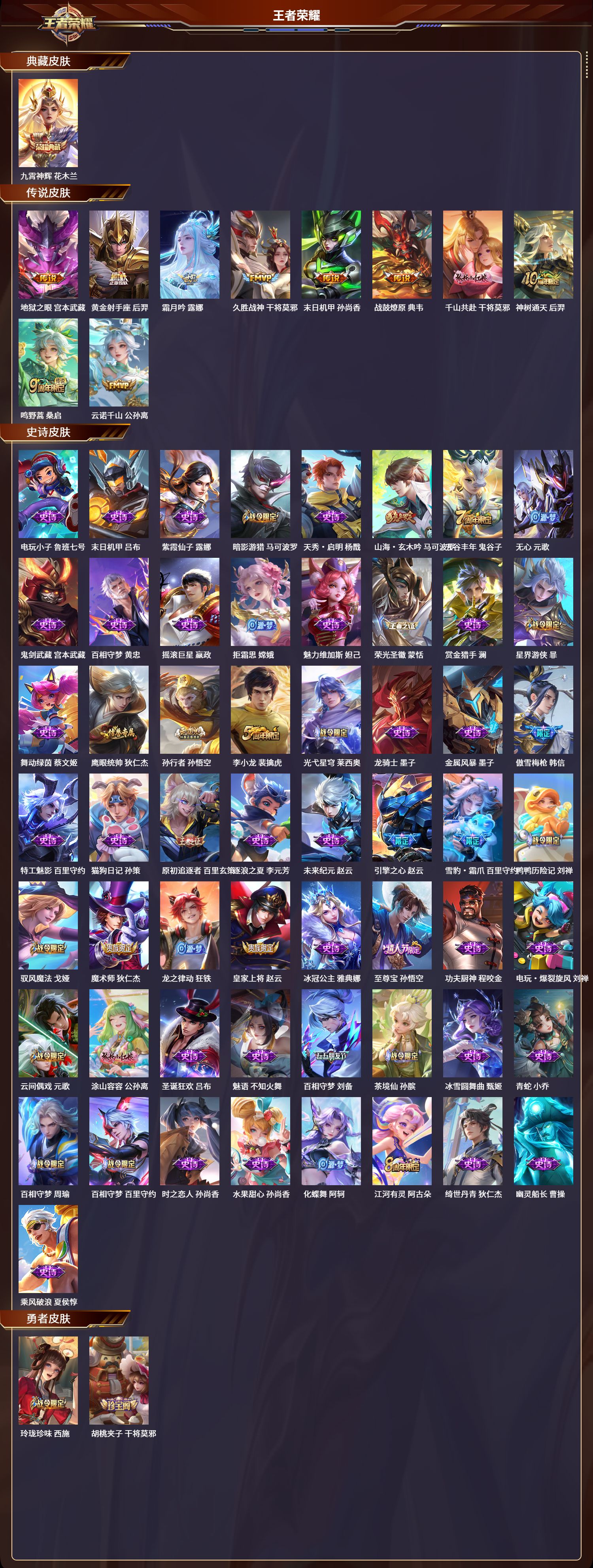安卓qq/无双王者/241皮肤/125英雄/1典藏/0珍品无双/0无双/0珍品传说/10传说/57史诗/9稀有英雄【1 典藏皮肤】九霄神辉 花木兰【10 传说皮肤】地狱之眼 宫本武藏黄金射手座 后羿霜月吟 露娜久胜战神 干将莫邪末日机甲 孙尚香战鼓燎原 典韦千山共赴 干将莫邪神树通天 后羿鸣野蒿 桑启云诺千山 公孙离【57 史诗皮肤】电玩小子 鲁班七号末