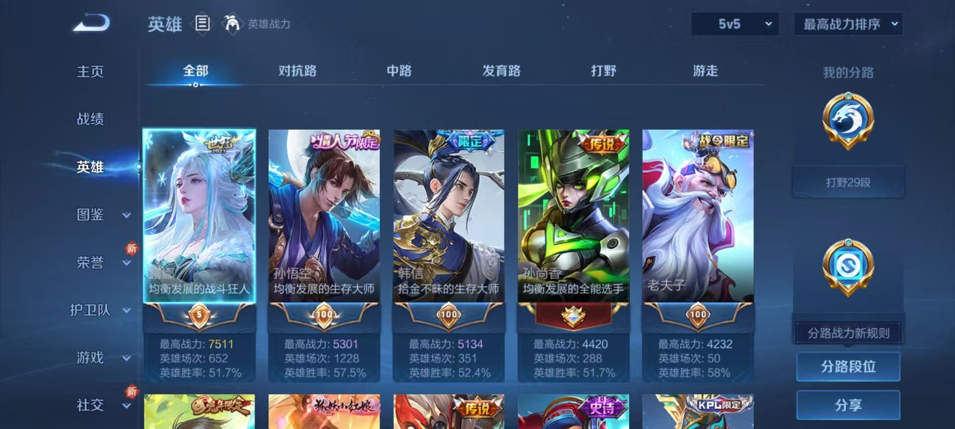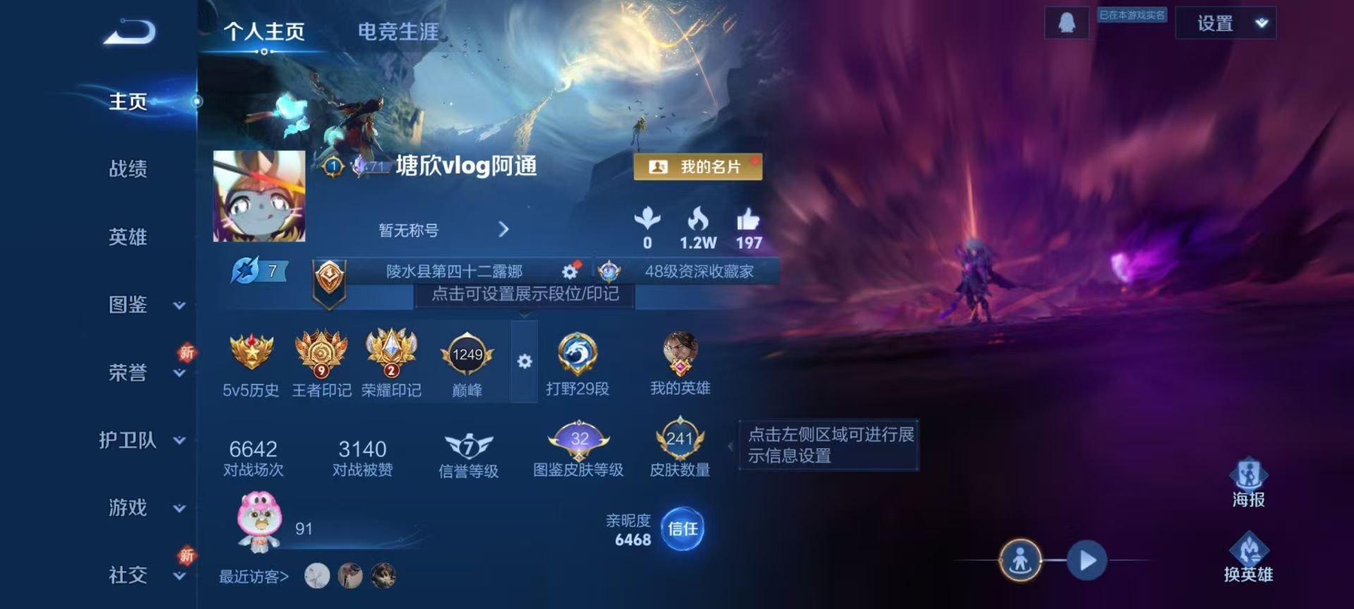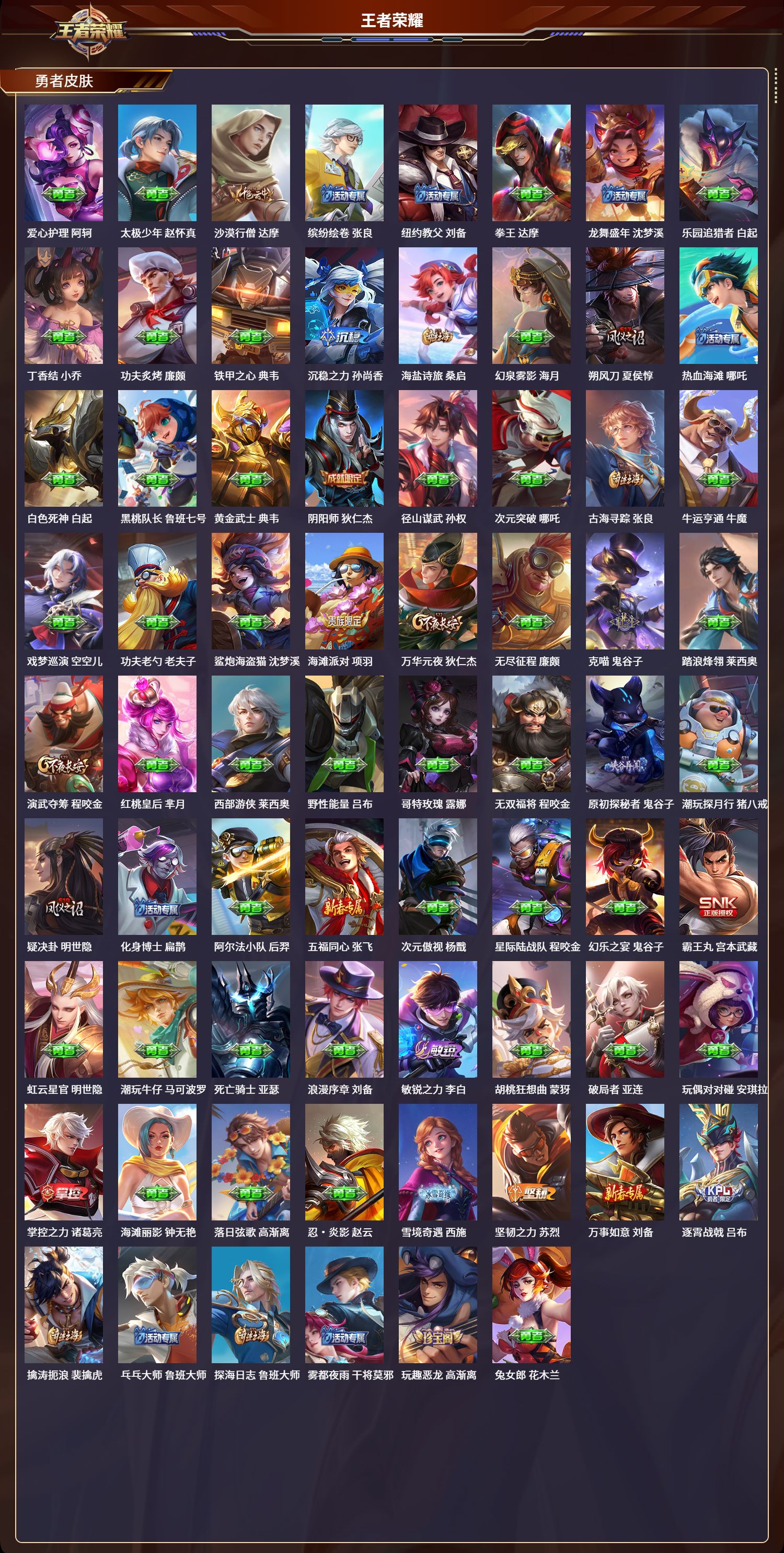 安卓qq/无双王者/241皮肤/125英雄/1典藏/0珍品无双/0无双/0珍品传说/10传说/57史诗/9稀有英雄【1 典藏皮肤】九霄神辉 花木兰【10 传说皮肤】地狱之眼 宫本武藏黄金射手座 后羿霜月吟 露娜久胜战神 干将莫邪末日机甲 孙尚香战鼓燎原 典韦千山共赴 干将莫邪神树通天 后羿鸣野蒿 桑启云诺千山 公孙离【57 史诗皮肤】电玩小子 鲁班七号末