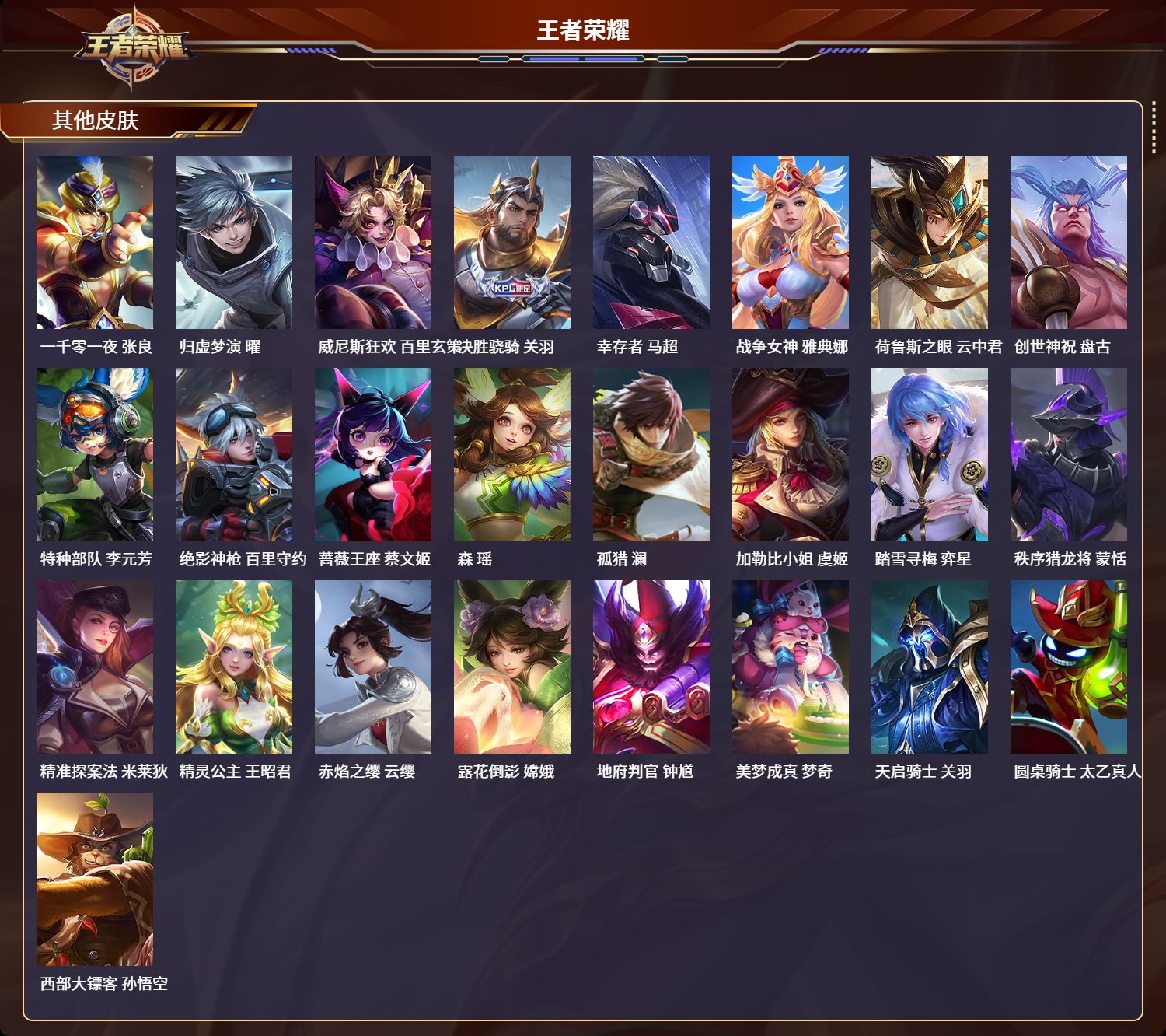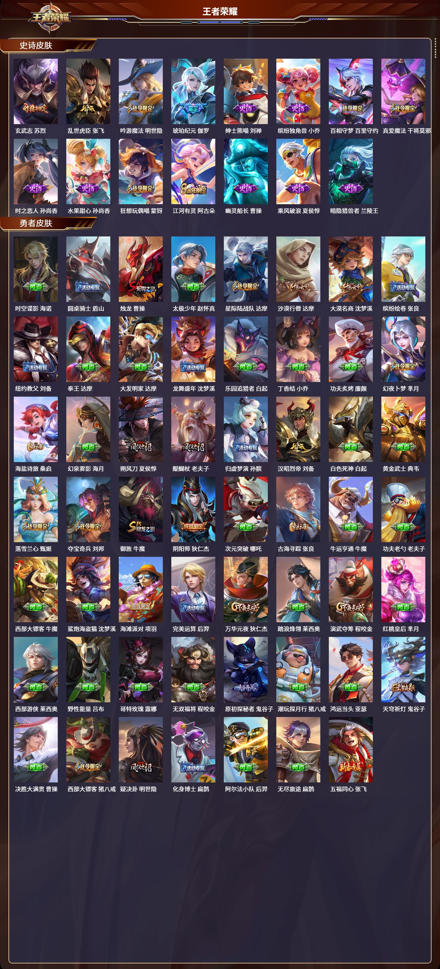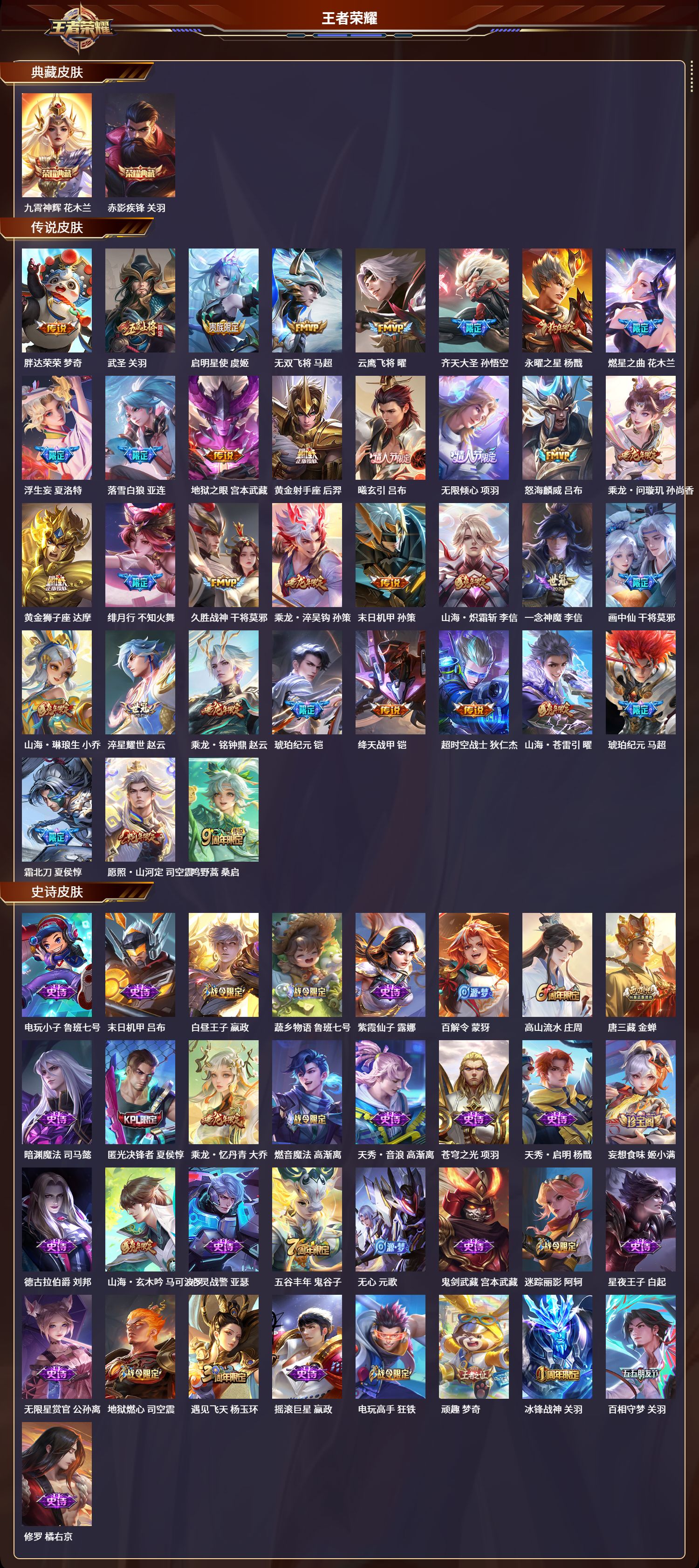 苹果微信/至尊星耀/373皮肤/125英雄/2典藏/0珍品无双/0无双/0珍品传说/35传说/118史诗/9稀有英雄【2 典藏皮肤】九霄神辉 花木兰赤影疾锋 关羽【35 传说皮肤】胖达荣荣 梦奇武圣 关羽启明星使 虞姬无双飞将 马超云鹰飞将 曜齐天大圣 孙悟空永曜之星 杨戬燃星之曲 花木兰浮生妄 夏洛特落雪白狼 亚连地狱之眼 宫本武藏黄金射手座 后羿曦玄引 吕布无限倾