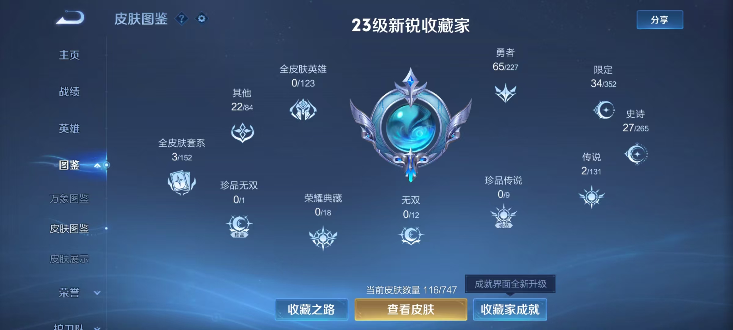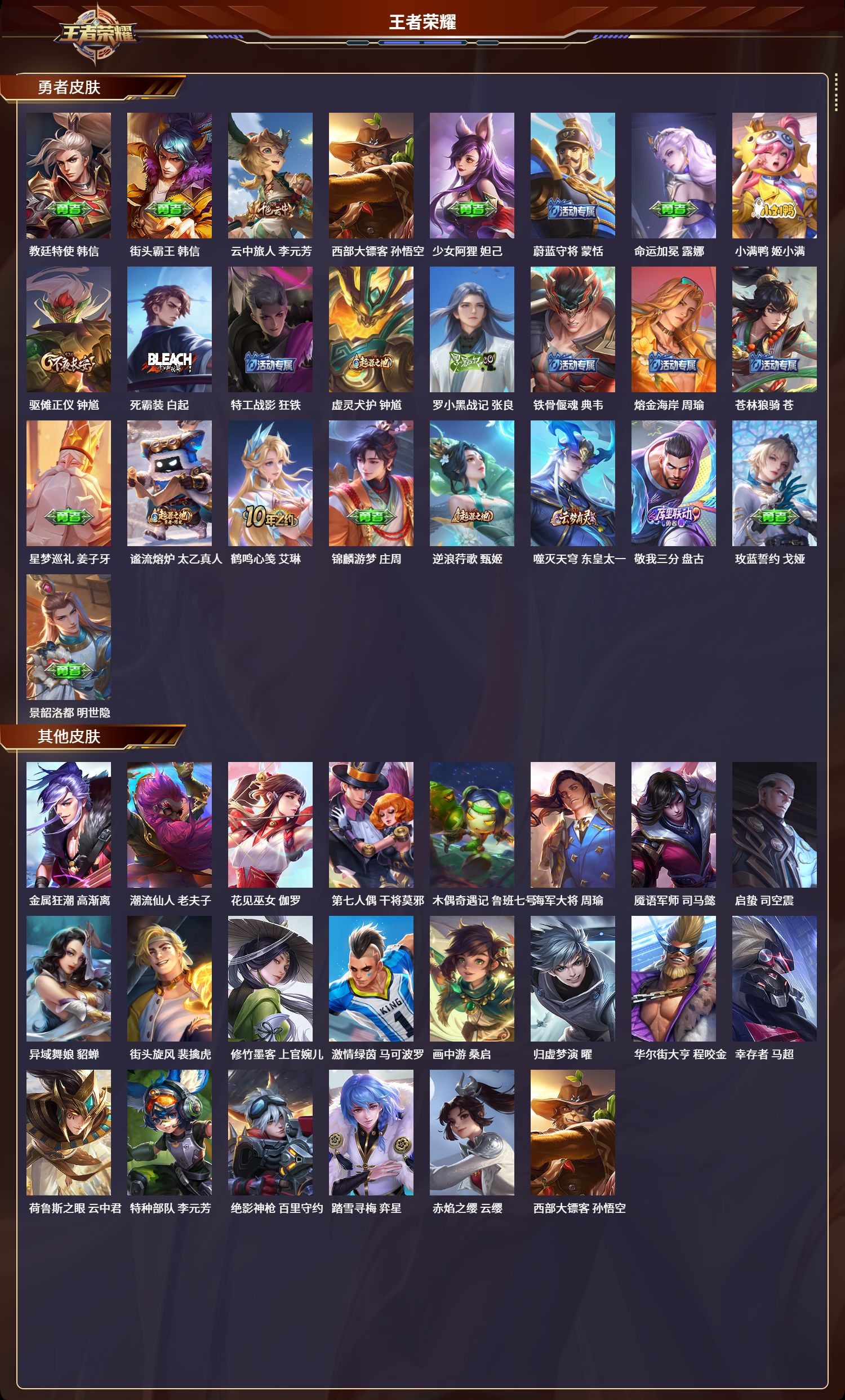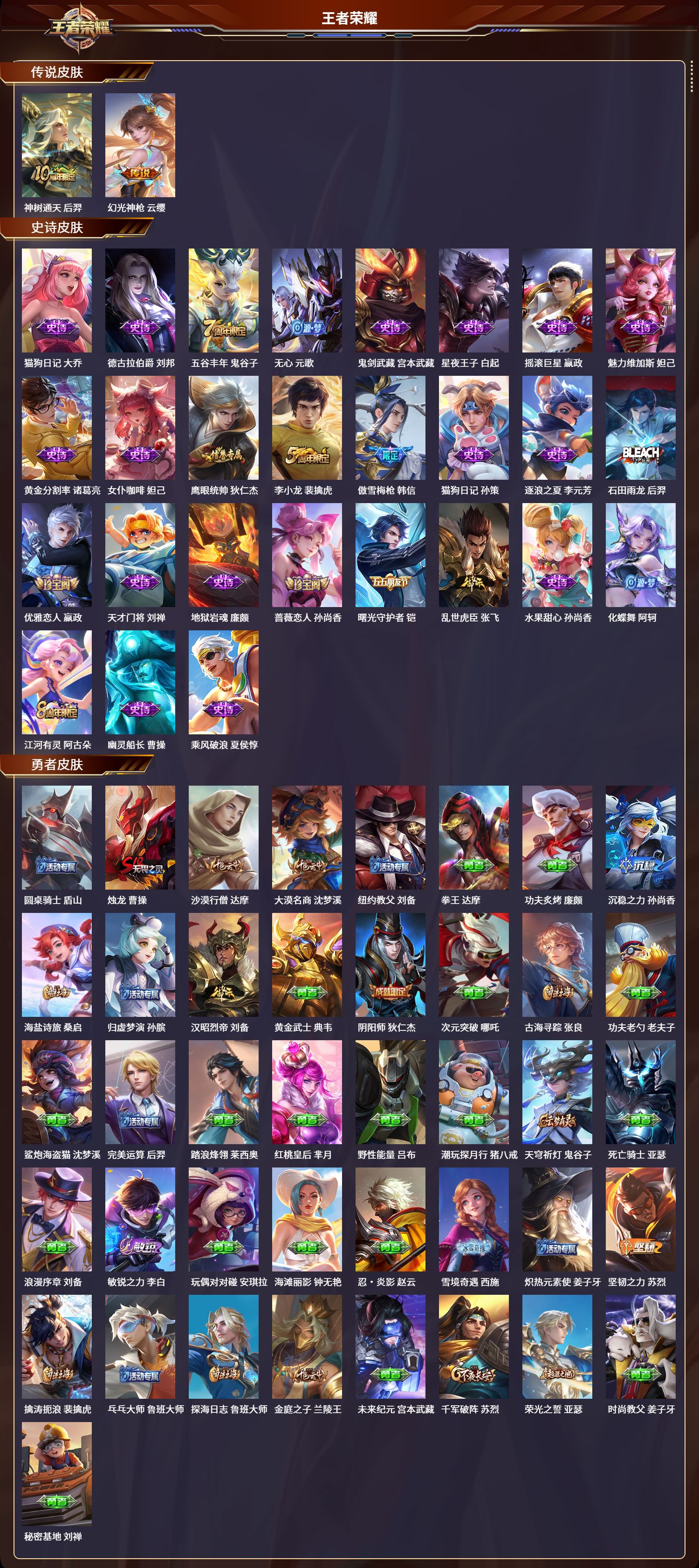 安卓qq/永恒钻石/116皮肤/122英雄/0典藏/0珍品无双/0无双/0珍品传说/2传说/27史诗/8稀有英雄【2 传说皮肤】神树通天 后羿幻光神呛 云缨【27 史诗皮肤】猫狗日记 大乔德古拉伯爵 刘邦五谷丰年 鬼谷子无心 元歌鬼剑武藏 宫本武藏星夜王子 白起摇滚巨星 嬴政魅力维加斯 妲己黄金分割率 诸葛亮女仆咖啡 妲己鹰眼统帅 狄仁杰李小龙 裴擒虎傲雪梅呛 韩信猫