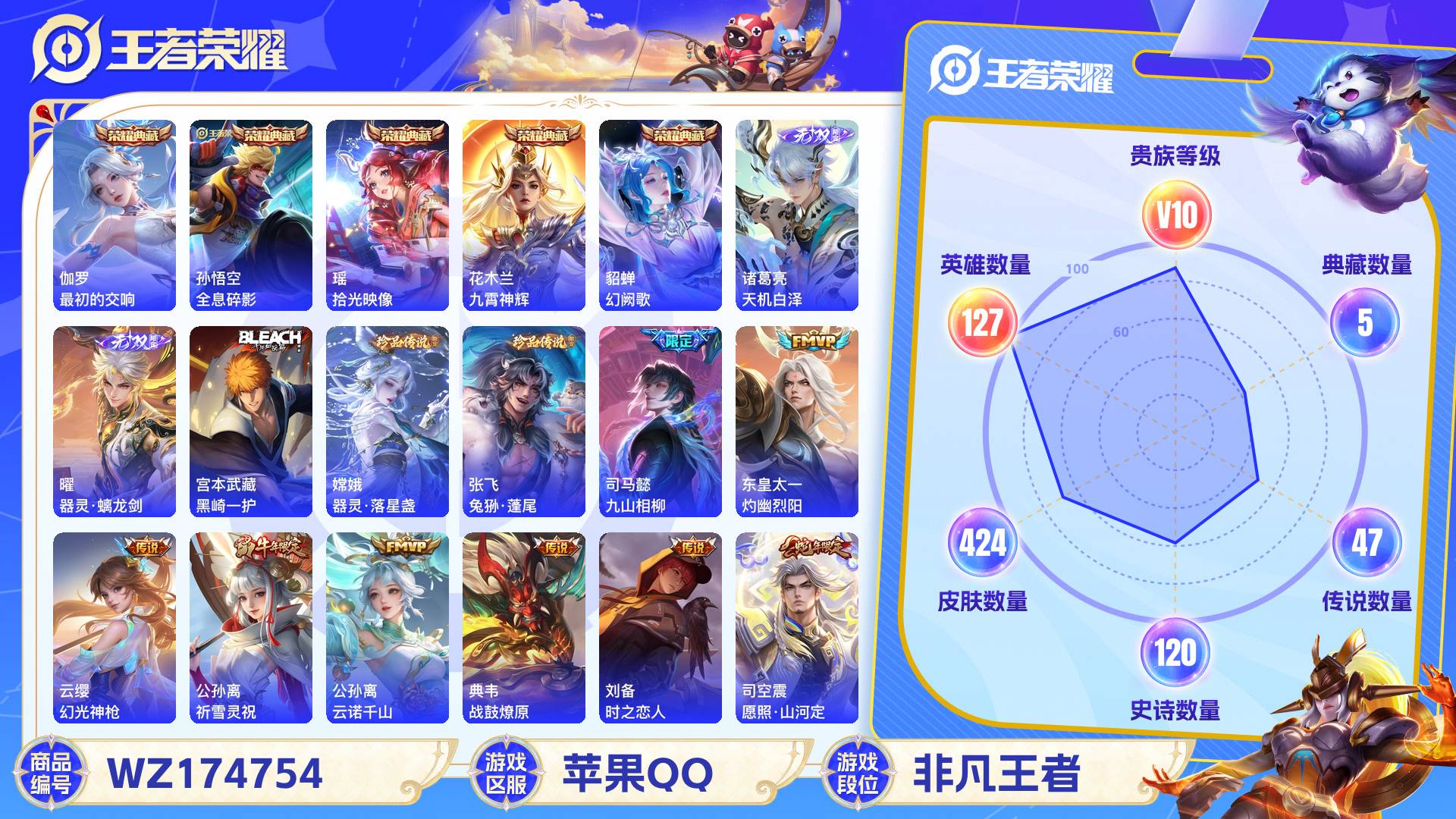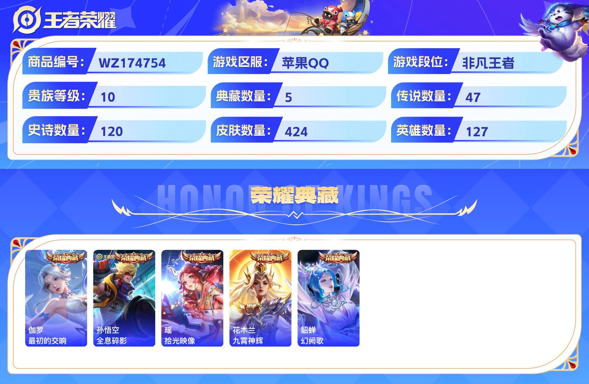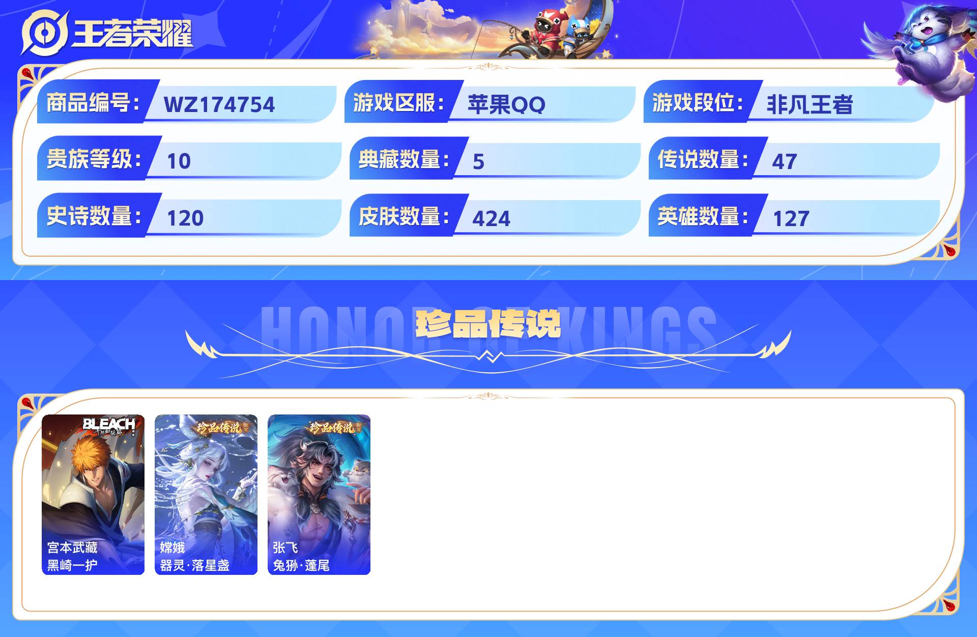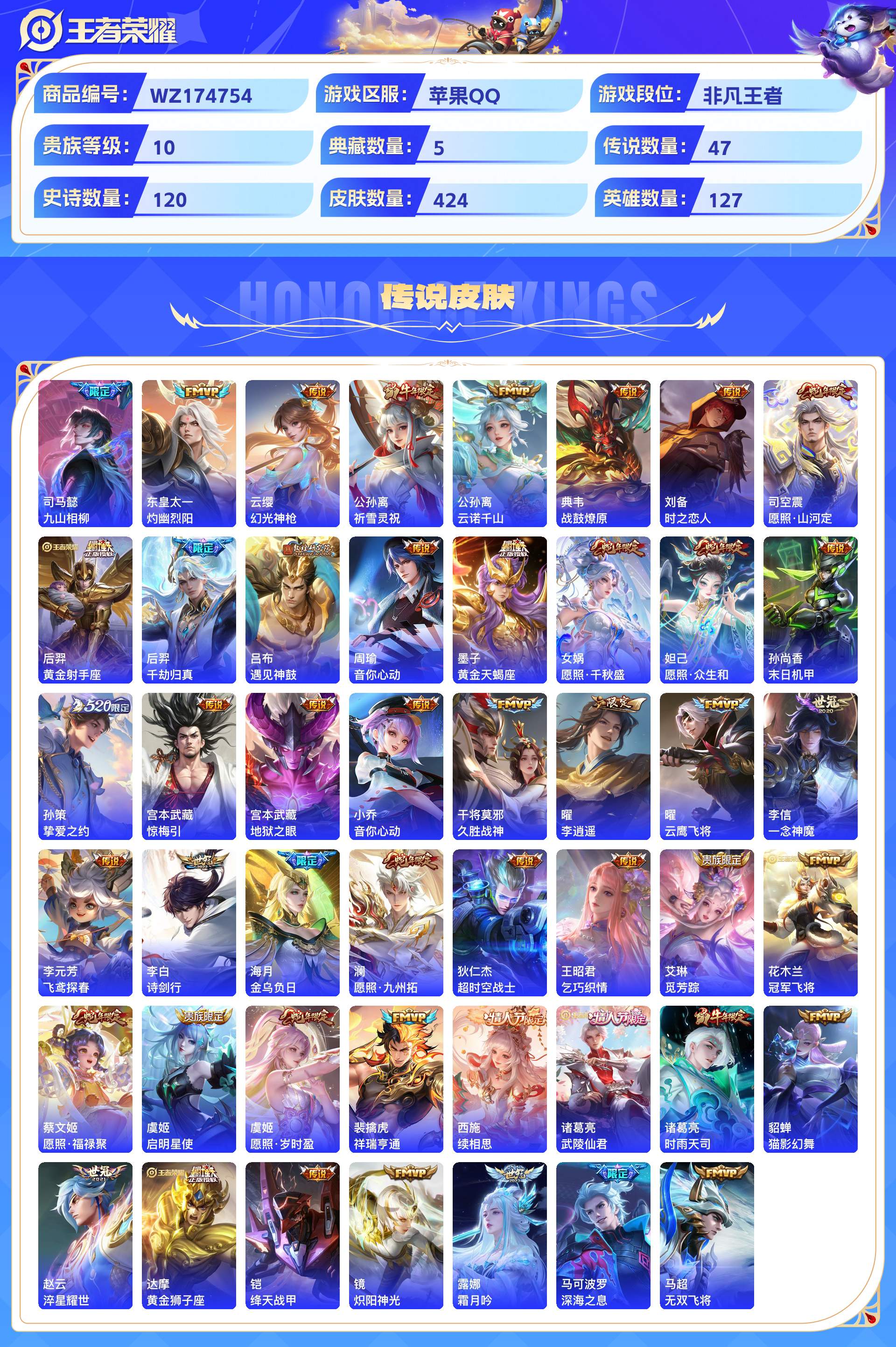 2253485-苹果qq 424皮 贵族10级 5典藏 3珍品传说 2无双 47传说 120史诗【荣耀典藏】最初的交响全息碎影拾光映像九霄神辉幻阙歌【珍品传说】黑崎一护器灵·落星盏兔狲·蓬尾【无双限定】天机白泽器灵·螭龙剑【传说皮肤】九山相柳灼幽烈阳幻光神呛祈雪灵祝云诺千山战鼓燎原时之恋人愿照·山河定黄金射手座千劫归真遇见神鼓音你心动黄金天蝎座愿照·千