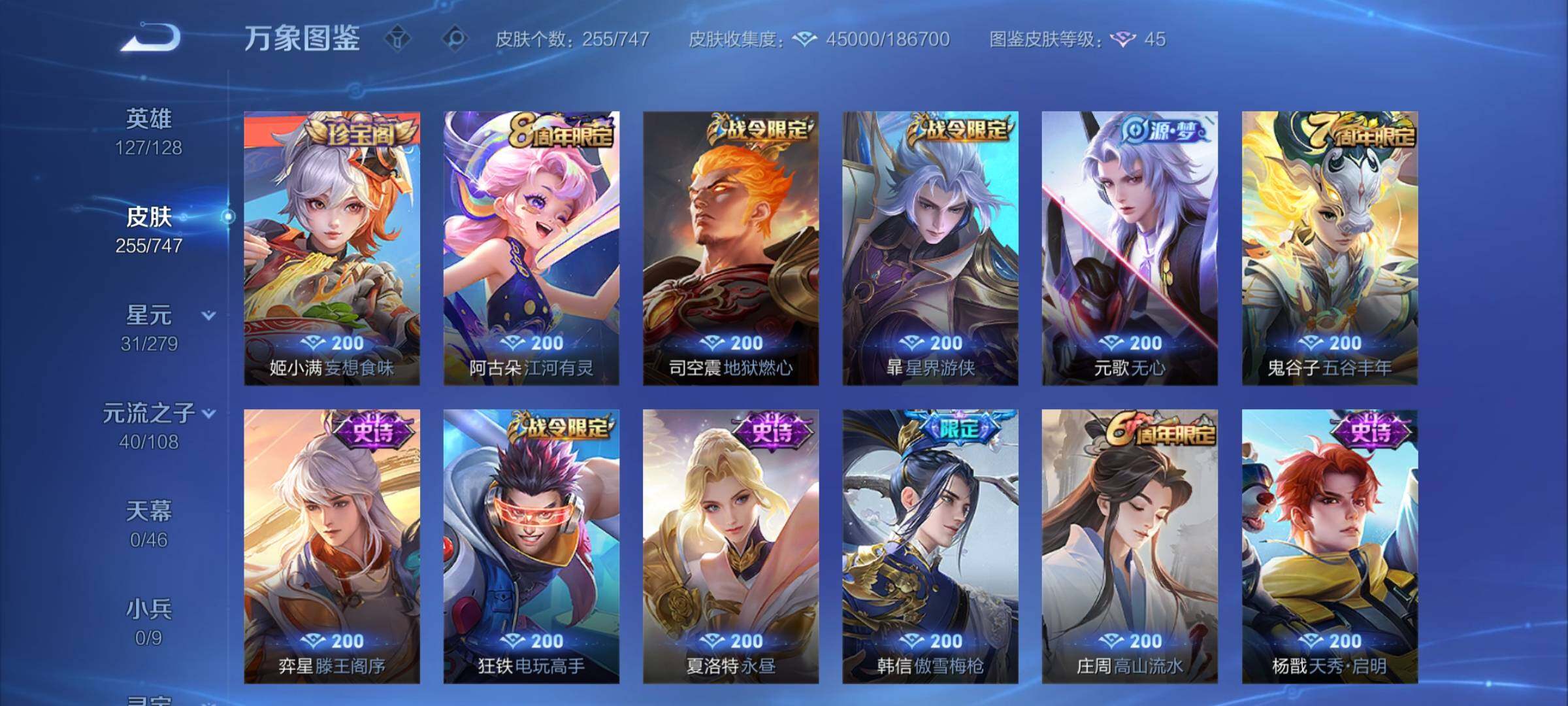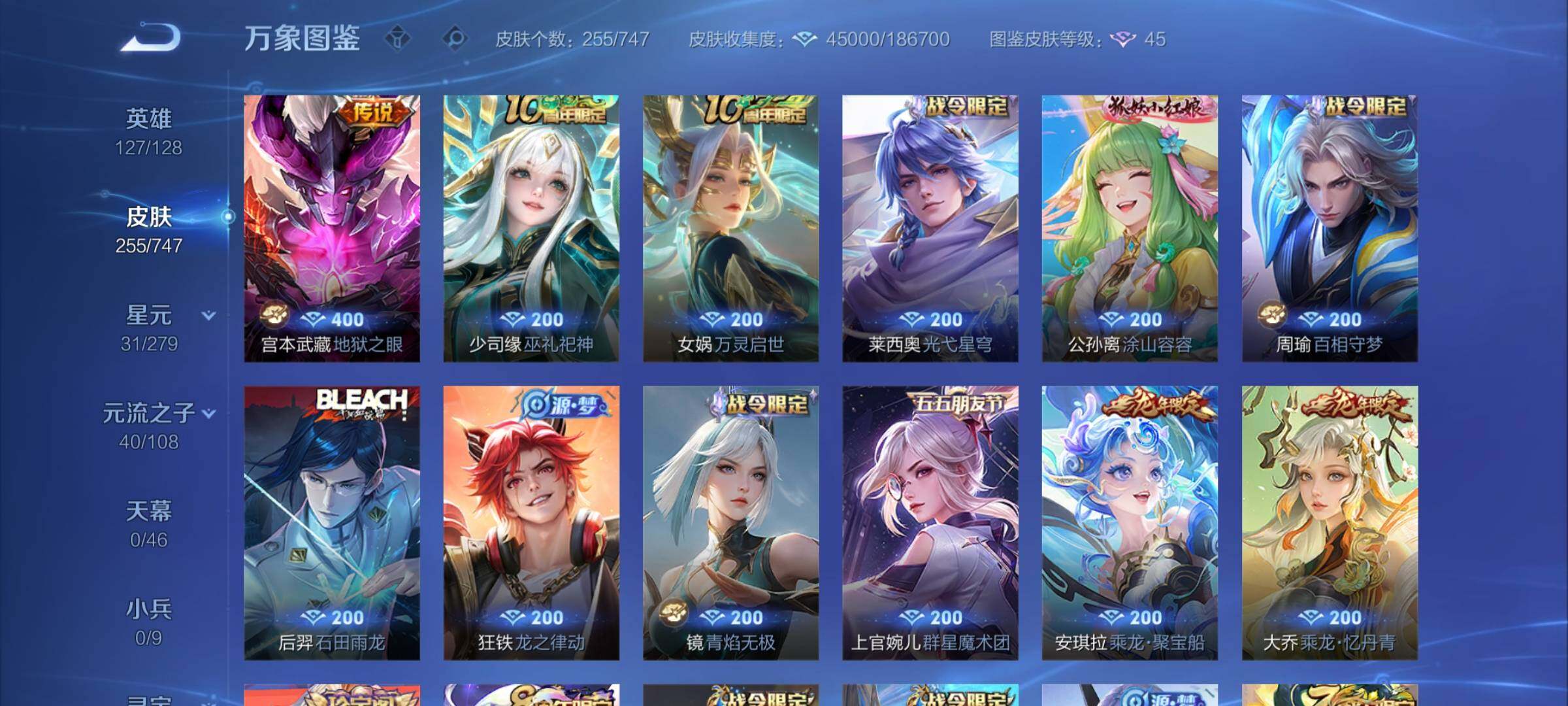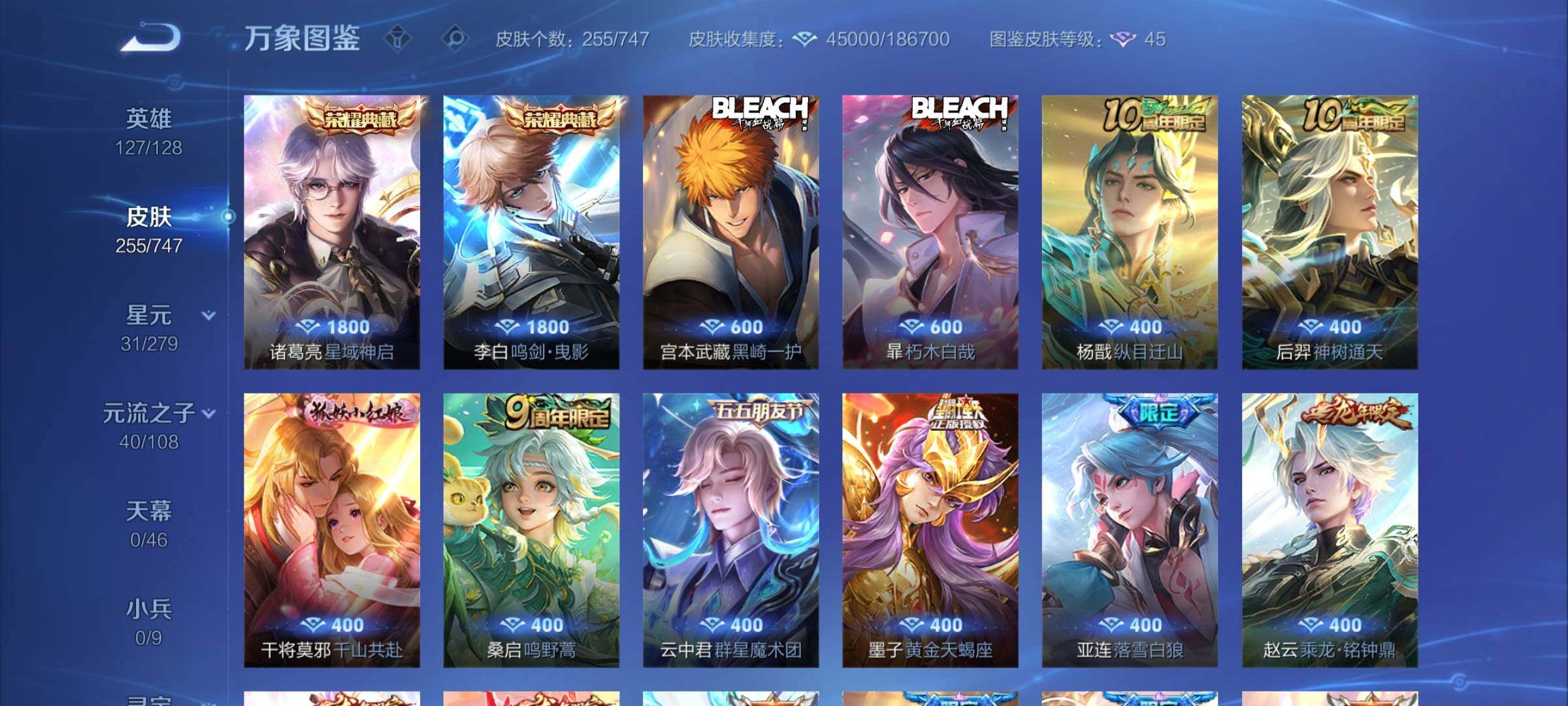 【店铺主推·精品质量v8·娜可露露全皮·橘右京全皮·满龙年限定·朽木白哉·黑崎一护·鸣剑曳影·星域神启·李·寅虎赤拳·纵目迁山·神树通天·千山共赴·群星魔术团 ·黄金天蝎座·落雪白狼·乘龙问璇玑·乘龙淬吴钩·乘龙铭钟鼎·时雨天司·可二次】w7343-安卓q-127英雄-255皮肤-9王者印记-300铭文-贵族积分9w【贵族8】【2典藏·2珍品传说·1星传说·33传说·18按键】【因赛季