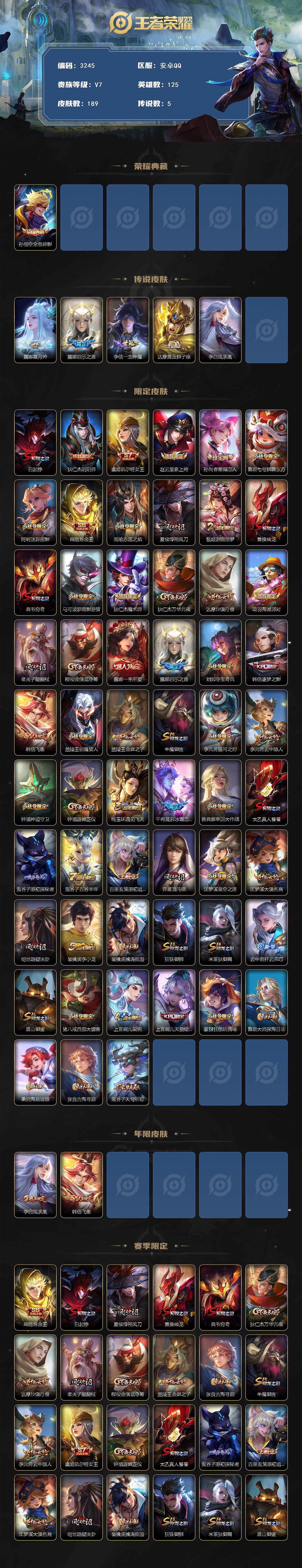 [14360366]安卓q-v0-永恒钻石ii段位-125英雄-189皮肤-1典藏皮肤-5传说-39史诗 【荣耀典藏】:孙悟空全息碎影 【传说皮肤】:露娜霜月吟,露娜启示之音,李信一念神魔,达摩黄金狮子座,李白凤求凰 【限定皮肤】:白起狰,狄仁杰阴阳师,虞姬凯尔特女王,赵云皇家上将,孙尚香蔷薇恋人,鲁班七号狮舞东方,阿轲迷踪丽影,扁鹊炼金王,周瑜赤莲之焰,夏侯惇朔风刀,甄姬游园惊梦,曹操烛龙,典韦穷奇,马可波罗暗影游猎,狄仁杰魔术师,狄仁杰万华元夜,达摩沙漠行僧,项羽海滩派对,老夫子醍醐杖,程咬金演武夺筹,露娜一生所爱,露娜启示之音,刘邦夺宝奇兵,韩信逐梦之影,韩信飞衡,兰陵王驯魔猎人,兰陵王金庭之子,牛魔御旌,李元芳银河之约,李元芳云中旅人,钟馗神迹守卫,钟馗驱傩正仪,杨玉环遇见飞天,干将莫邪冰霜恋舞曲,雅典娜单词大作战,太乙真人饕餮,鬼谷子原初探秘者,鬼谷子五谷丰年,百里玄策原初追逐者,弈星混沌棋,沈梦溪星空之诺,沈梦溪大漠名商,明世隐疑决卦,裴擒虎李小龙,裴擒虎擒涛扼浪,狂铁御狮,米莱狄御霄,云中君纤云弄巧,盾山御銮,猪八戒西部大镖客,上官婉儿梁祝,上官婉儿天狼绘梦者,蒙犽狂想玩偶喵,鲁班大师探海日志,桑启海盐诗旅,张良古海寻踪,鬼谷子天穹祈灯 【年限皮肤】:李白凤求凰,韩信飞衡 【赛季限定】:扁鹊炼金王,白起狰,夏侯惇朔风刀,曹操烛龙,典韦穷奇,狄仁杰万华元夜,达摩沙漠行僧,老夫子醍醐杖,程咬金演武夺筹,兰陵王金庭之子,张良古海寻踪,牛魔御旌,李元芳云中旅人,虞姬凯尔特女王,钟馗驱傩正仪,太乙真人饕餮,鬼谷子原初探秘者,百里玄策原初追逐者,弈星混沌棋,沈梦溪大漠名商,明世隐疑决卦,裴擒虎擒涛扼浪,狂铁御狮,米莱狄御霄,盾山御銮,鲁班大师探海日志,桑启海盐诗旅,鬼谷子天穹祈灯 【战令限定】:鲁班七号狮舞东方,阿轲迷踪丽影,周瑜赤莲之焰,马可波罗暗影游猎,刘邦夺宝奇兵,兰陵王驯魔猎人,李元芳银河之约,钟馗神迹守卫,雅典娜单词大作战,沈梦溪星空之诺,猪八戒西部大镖客,蒙犽狂想玩偶喵 【史诗皮肤】:露娜紫霞仙子,赵云皇家上将,貂蝉圣诞恋歌,甄姬冰雪圆舞曲,王昭君偶像歌手,狄仁杰魔术师,宫本武藏鬼剑武藏,孙尚香蔷薇恋人,孙尚香水果甜心,妲己魅力维加斯,吕布圣诞狂欢,刘禅绅士熊喵,李白千年之狐,韩信逐梦之影,甄姬游园惊梦,百里守约特工魅影,蔡文姬舞动绿茵,刘禅天才门将,程咬金功夫厨神,白