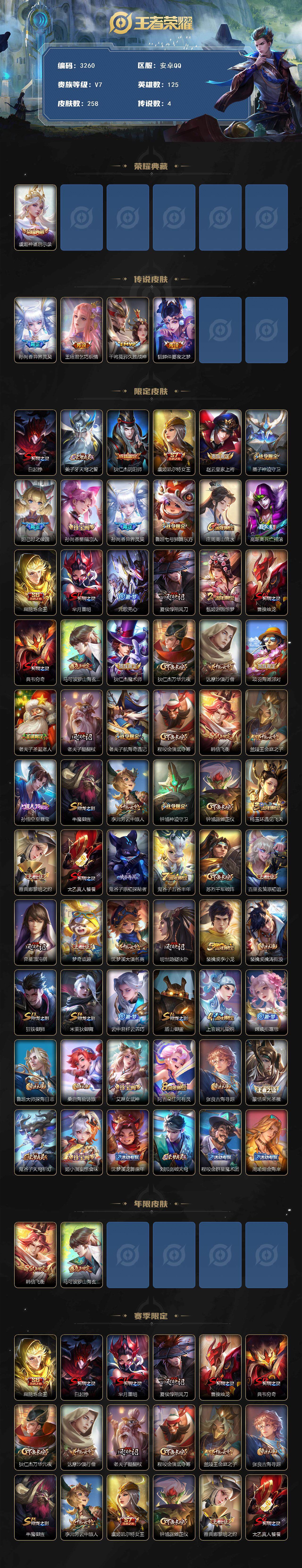 [14361199]安卓q-v5-最强王者段位-125英雄-258皮肤-1典藏皮肤-4传说-65史诗 【荣耀典藏】:虞姬神鉴启示录 【传说皮肤】:孙尚香异界灵契,王昭君乞巧织情,干将莫邪久胜战神,貂蝉仲夏夜之梦 【限定皮肤】:白起狰,姜子牙天穹之誓,狄仁杰阴阳师,虞姬凯尔特女王,赵云皇家上将,墨子神迹守卫,妲己时之彼端,孙尚香蔷薇恋人,孙尚香异界灵契,鲁班七号狮舞东方,庄周高山流水,高渐离死亡摇滚,扁鹊炼金王,芈月重明,元歌无心,夏侯惇朔风刀,甄姬游园惊梦,曹操烛龙,典韦穷奇,马可波罗山海玄木吟,狄仁杰魔术师,狄仁杰万华元夜,达摩沙漠行僧,项羽海滩派对,老夫子圣诞老人,老夫子醍醐杖,老夫子航海奇遇记,程咬金演武夺筹,韩信飞衡,兰陵王金庭之子,孙悟空至尊宝,牛魔御旌,李元芳云中旅人,钟馗神迹守卫,钟馗驱傩正仪,杨玉环遇见飞天,雅典娜黎明之约,太乙真人饕餮,鬼谷子原初探秘者,鬼谷子五谷丰年,苏烈千军破阵,百里玄策原初追逐者,弈星混沌棋,梦奇顽趣,沈梦溪大漠名商,明世隐疑决卦,裴擒虎李小龙,裴擒虎擒涛扼浪,狂铁御狮,米莱狄御霄,云中君纤云弄巧,盾山御銮,上官婉儿梁祝,嫦娥拒霜思,鲁班大师探海日志,桑启海盐诗旅,艾琳女武神,阿古朵江河有灵,张良古海寻踪,蒙恬荣光圣徽,鬼谷子天穹祈灯,姬小满妄想食味,沈梦溪龙舞盛年,刘邦剑破天穹,程咬金群星魔术团,周瑜熔金海岸 【年限皮肤】:韩信飞衡,马可波罗山海玄木吟 【赛季限定】:扁鹊炼金王,白起狰,芈月重明,夏侯惇朔风刀,曹操烛龙,典韦穷奇,狄仁杰万华元夜,达摩沙漠行僧,老夫子醍醐杖,程咬金演武夺筹,兰陵王金庭之子,张良古海寻踪,牛魔御旌,李元芳云中旅人,虞姬凯尔特女王,钟馗驱傩正仪,雅典娜黎明之约,太乙真人饕餮,鬼谷子原初探秘者,苏烈千军破阵,百里玄策原初追逐者,弈星混沌棋,梦奇顽趣,沈梦溪大漠名商,明世隐疑决卦,裴擒虎擒涛扼浪,狂铁御狮,米莱狄御霄,盾山御銮,鲁班大师探海日志,桑启海盐诗旅,鬼谷子天穹祈灯,蒙恬荣光圣徽,刘邦剑破天穹,姜子牙天穹之誓 【战令限定】:墨子神迹守卫,鲁班七号狮舞东方,老夫子航海奇遇记,钟馗神迹守卫 【史诗皮肤】:鲁班七号电玩小子,露娜紫霞仙子,阿轲暗夜猫娘,赵云皇家上将,赵云未来纪元,貂蝉圣诞恋歌,老夫子圣诞老人,甄姬冰雪圆舞曲,王昭君偶像歌手,狄仁杰魔术师,宫本武藏鬼剑武藏,孙尚香蔷薇恋人,孙尚香水果甜心,妲己魅力维加斯