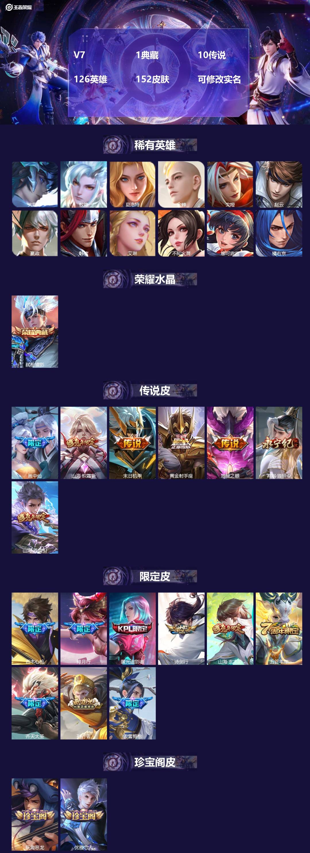 v7 1典藏 10传说 126英雄 152皮肤 可修改实名 【英雄全皮】:敖隐全皮影全皮 【稀有英雄】:敖隐小龙人大司命嬴政始皇帝韩信韩跳跳夏洛特夏师傅艾琳橘右京橘子娜可露露鸟人不知火舞赵云金蝉唐僧戈娅 【荣耀水晶】:弑呛猎影韩信典藏 【传说